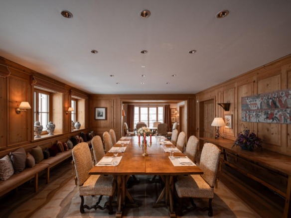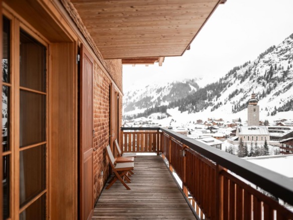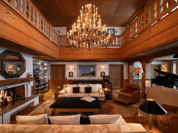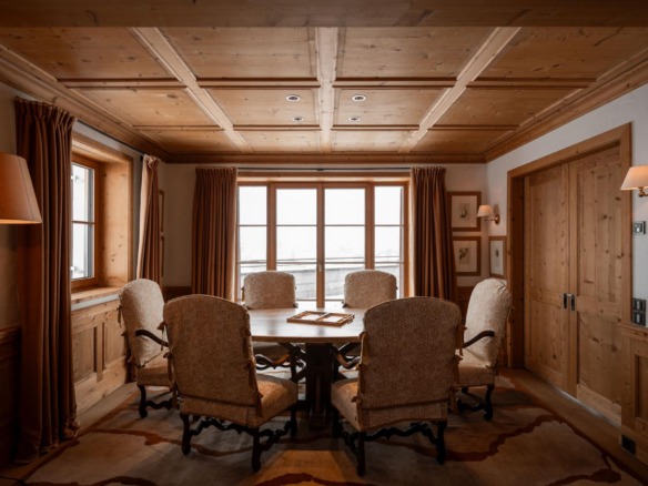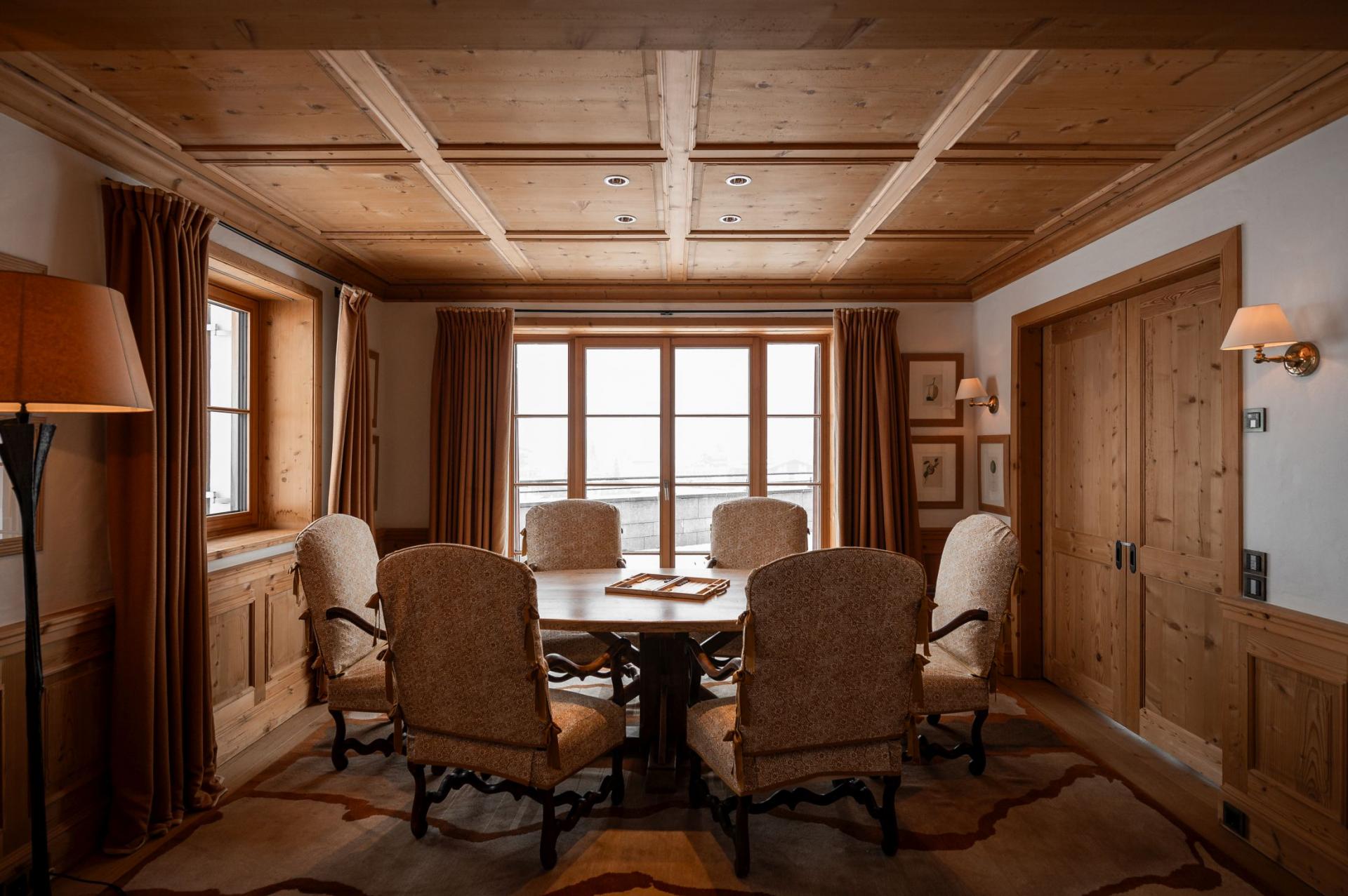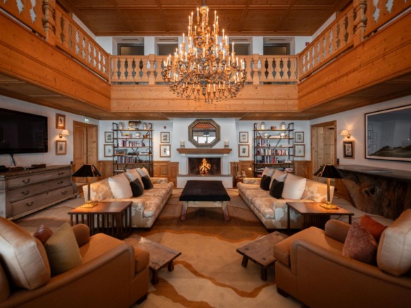 Design & Living Spaces The chalet’s grand main lounge is an architectural showpiece, defined by a soaring double-height ceiling and a striking chandelier that illuminates the room’s warm wooden tones. A mezzanine balcony encircles the space, creating an atmosphere of intimate grandeur. Antique details and traditional motifs harmonize with plush, patterned furnishings and bold accents, producing an aesthetic that is both distinctive and sophisticated. The adjoining dining area, adorned with fine woodwork and characterful alpine textures, sets the stage for memorable evenings shared over gourmet cuisine. Expansive sun terraces open directly onto the pistes, offering captivating views across Lech and its surrounding peaks.