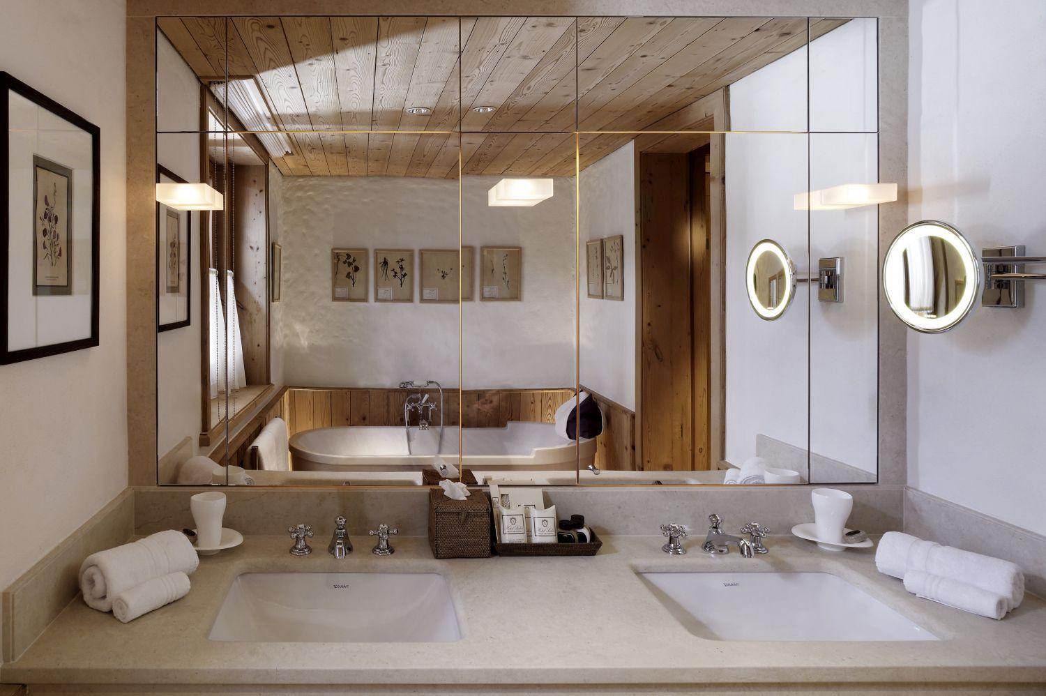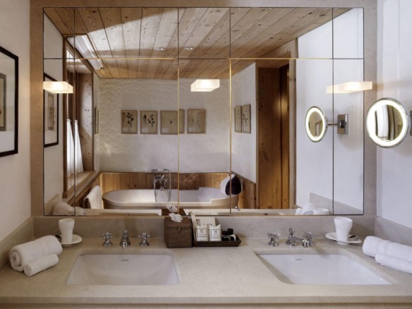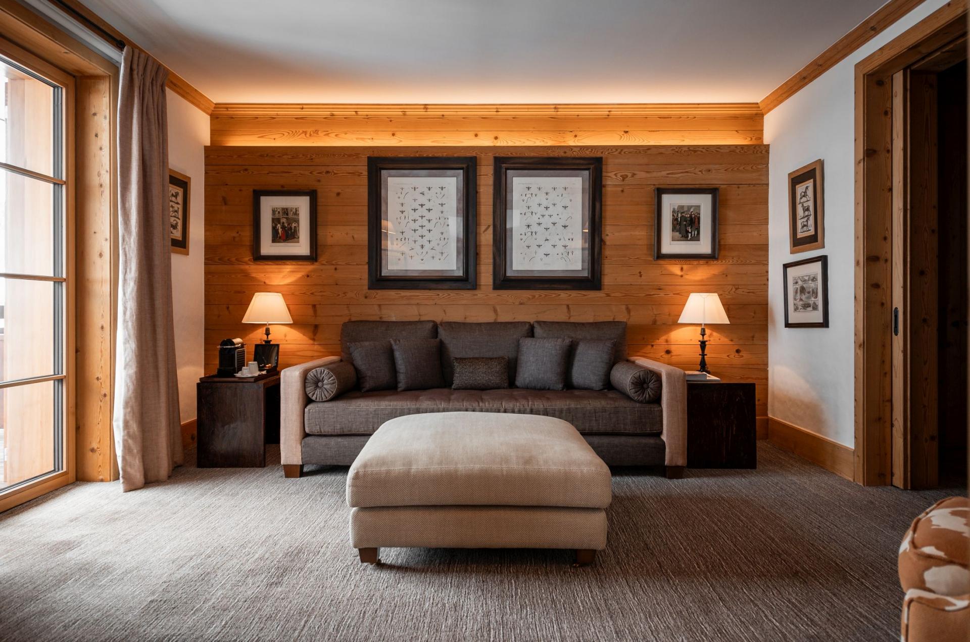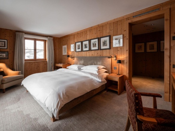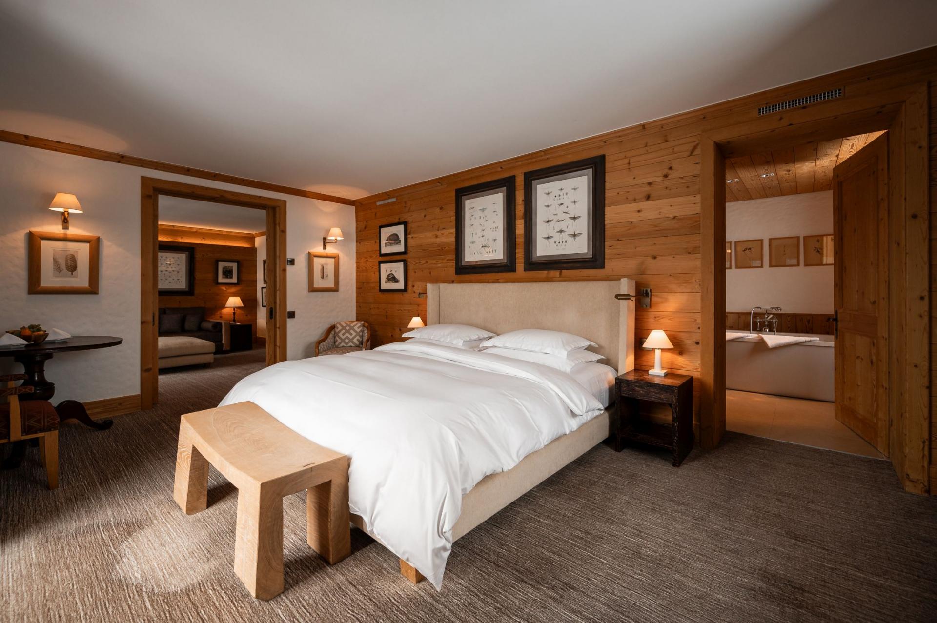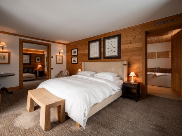 Bedrooms & Suites Aurelio Club Chalet welcomes up to sixteen guests across eight refined en-suite bedrooms. Six are spacious double rooms of around 42m², while two premier suites offer double the space, complete with private lounges for added exclusivity. Each bedroom captures a sense of timeless alpine comfort, featuring natural wood finishes, elegant details, and luxurious en-suite bathrooms with rainfall showers and twin vanities. Select rooms also enjoy private balconies overlooking the mountains.