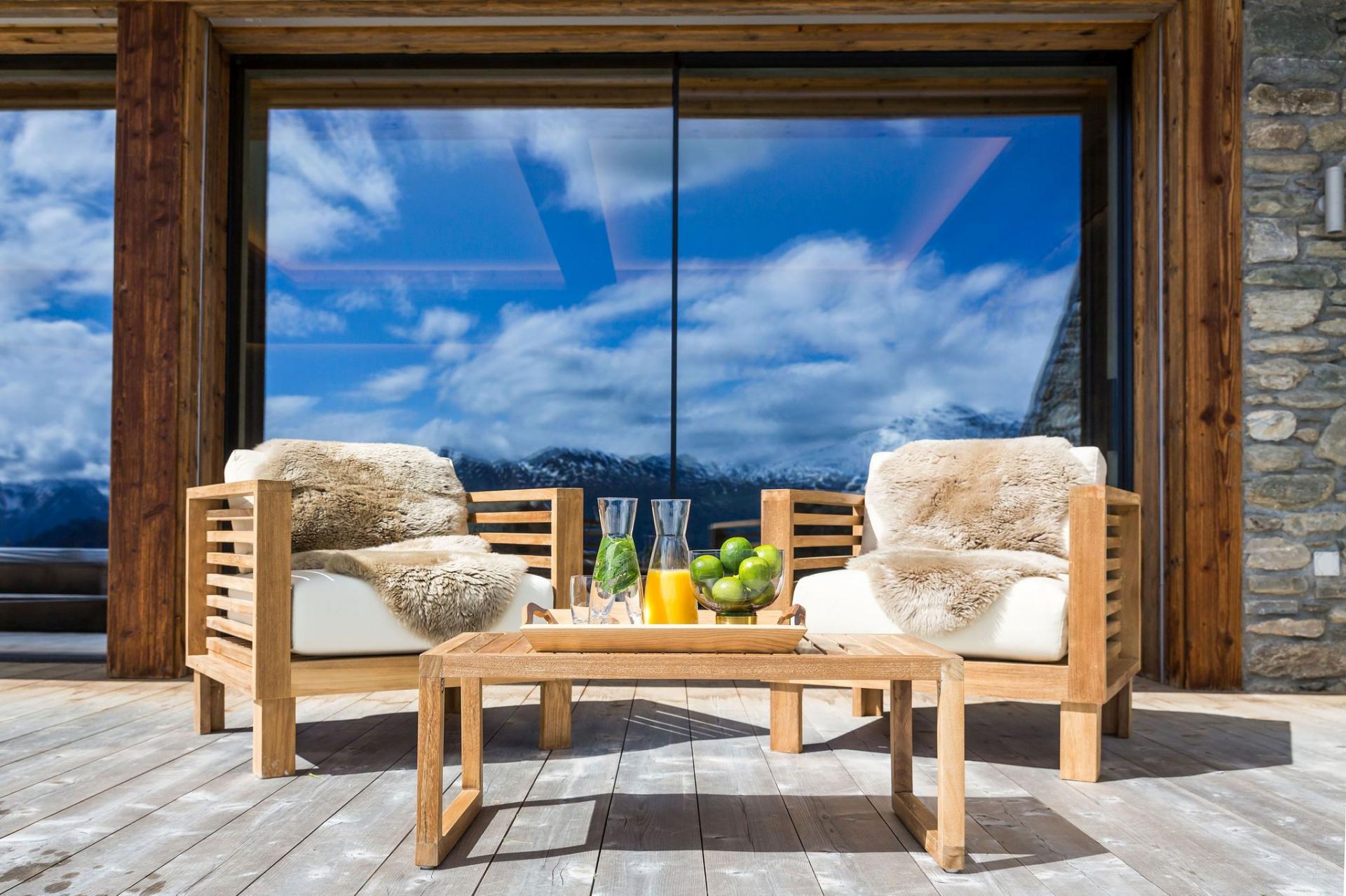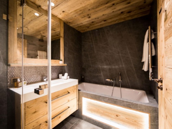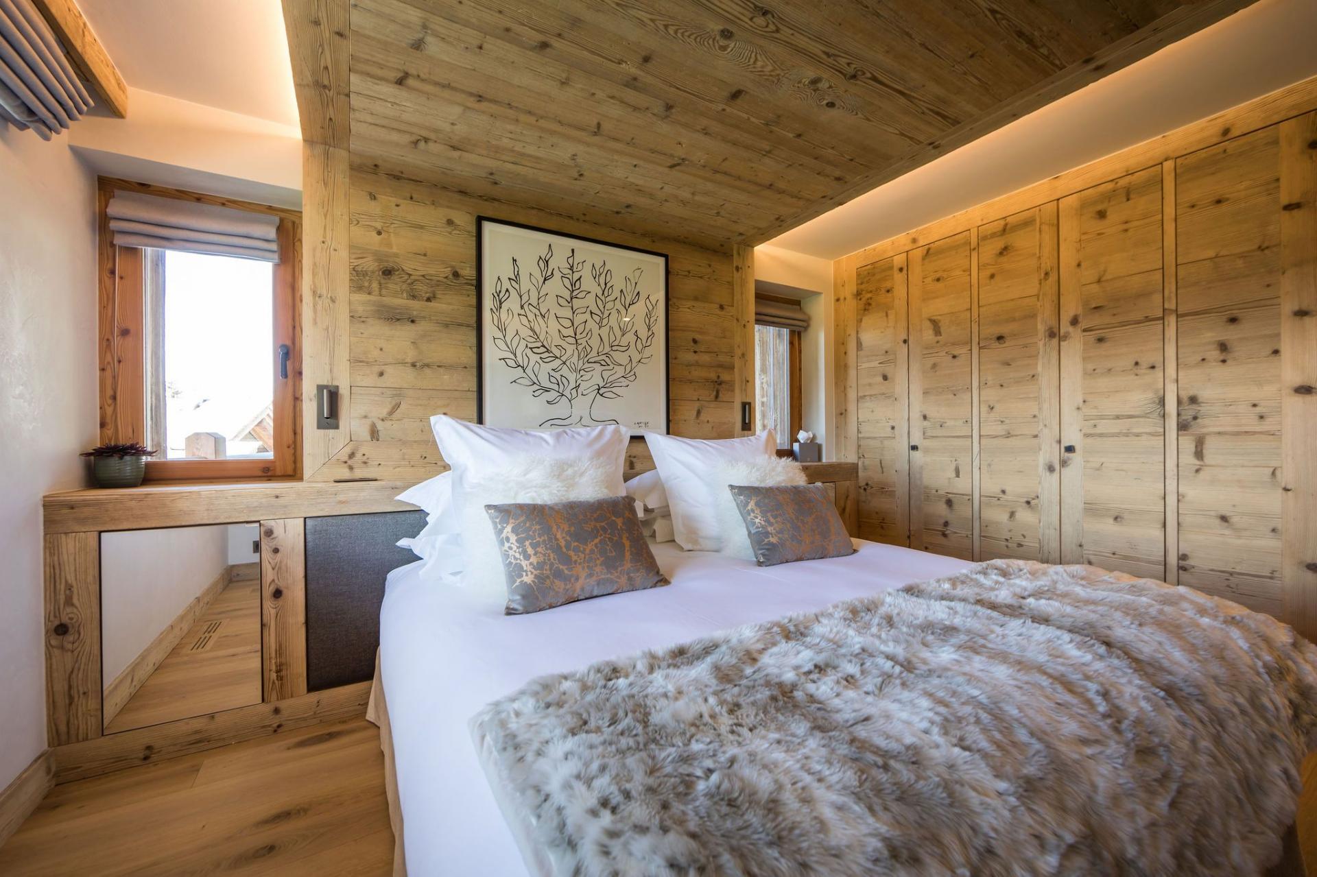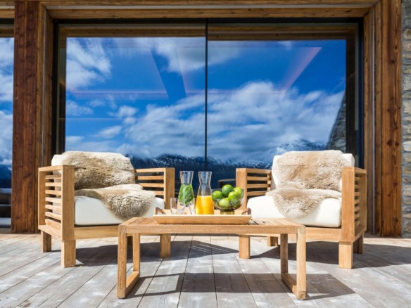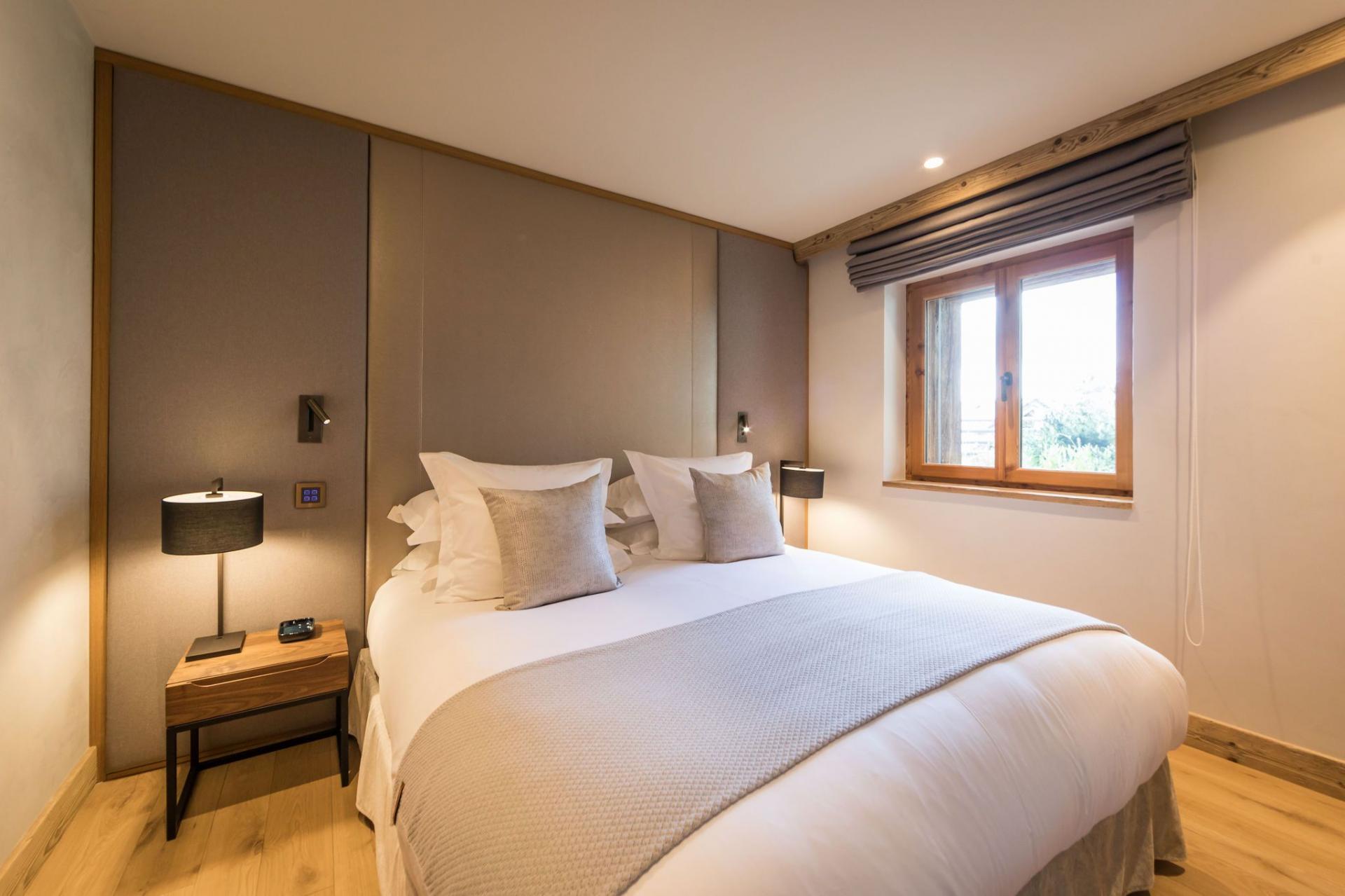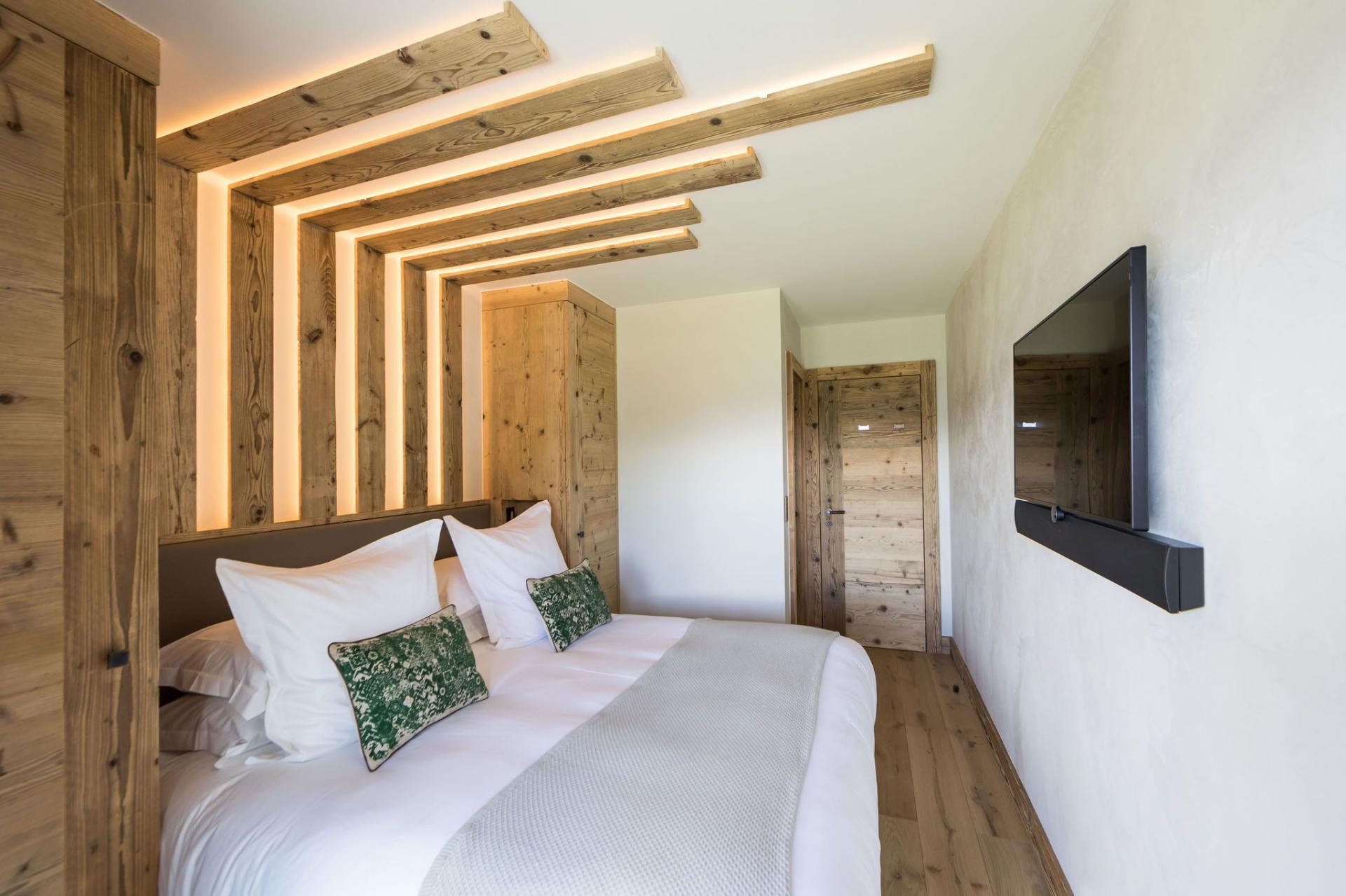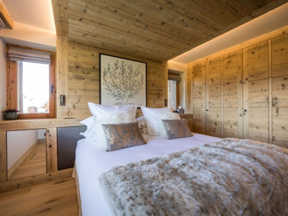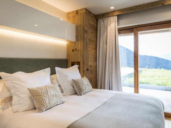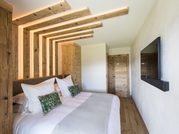 All four en-suite bedrooms are located on the first floor, styled in soft alpine tones and light woods, with luxurious finishes throughout. Two suites offer direct access to the terrace, and two can be arranged as twin rooms, making the layout ideal for families or groups.