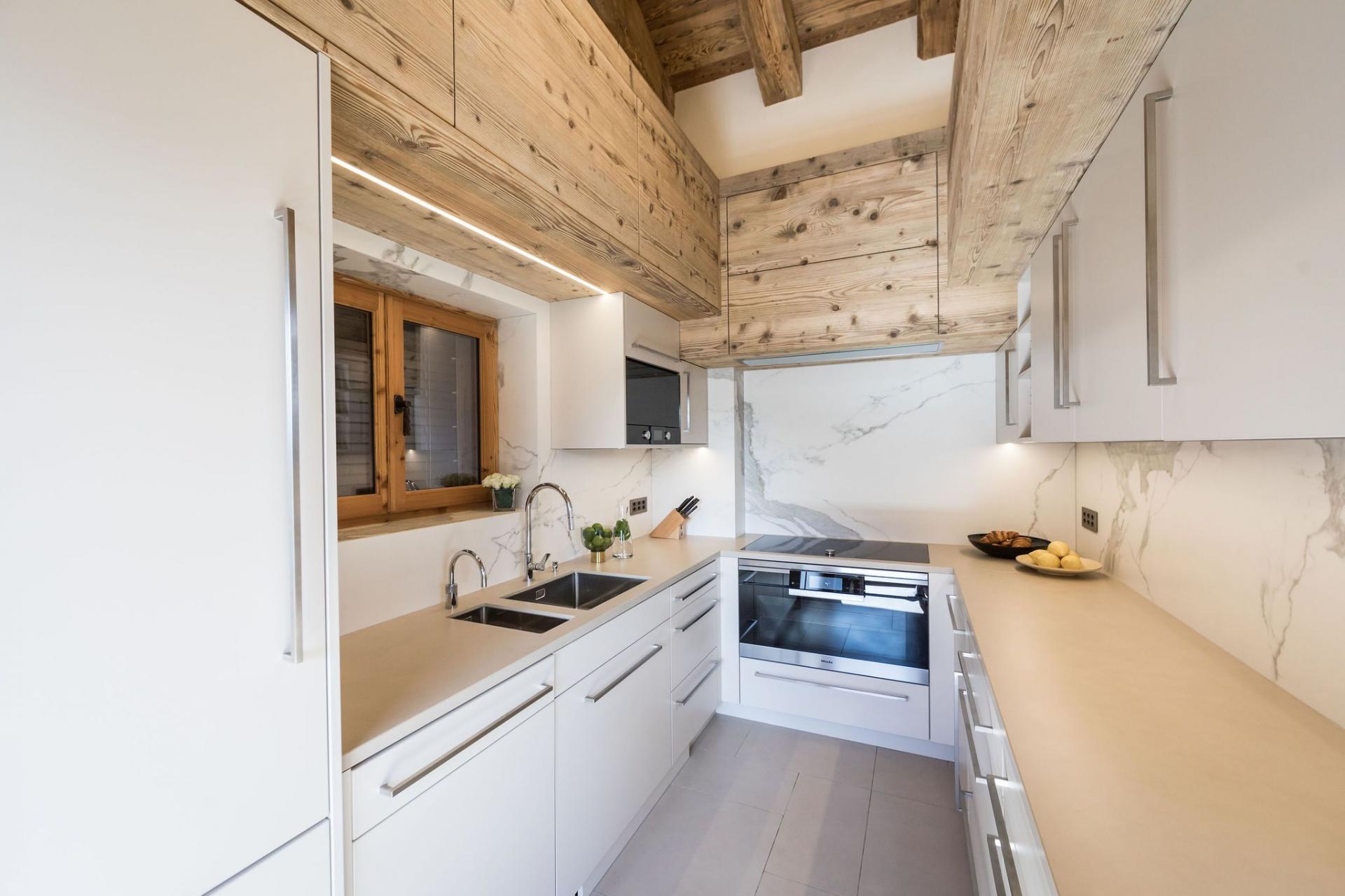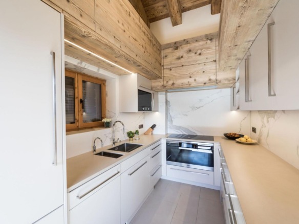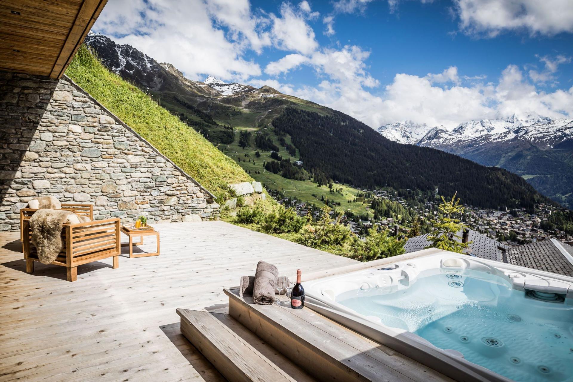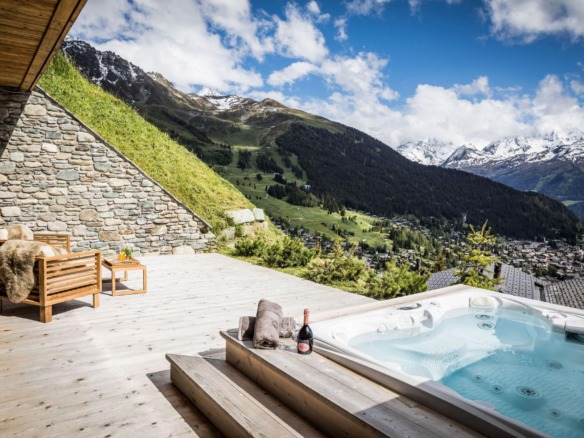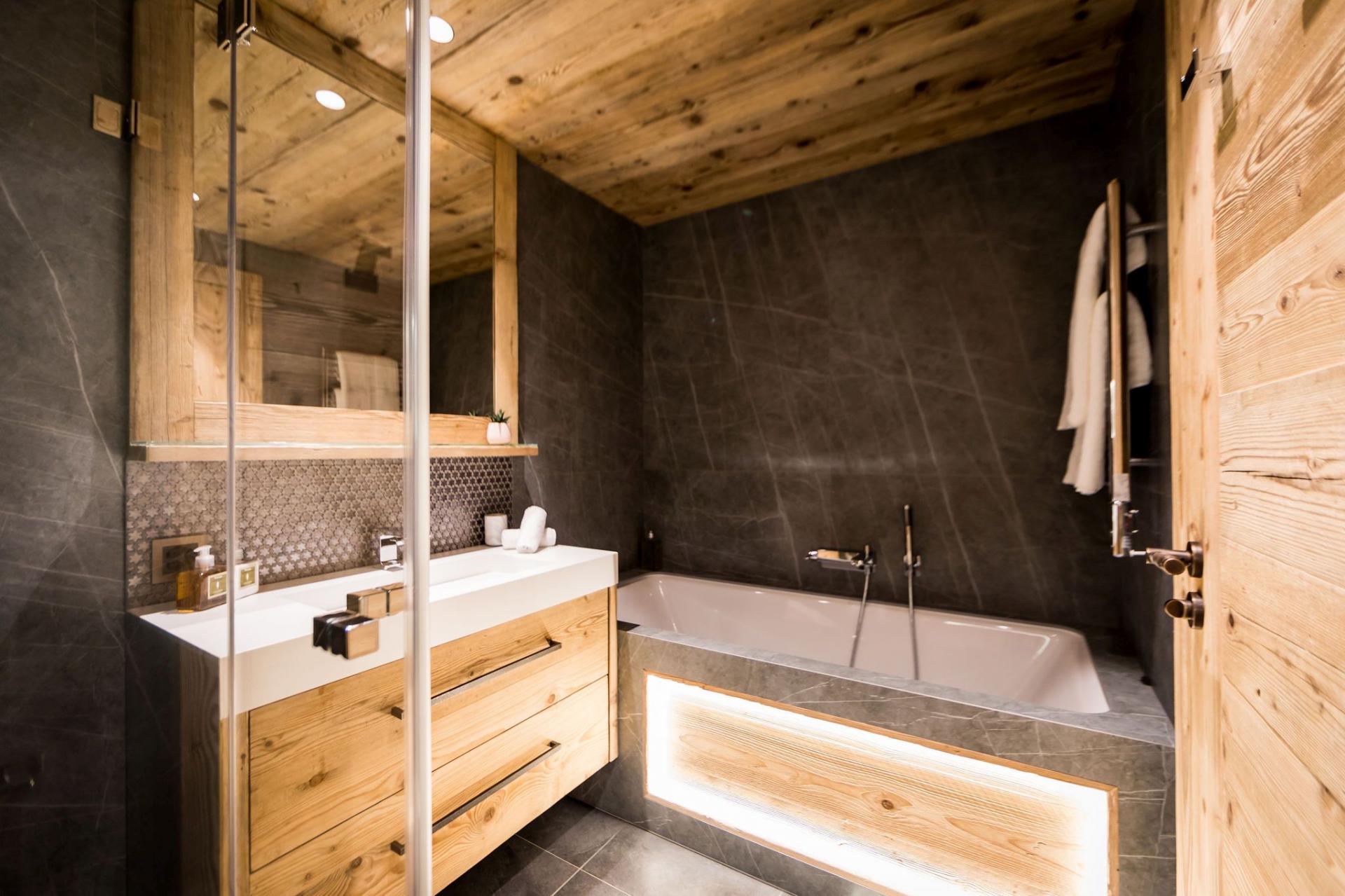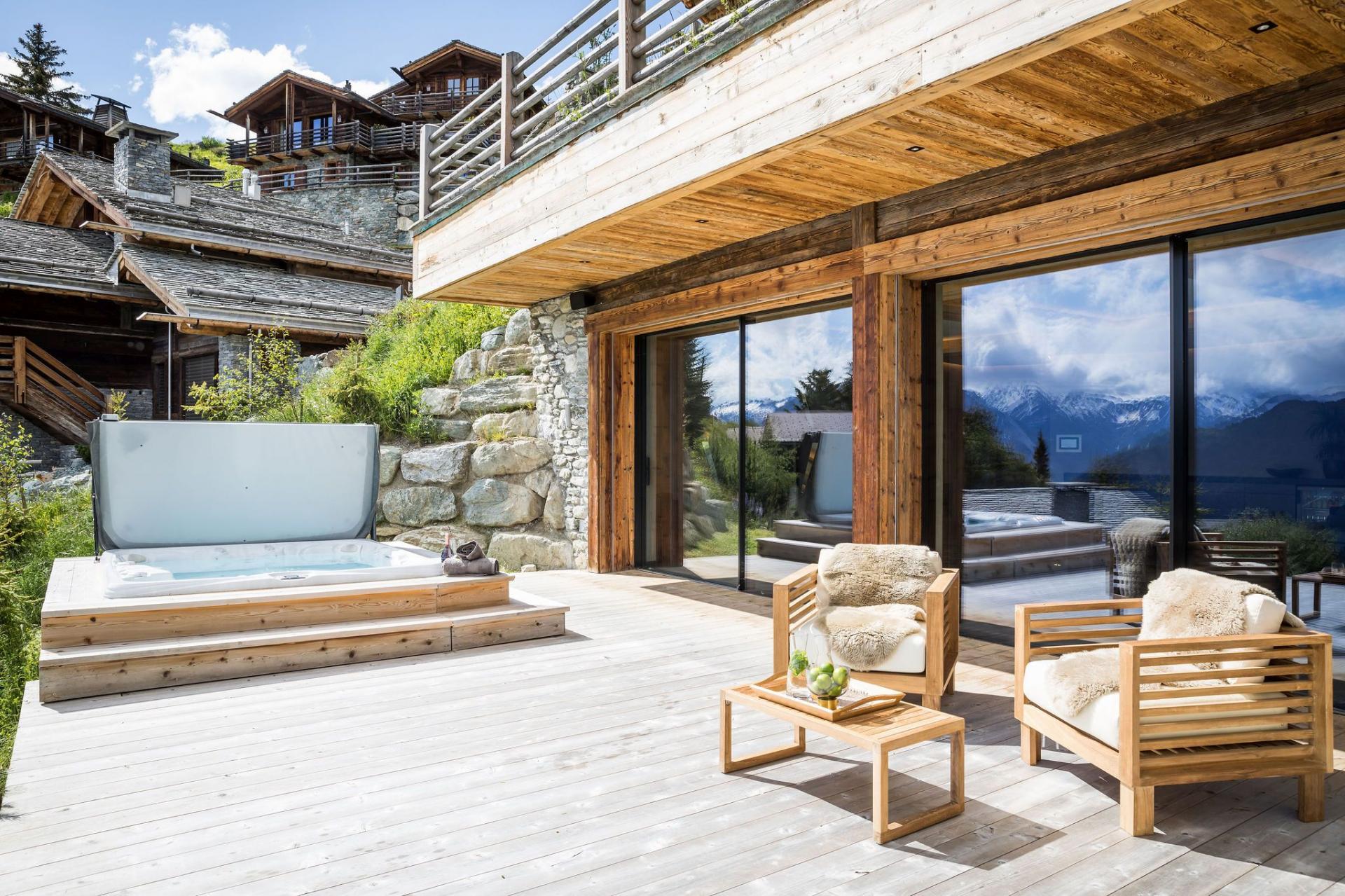 All four en-suite bedrooms are located on the first floor, styled in soft alpine tones and light woods, with luxurious finishes throughout. Two suites offer direct access to the terrace, and two can be arranged as twin rooms, making the layout ideal for families or groups.