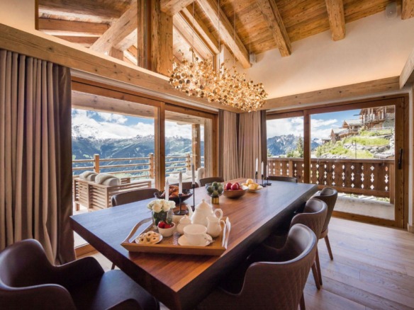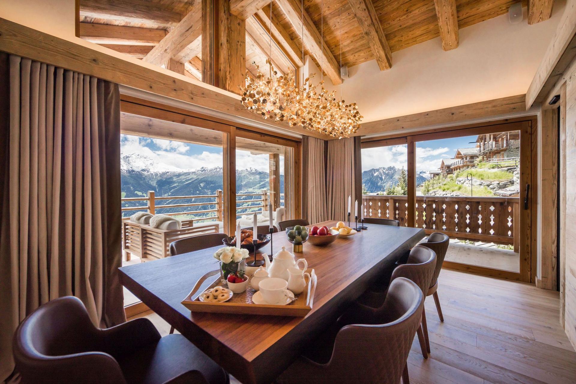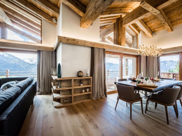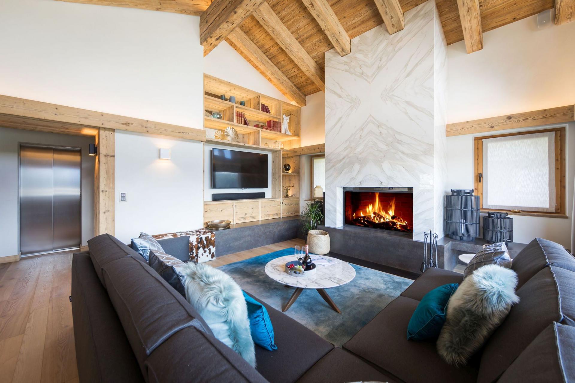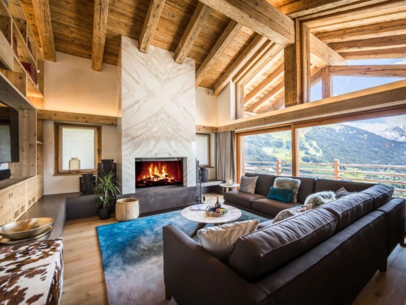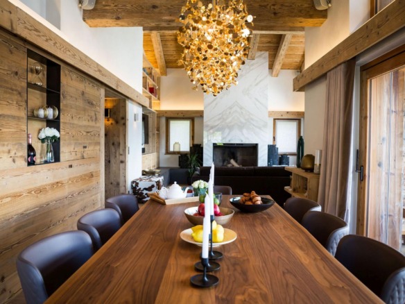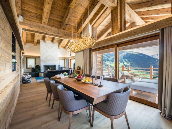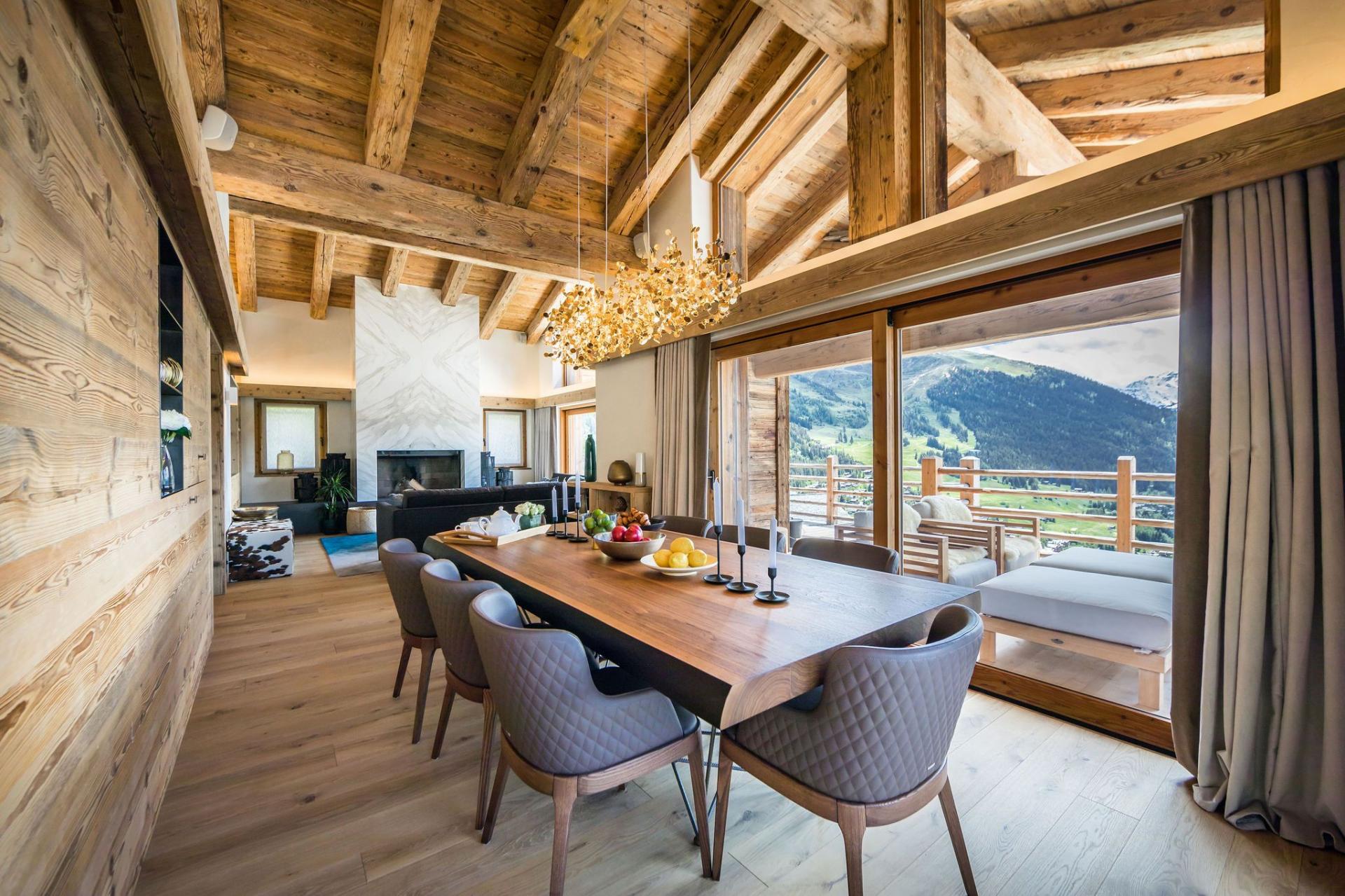 The top level is home to the main living space—an open-plan lounge and dining area bathed in natural light from expansive picture windows. Vaulted ceilings add height and grandeur, while natural materials and contemporary furnishings create a calm, sophisticated atmosphere. A marble fireplace anchors the lounge, while the dining area features warm golden lighting that complements the chalet’s stylish character.