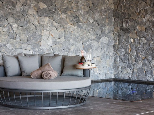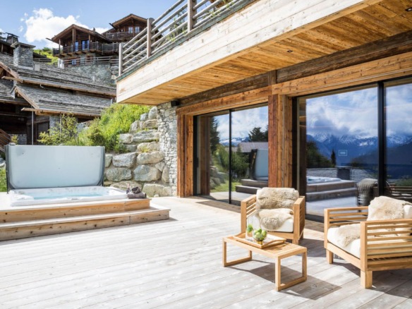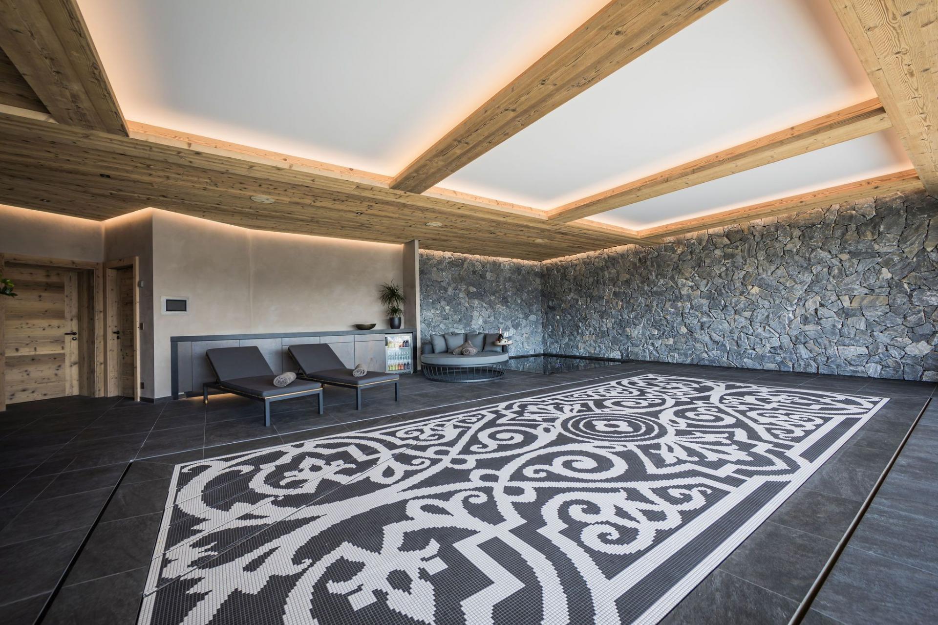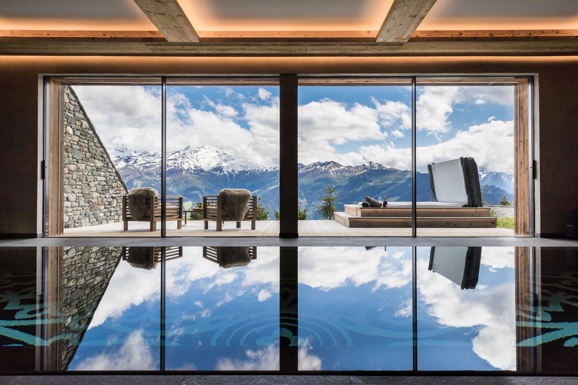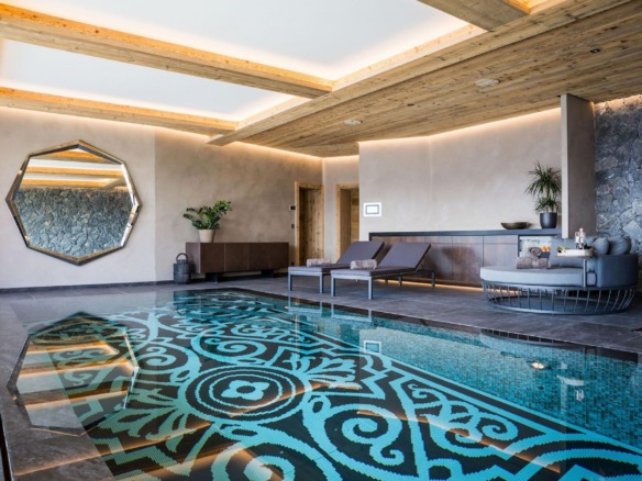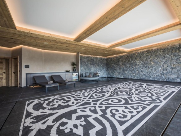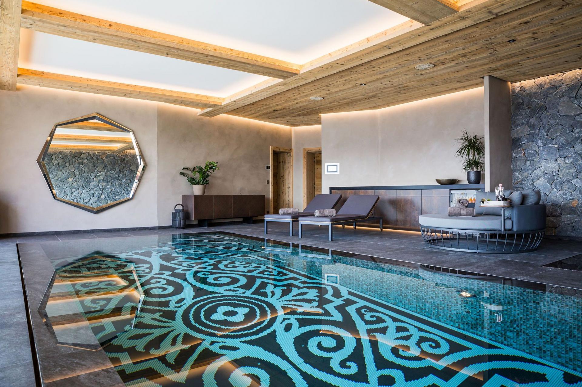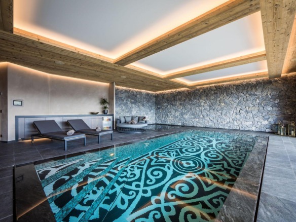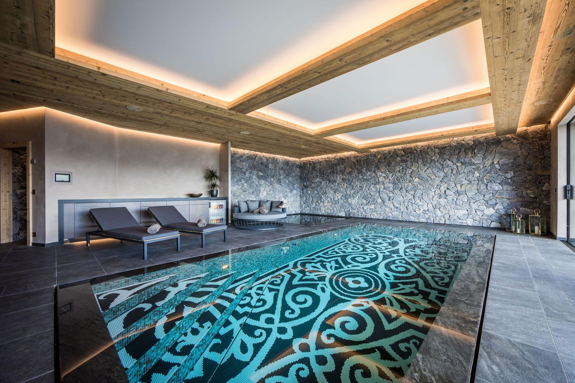 At the heart of Chalet Calima lies its private spa, a sanctuary of natural stone textures and soothing design. The indoor swimming pool features a depth-adjustable floor, alongside a sunken Jacuzzi for complete relaxation. Floor-to-ceiling glass doors open onto a terrace, where an outdoor hot tub and lounge area await—perfect for soaking in the alpine air with an evening apéritif in hand.