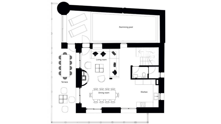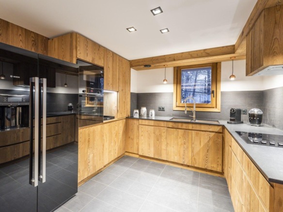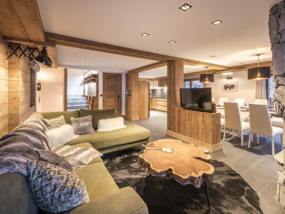 Living Spaces The first floor hosts the chalet’s cosy open-plan living area. Comfortable sofas gather around the wood-burning fireplace, creating an intimate space to relax after a day on the slopes. Floor-to-ceiling windows frame the surrounding snowy scenery, while the large south-facing terrace invites you to step outside and take in the sweeping mountain views. A fully equipped kitchen and dining area complete the space, ideal for enjoying meals prepared by your appointed cook.