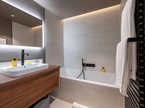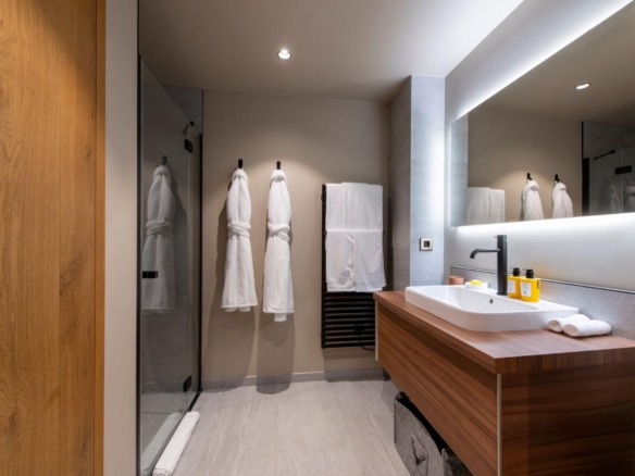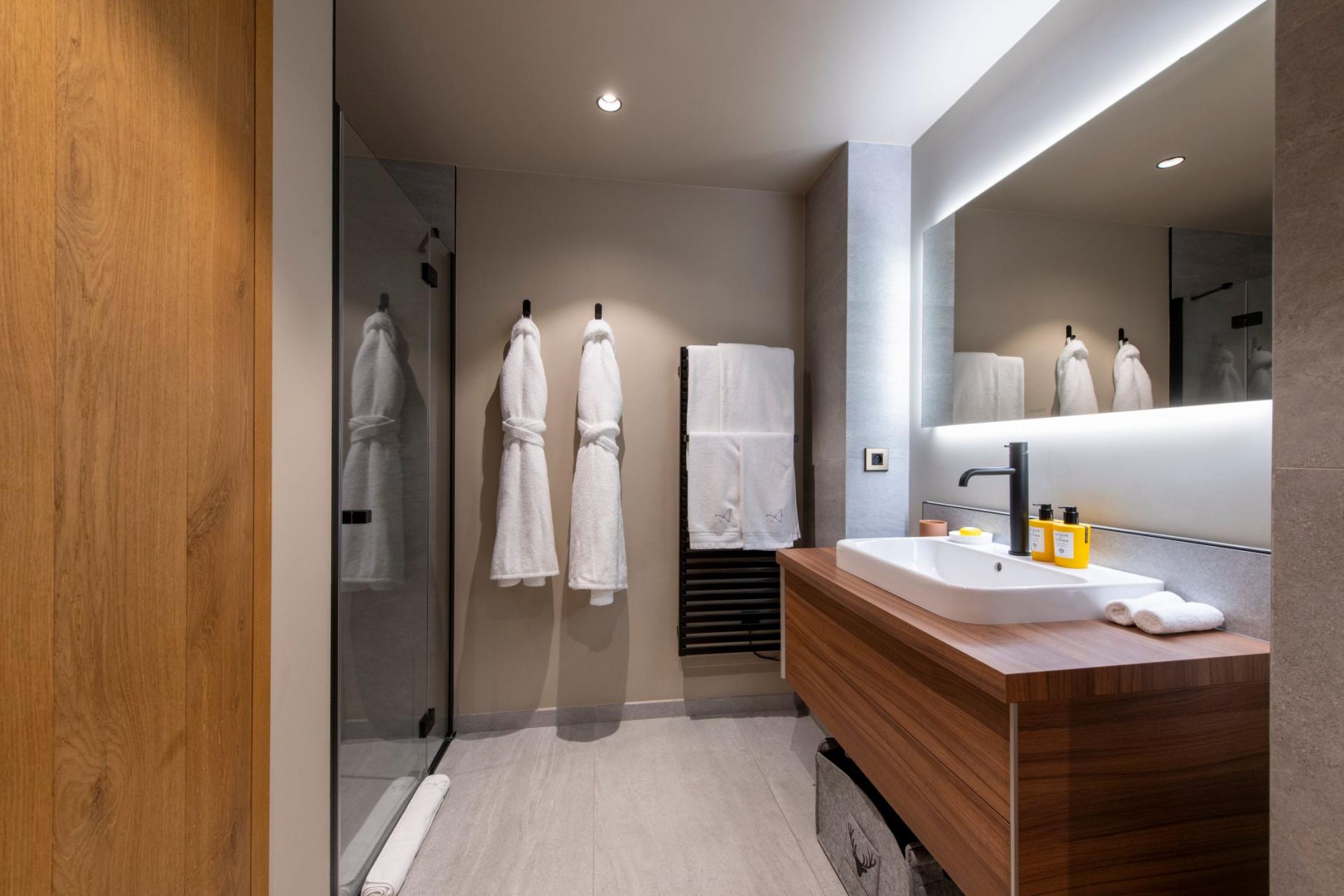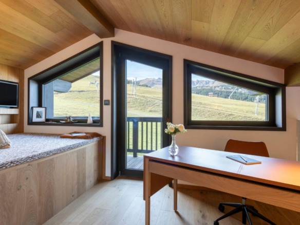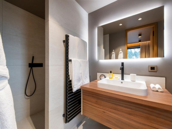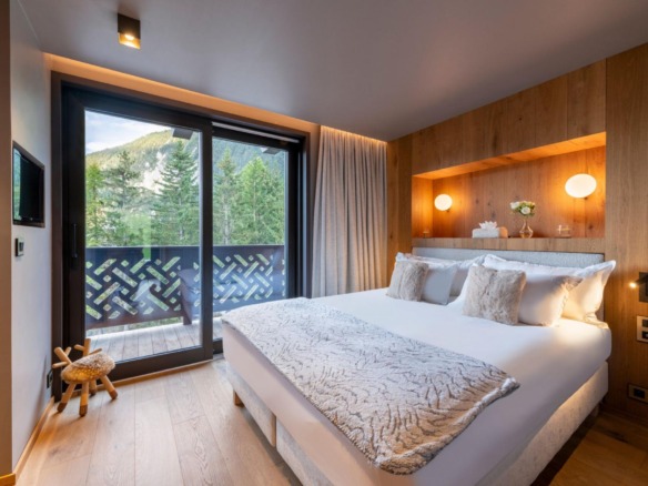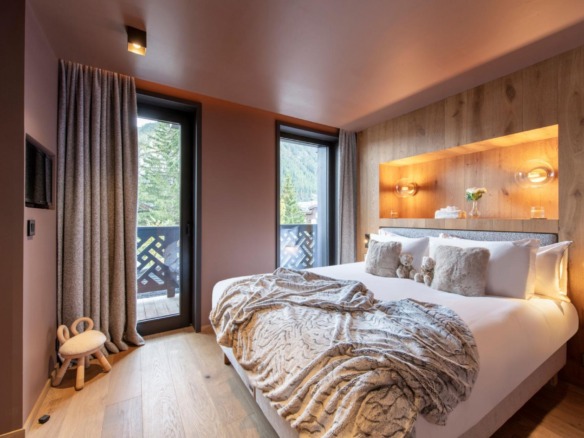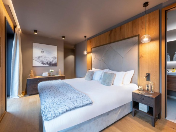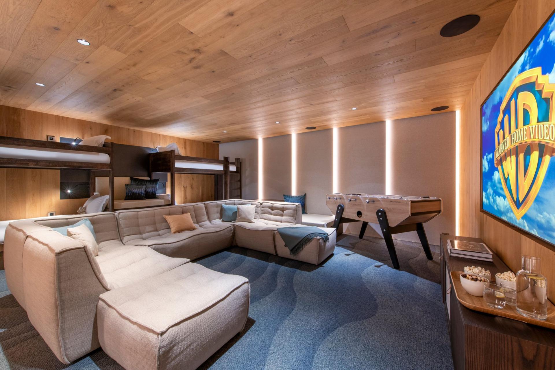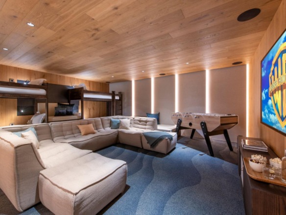 Chalet Ascension features six double bedrooms across its floors, each framed with traditional Alpine styling and large windows that fill the spaces with natural light. All bedrooms include en-suite bath or shower rooms, and several benefit from private balconies. A set of bunk beds for two children is positioned within the cinema room, making this an excellent choice for families seeking additional flexibility.