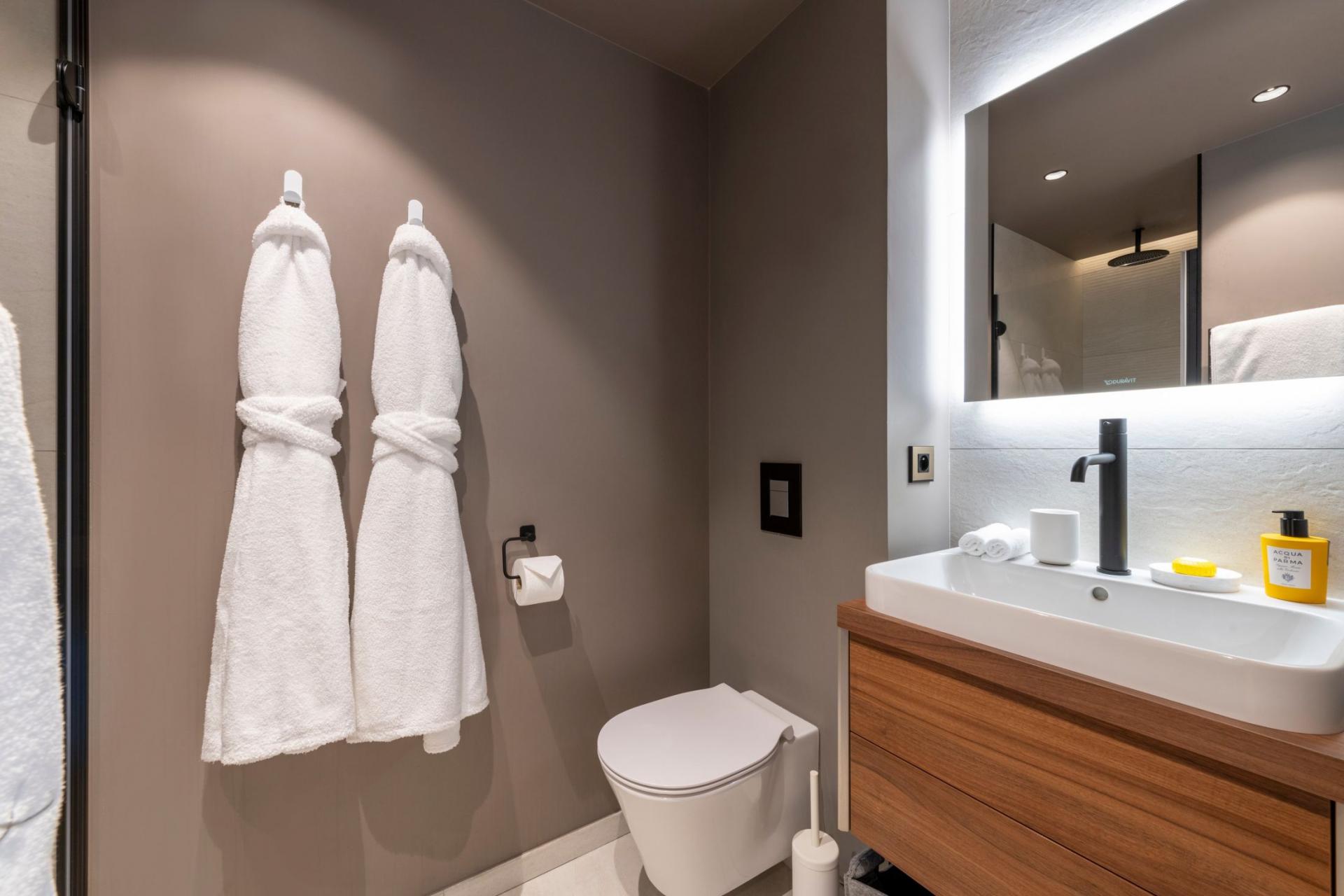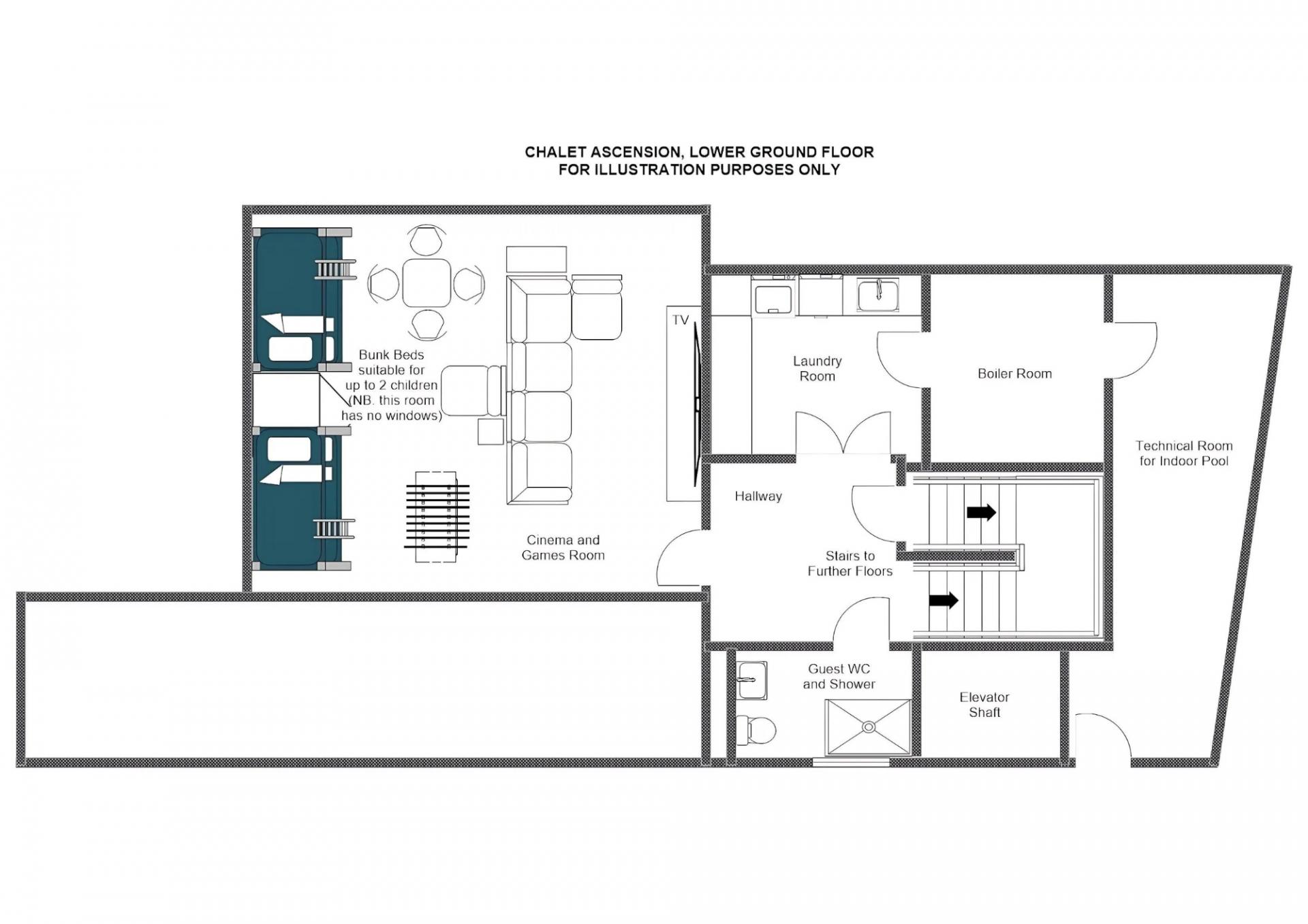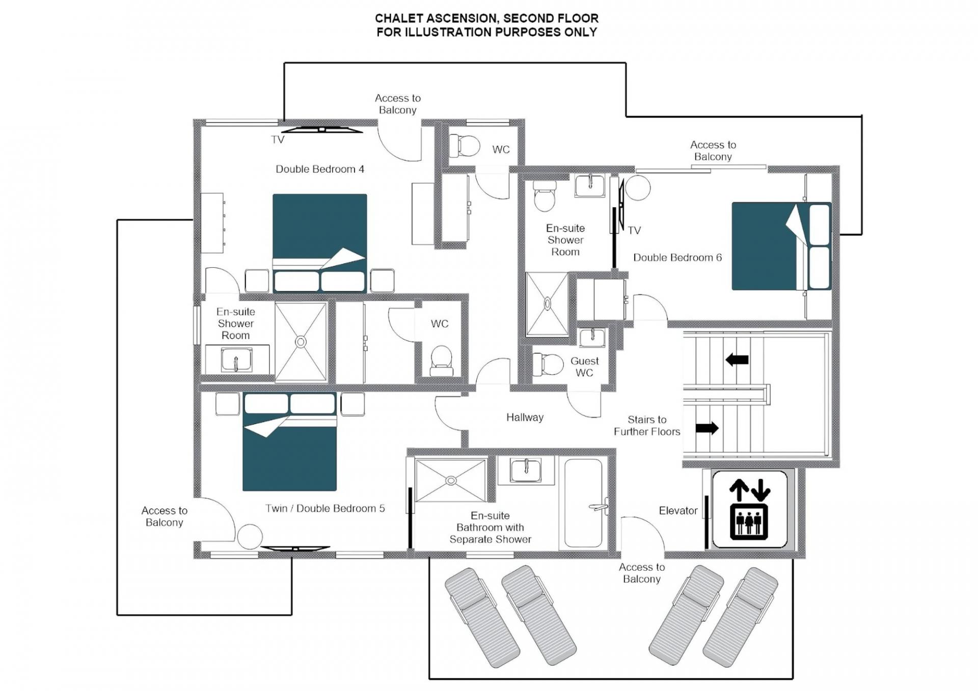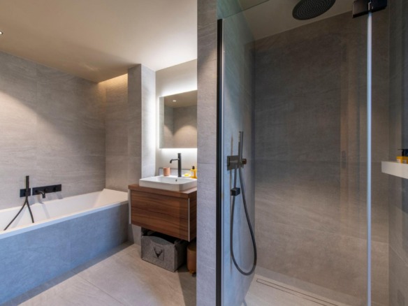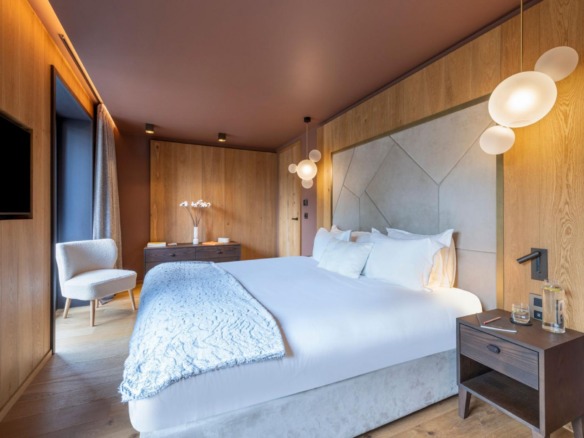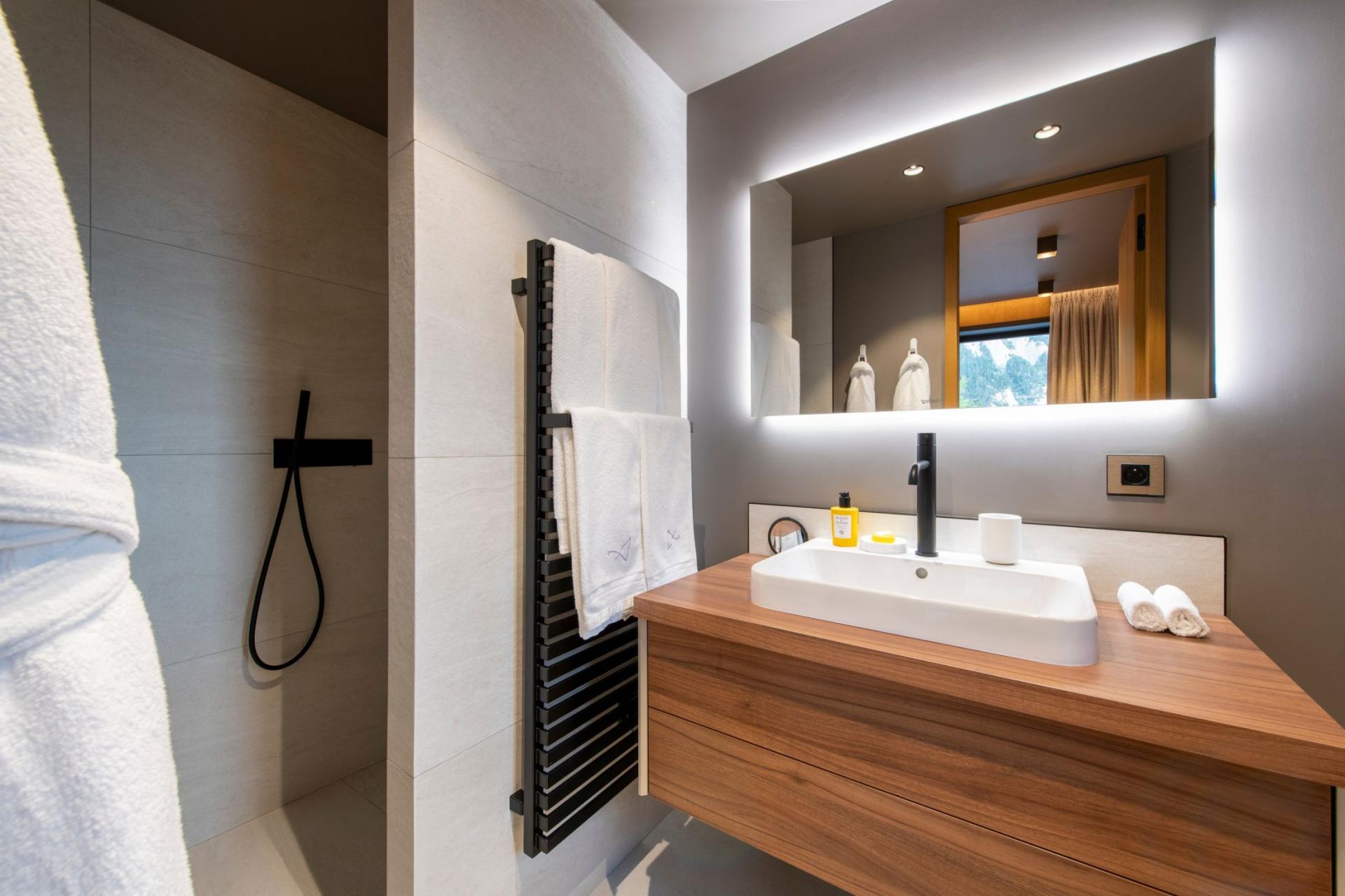 Chalet Ascension features six double bedrooms across its floors, each framed with traditional Alpine styling and large windows that fill the spaces with natural light. All bedrooms include en-suite bath or shower rooms, and several benefit from private balconies. A set of bunk beds for two children is positioned within the cinema room, making this an excellent choice for families seeking additional flexibility.