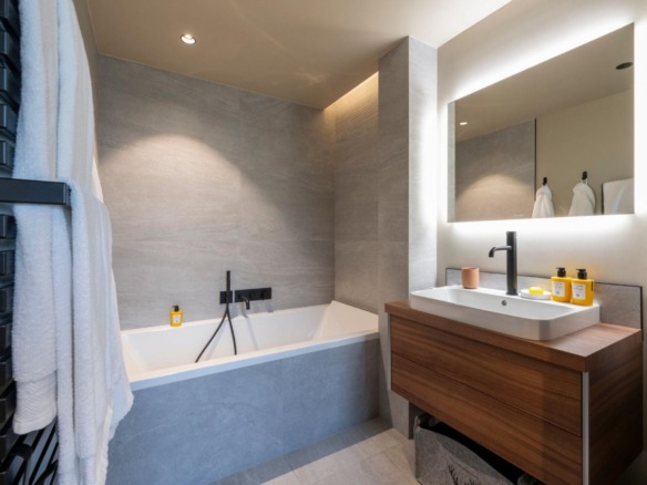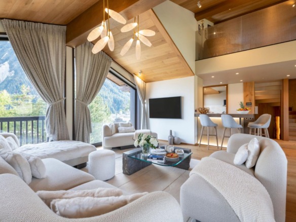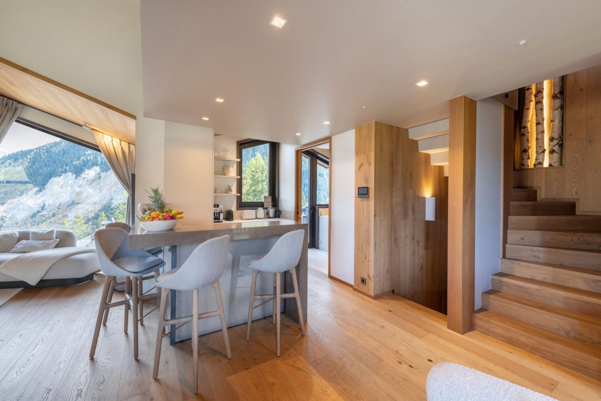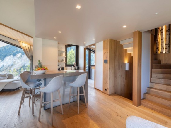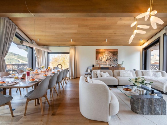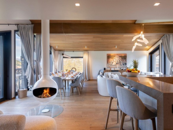 The main living area presents a blend of contemporary elegance and mountain character. Vaulted ceilings clad in timber, together with a suspended wood burning fireplace, create a cosy focal point. A generous corner sofa forms the lounge, while the dining area features a long table designed to bring everyone together. Floor to ceiling windows open the space to views across Courchevel Moriond and the surrounding pistes. The adjoining kitchen is fully equipped for relaxed evenings at home, complemented by a breakfast bar for casual dining. An expansive balcony offers a peaceful outdoor space to enjoy fresh mountain air and watch skiers glide past at the end of the day.