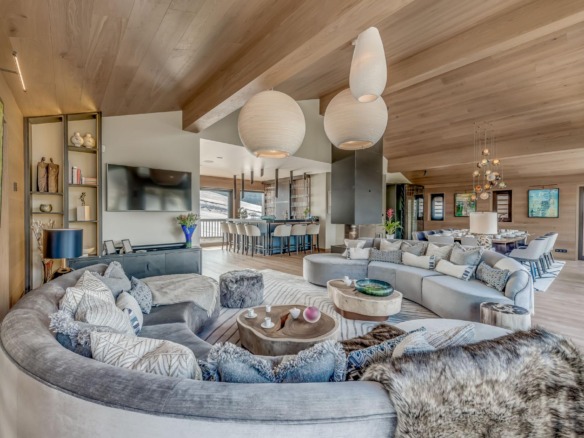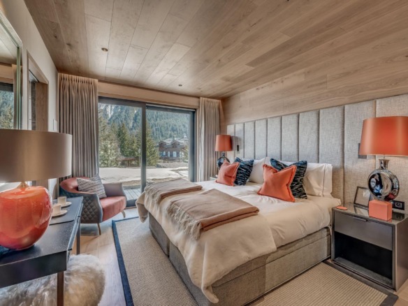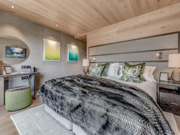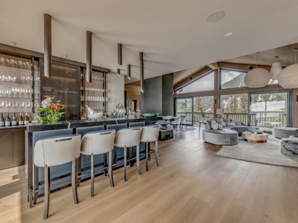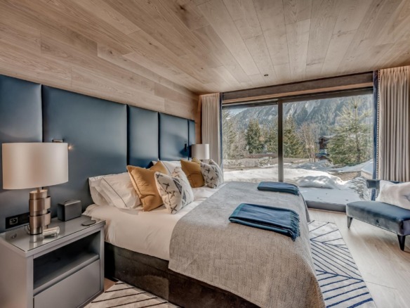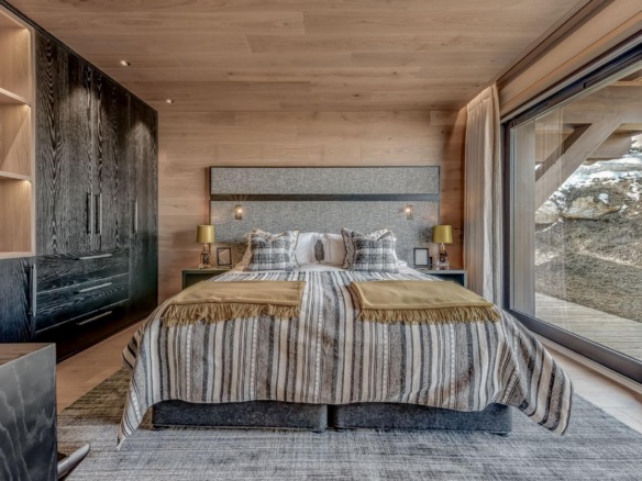 The main living floor features a striking double-height lounge where vast windows open the room to uninterrupted panoramic views. Soft natural light pours in, enhancing the calm, refined atmosphere. This open plan space includes a fully equipped professional kitchen where your private chef prepares each evening’s culinary experience, accompanied by the subtle aromas of fine dining. A statement wine cellar and elegant bar complete the setting, echoing the chalet’s namesake, inspired by the Roman god of wine.