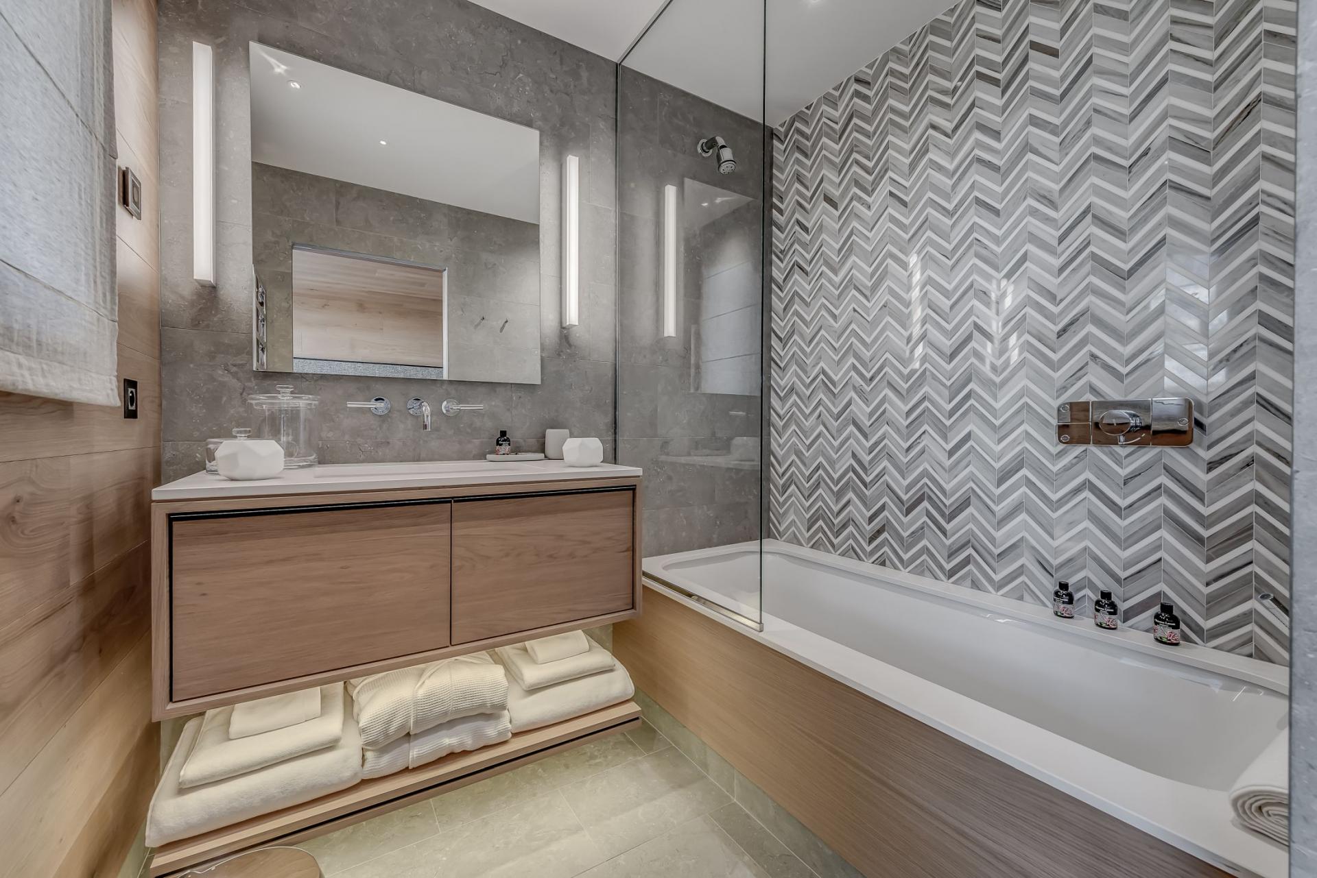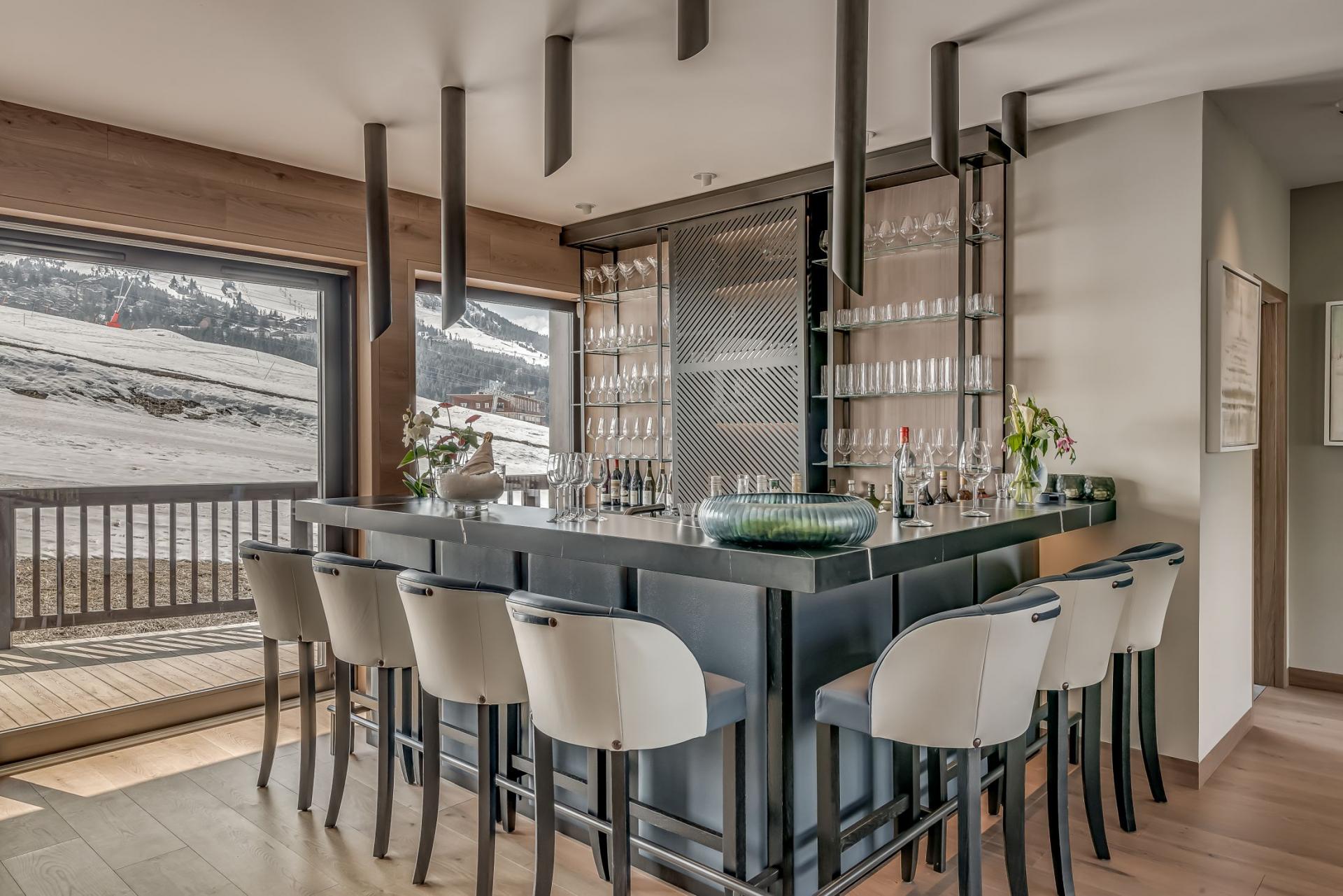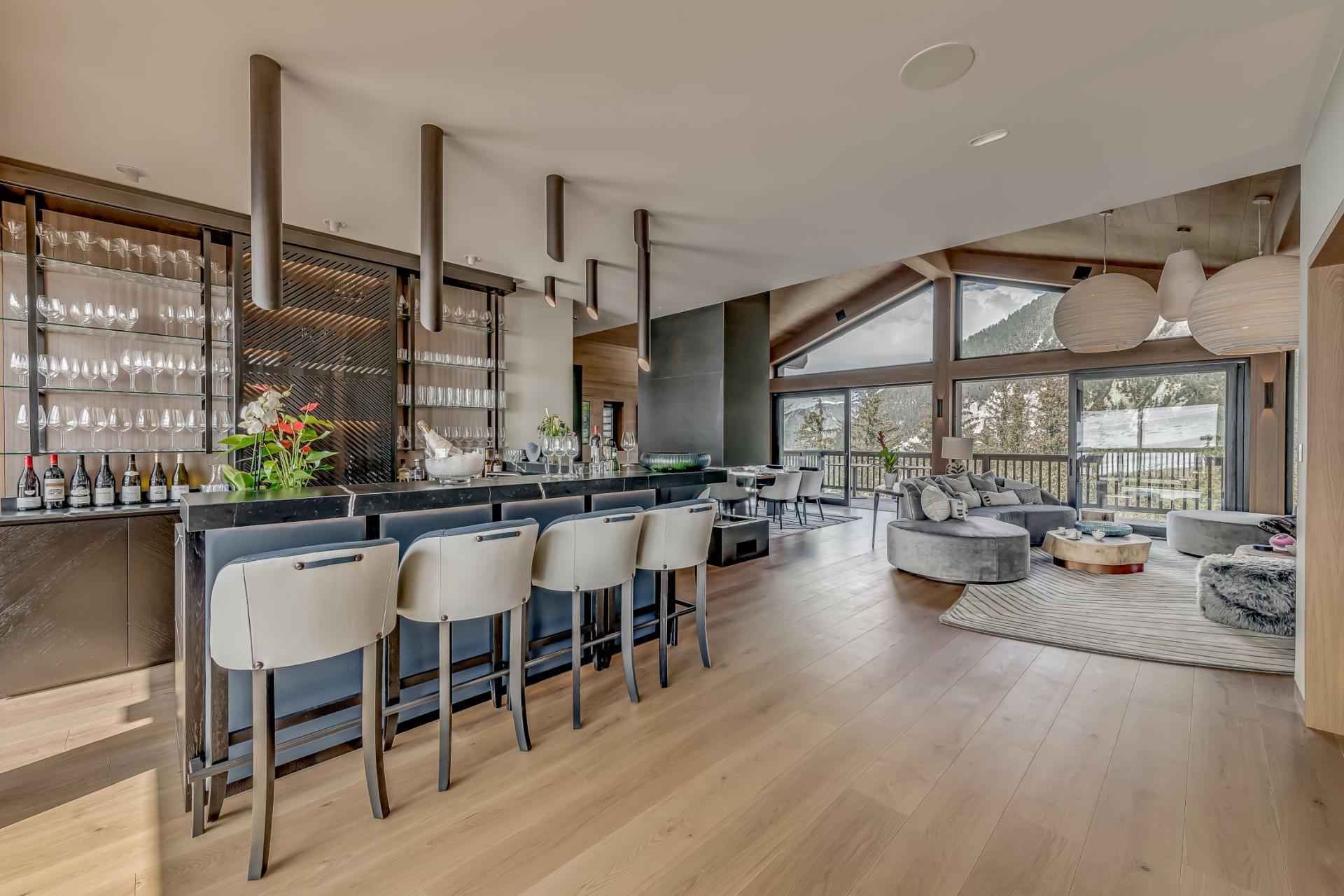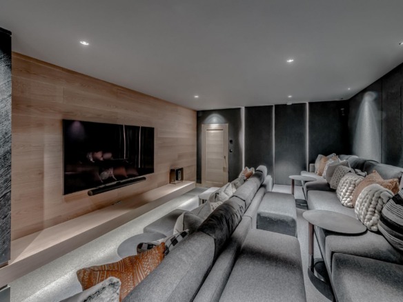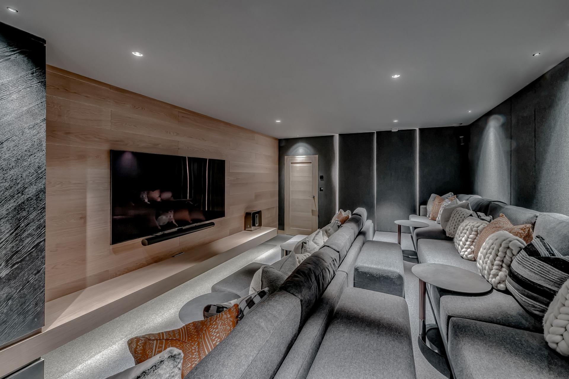 Wellness sits at the heart of Chalet Bacchus. The lower level is dedicated entirely to relaxation, featuring a ten-meter pool, a sunken jacuzzi, a soothing hammam, and a spacious sauna. Full-height glass doors lead to a private heated courtyard, offering a peaceful outdoor extension to the spa. A serene treatment room on the floor above provides the perfect sanctuary for restorative massages. Nearby, a private cinema with advanced audio-visual technology and plush tiered seating offers a refined setting for evening films or a quiet retreat after a day on the slopes. The main living floor also includes a contemporary bar for pre-dinner moments, while outside on the balcony, a generous hot tub overlooks the snowy landscape.