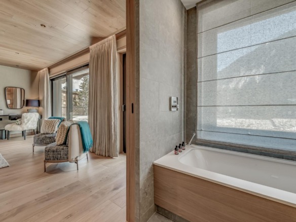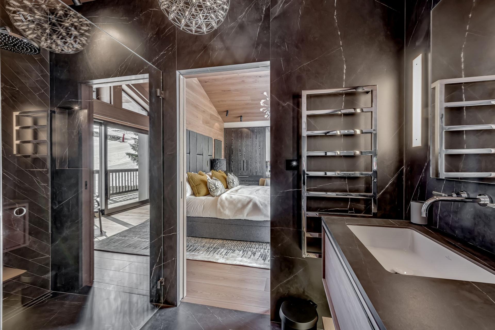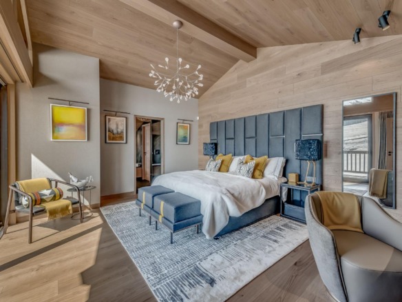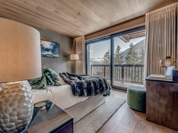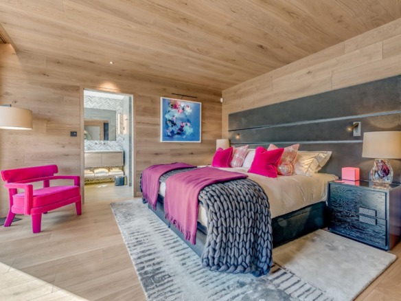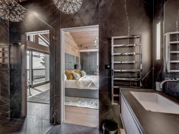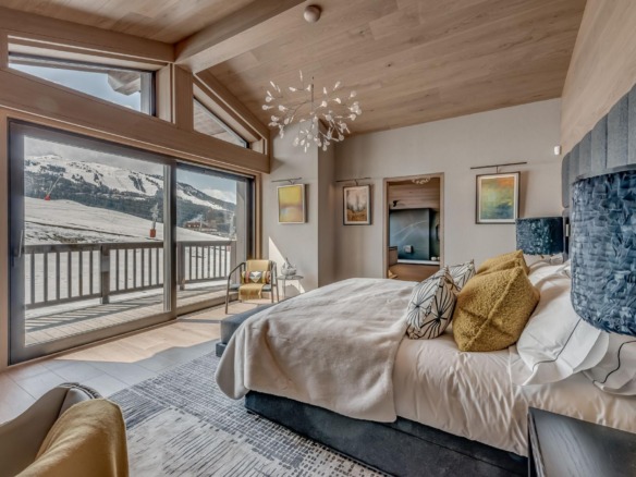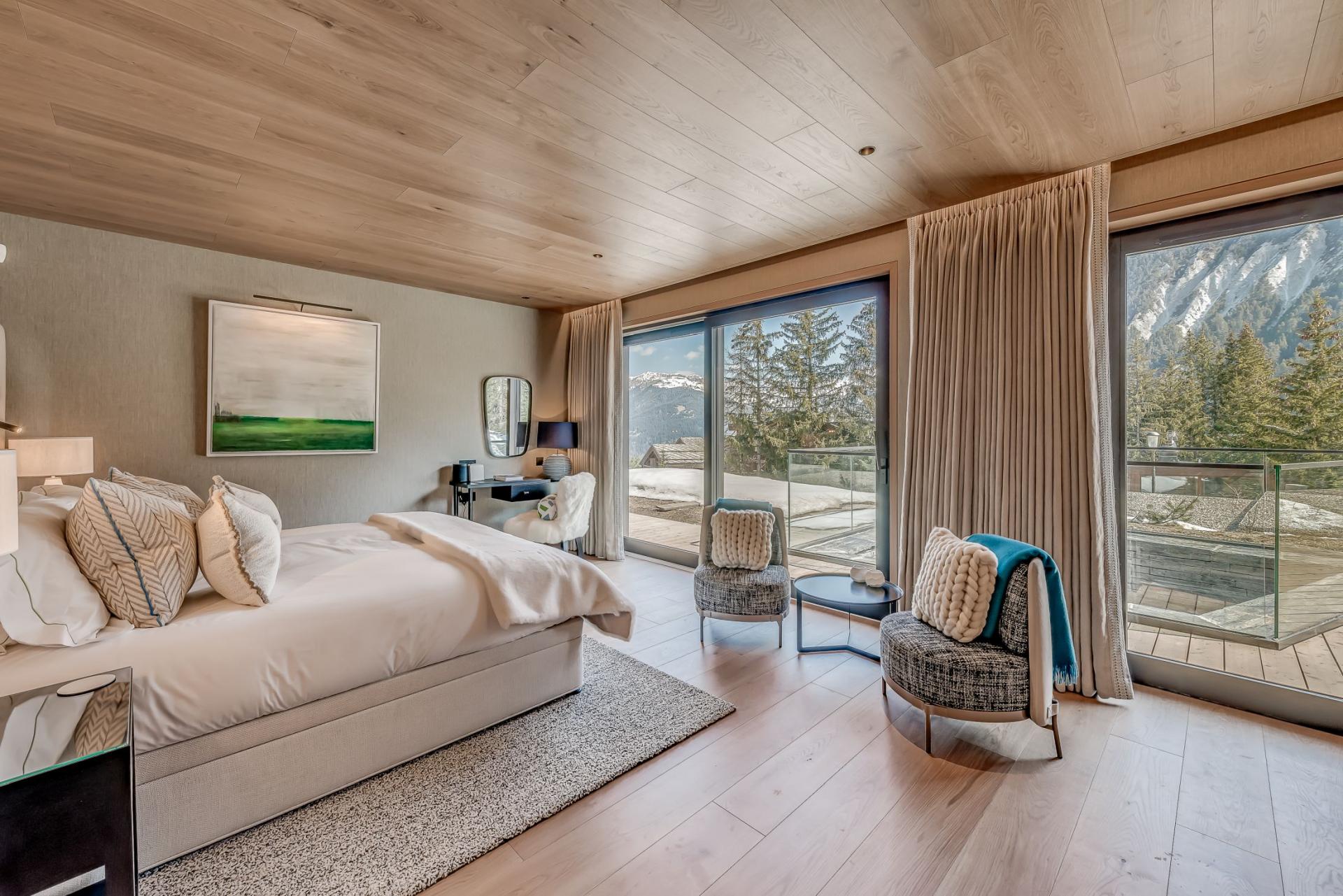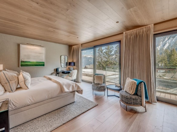 The chalet features seven exceptionally spacious ensuite bedrooms, accommodating up to fourteen guests in complete comfort. Each room includes either a terrace or balcony, creating an effortless connection with the alpine surroundings. The top floor is reserved for the master suite, offering privacy, a generous layout, and its own balcony.
