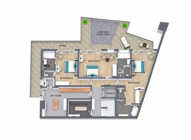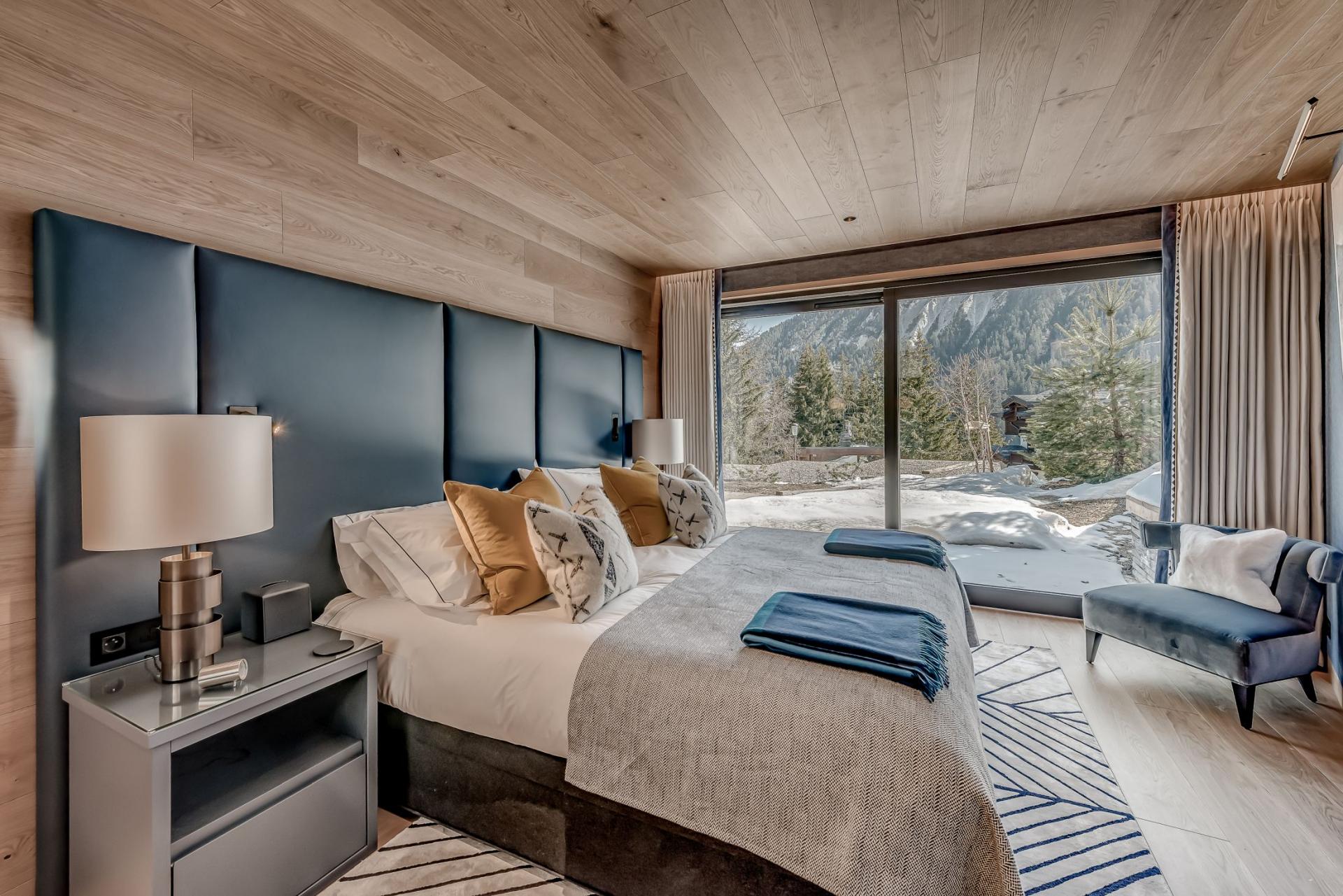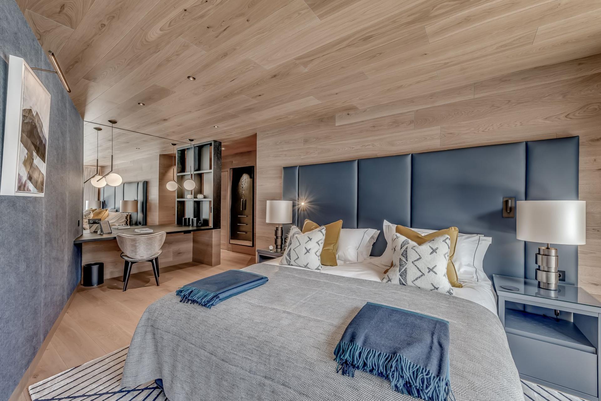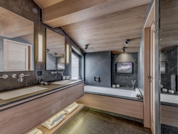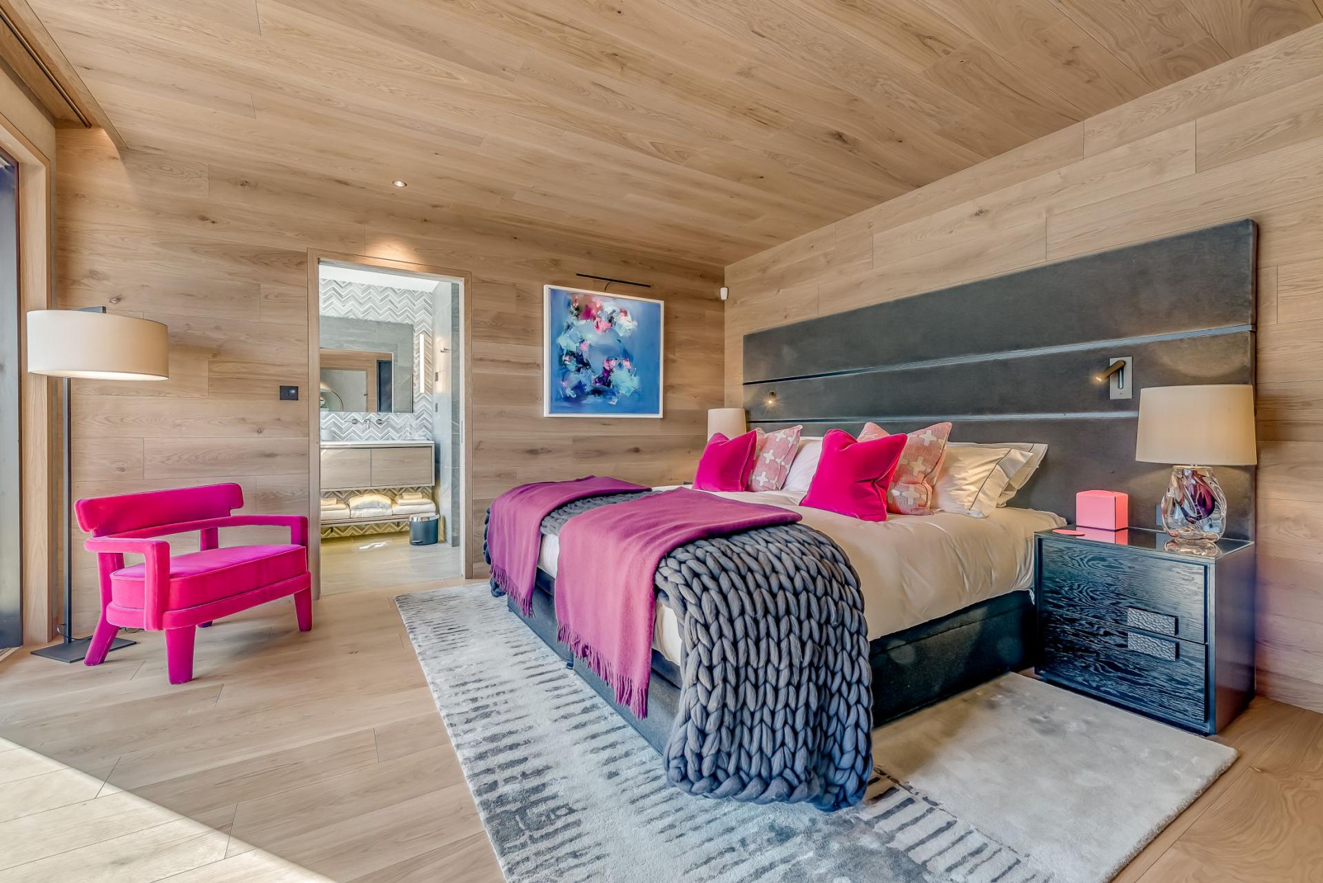 The chalet features seven exceptionally spacious ensuite bedrooms, accommodating up to fourteen guests in complete comfort. Each room includes either a terrace or balcony, creating an effortless connection with the alpine surroundings. The top floor is reserved for the master suite, offering privacy, a generous layout, and its own balcony.
