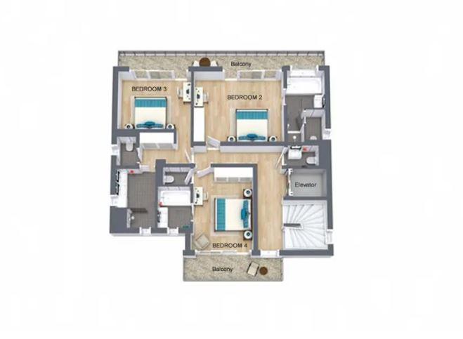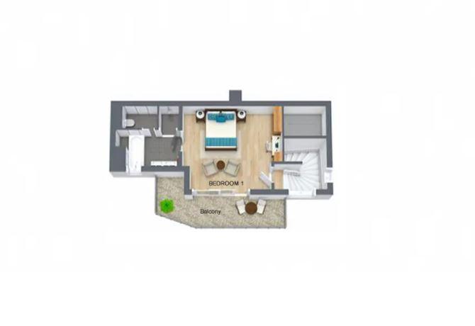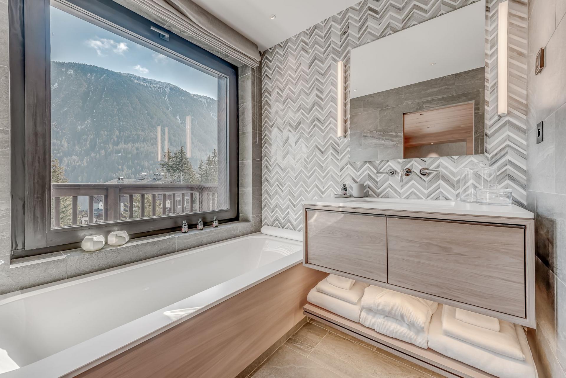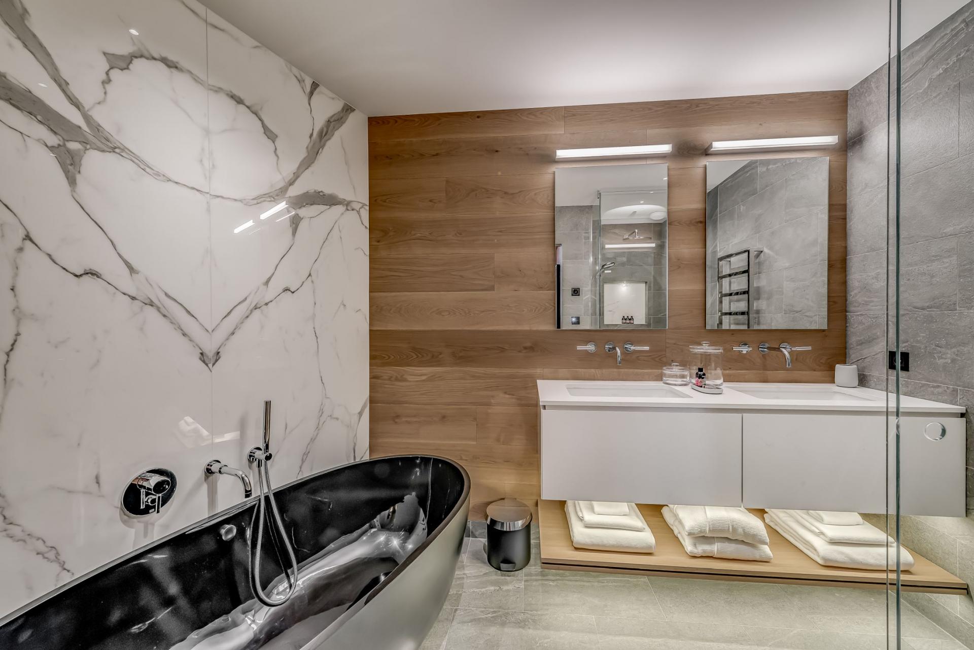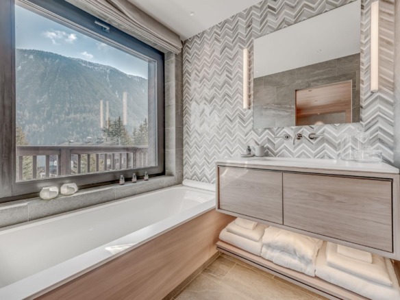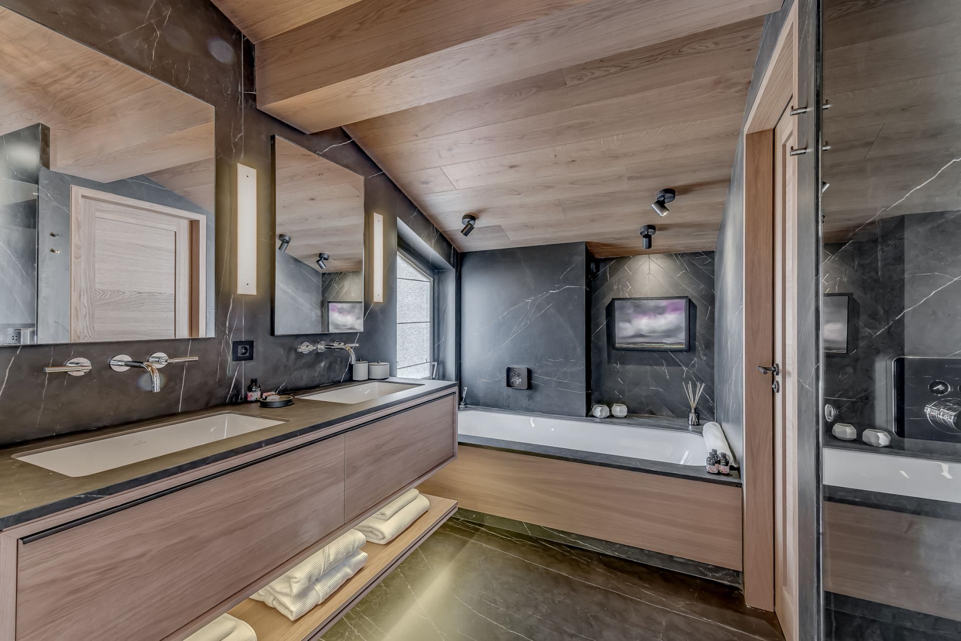 The chalet features seven exceptionally spacious ensuite bedrooms, accommodating up to fourteen guests in complete comfort. Each room includes either a terrace or balcony, creating an effortless connection with the alpine surroundings. The top floor is reserved for the master suite, offering privacy, a generous layout, and its own balcony.