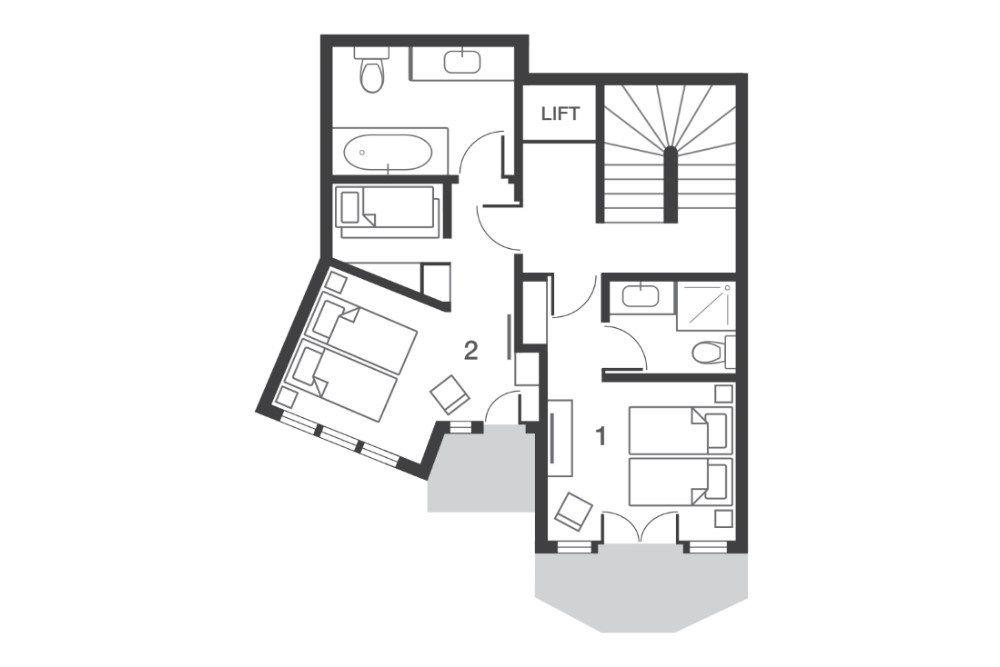 Across five floors, the chalet accommodates up to fourteen guests in five adaptable bedrooms, each styled individually with its own en-suite bathroom. Many rooms enjoy access to a private balcony, offering a quiet moment with a morning coffee before the day begins. All bedrooms can be arranged as double or twin, and two include additional bunk rooms for added flexibility.