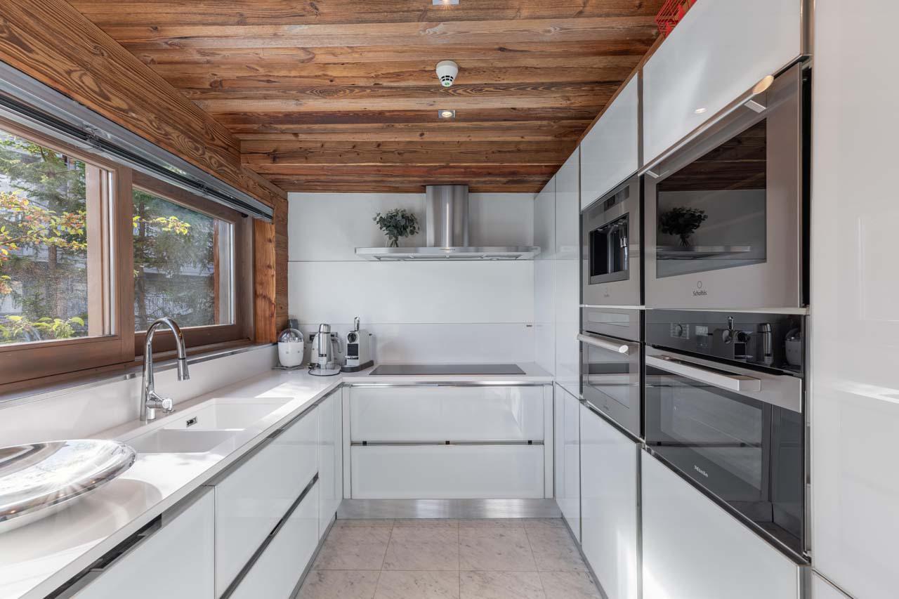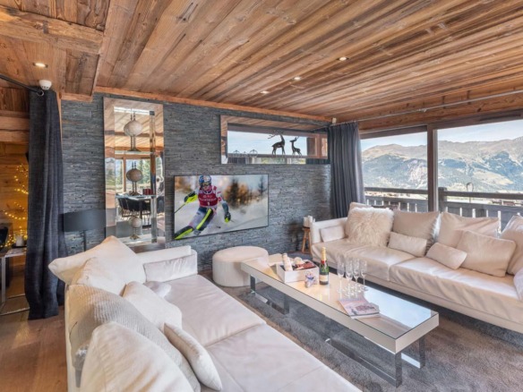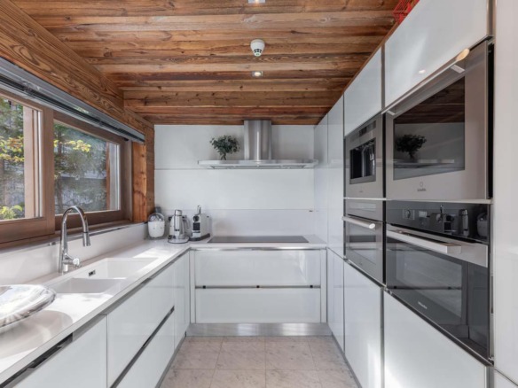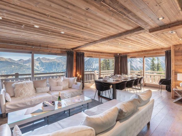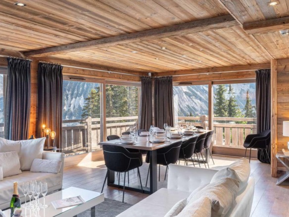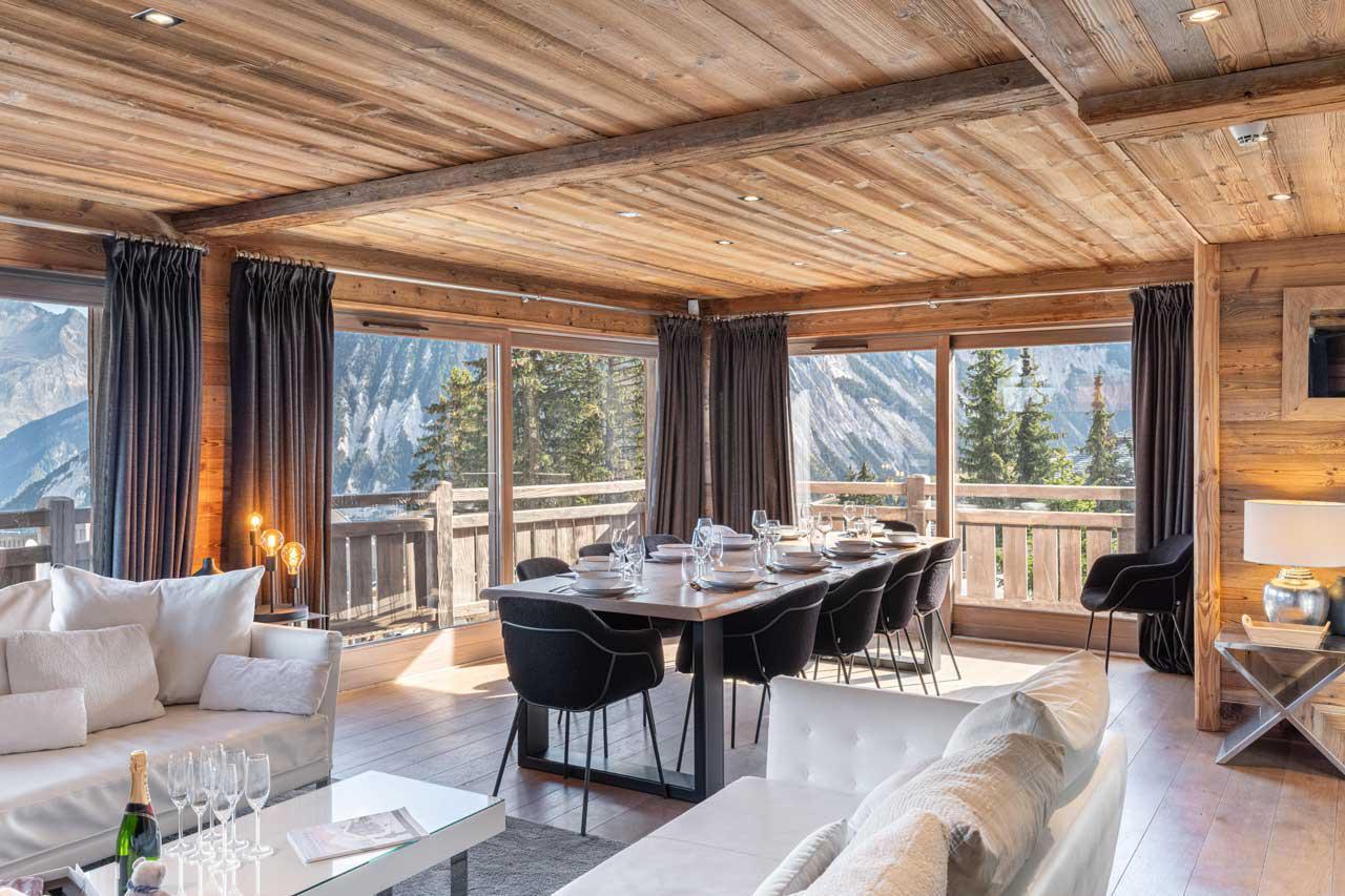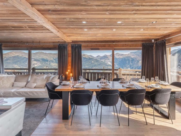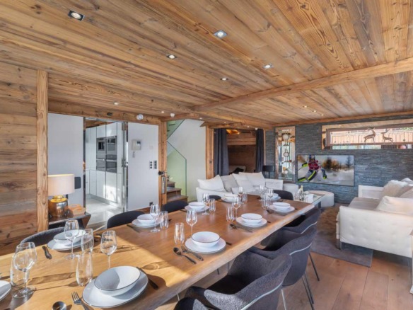 The dining area is equally considered, centred around a long table that brings guests together for evening meals and conversation. A fully equipped modern kitchen stands ready for a private chef or for casual cooking among friends. For those who wish to explore, the vibrant culinary scene of Courchevel 1850 is just minutes away.