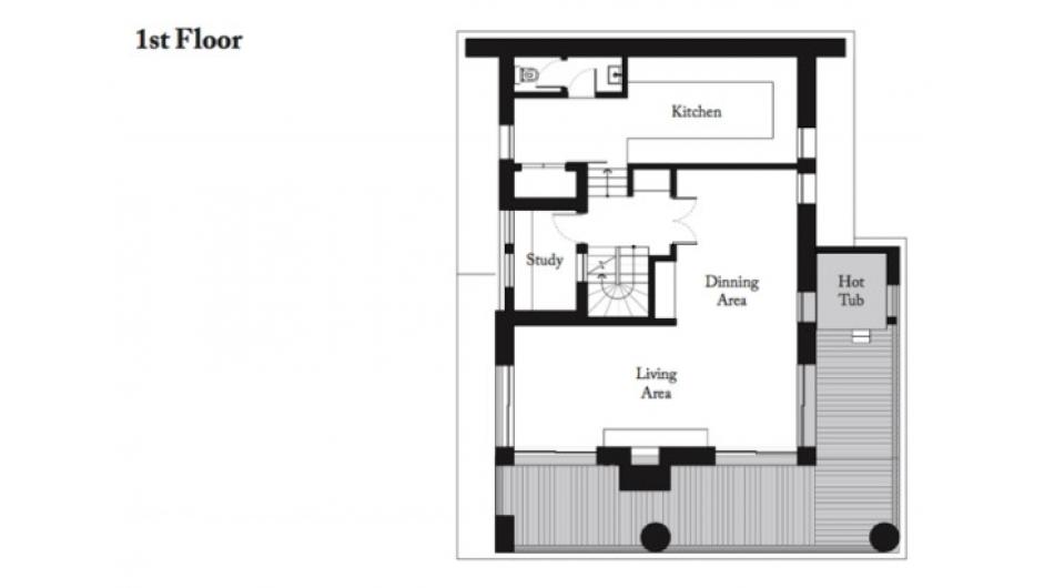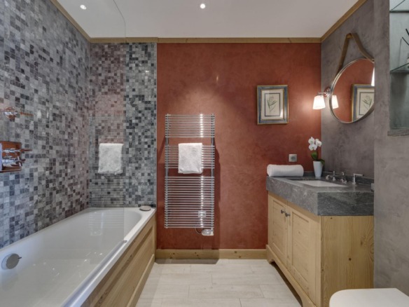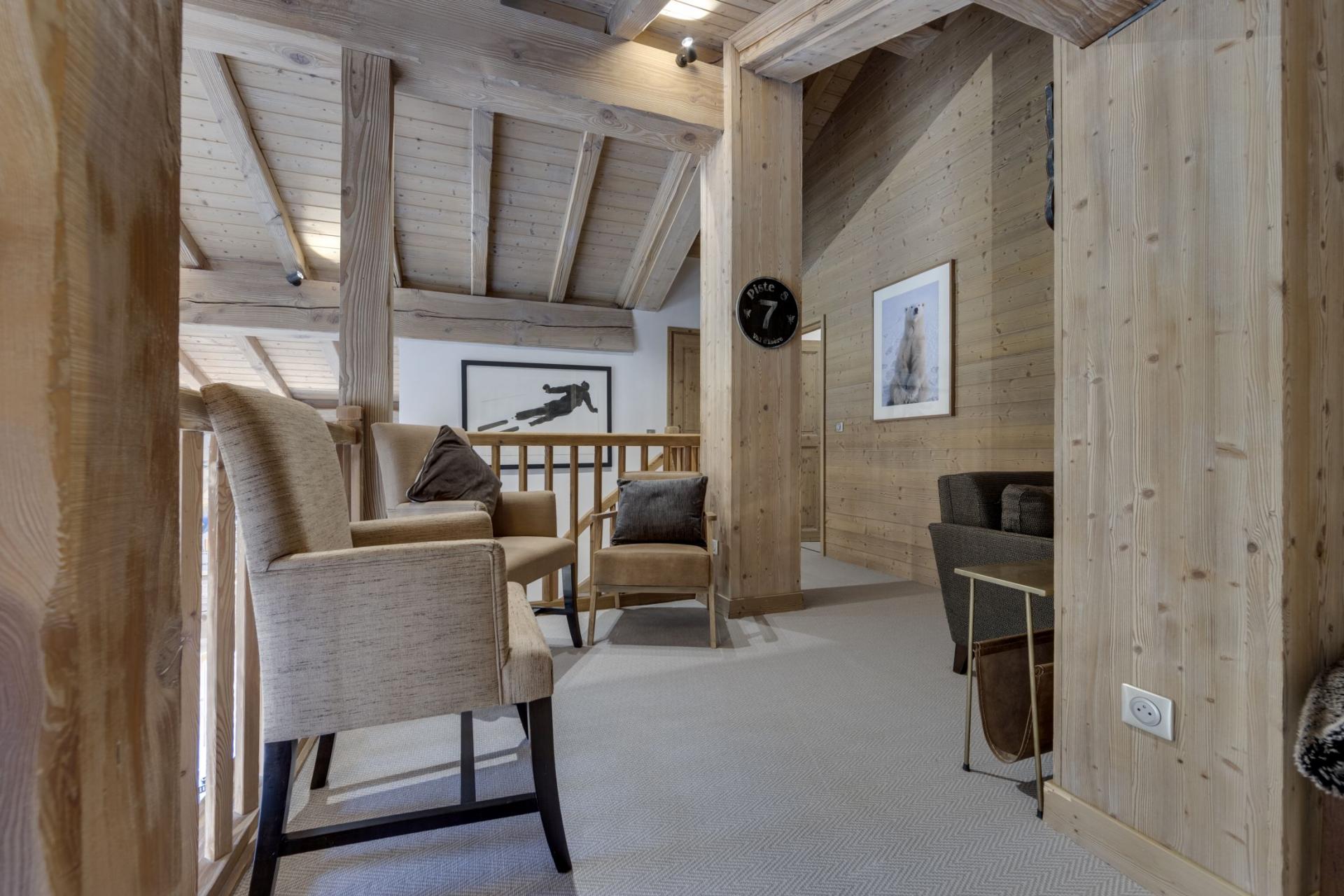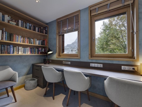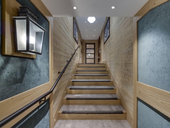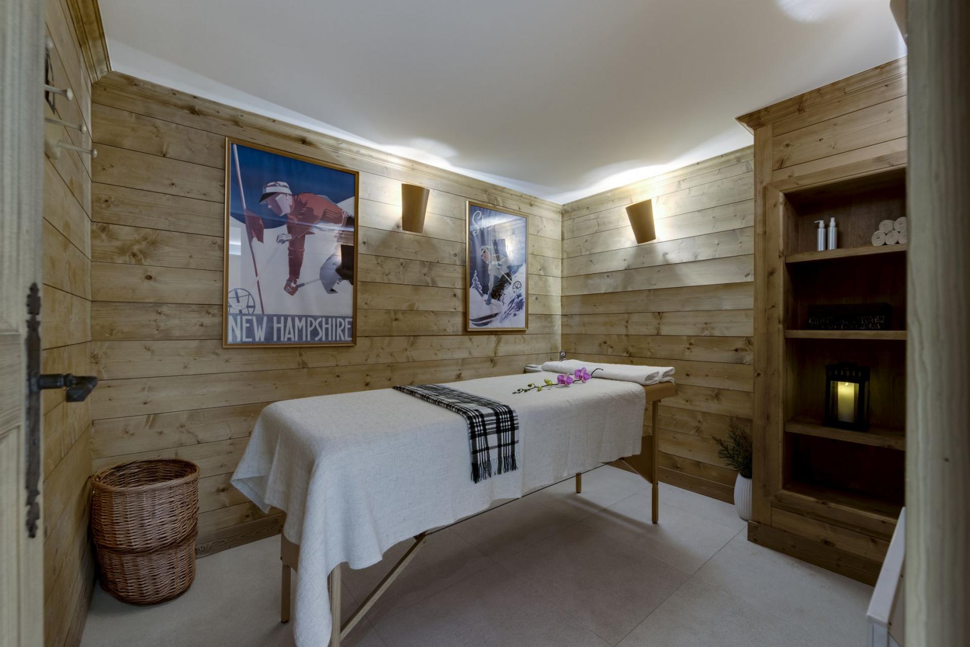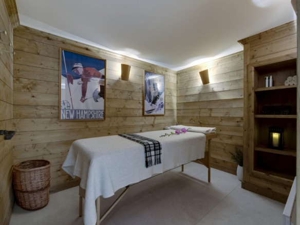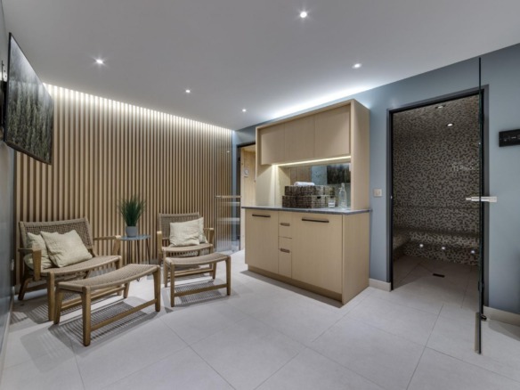 Wellness & Relaxation For complete post-ski rejuvenation, the lower ground floor houses a peaceful wellness area with a sauna, Hammam and massage room. The outdoor hot tub on the balcony provides a scenic spot to unwind in the crisp alpine air. A cosy mezzanine TV snug sits above the main lounge, offering a quiet retreat for children or an intimate space for relaxed evenings.