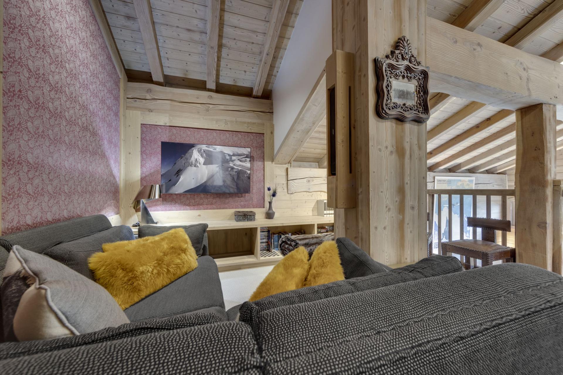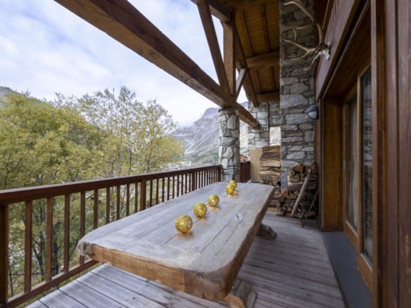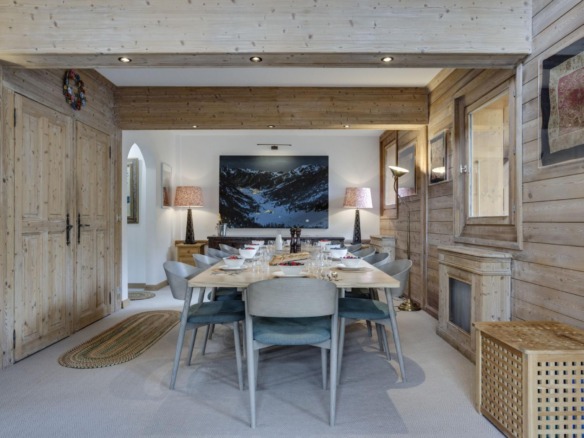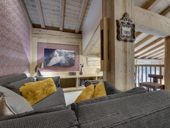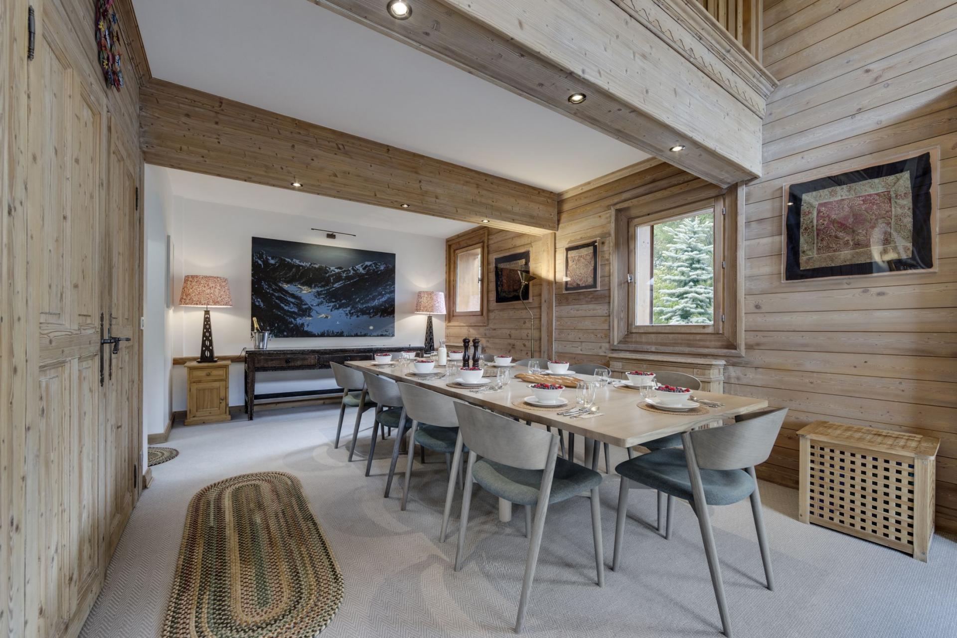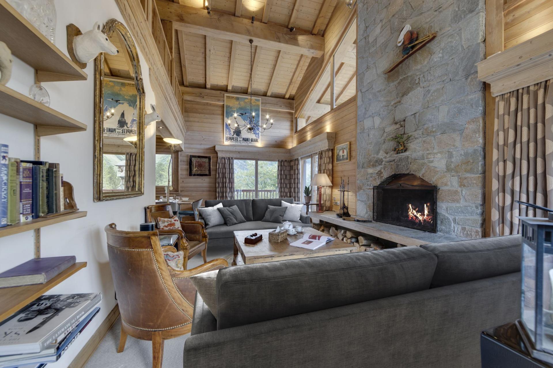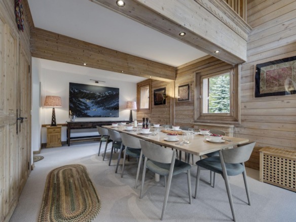 Living Spaces The main living floor features soaring ceilings, a striking stone fireplace and large windows framing the snowy mountain backdrop. Comfortable sofas invite you to unwind after a day on the slopes, while a ten-seat dining table sets the tone for memorable evening meals prepared in the separate kitchen. A wraparound balcony extends the living space outdoors, offering an alfresco dining area, a hot tub and views across to Rocher du Charvet.