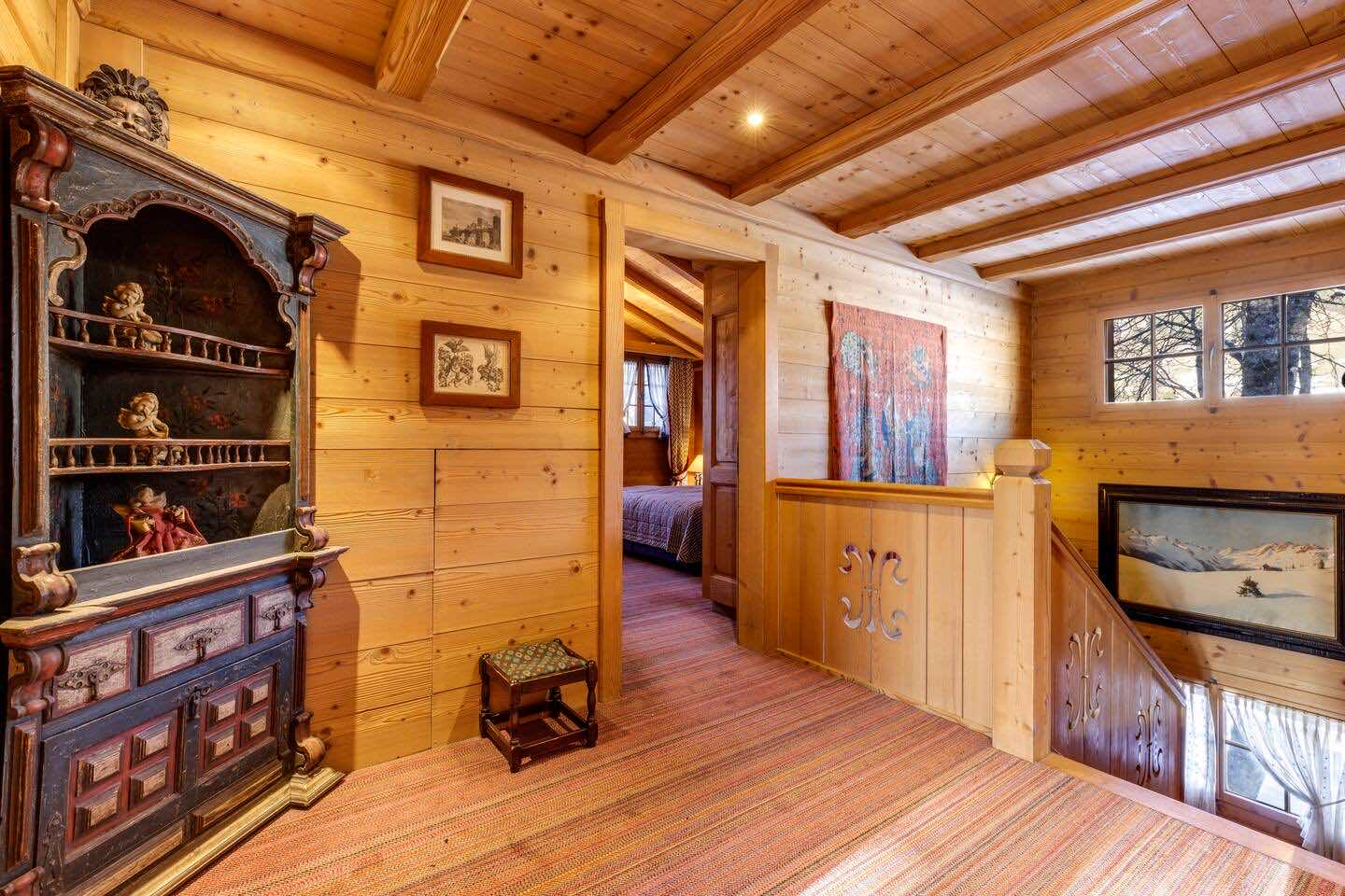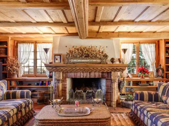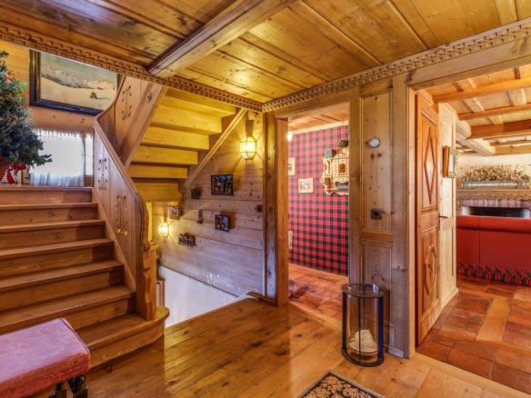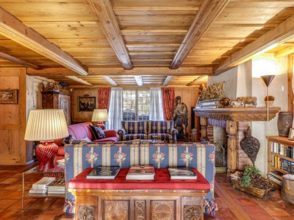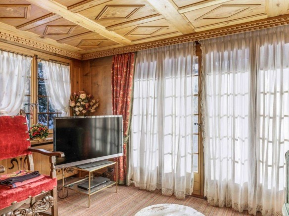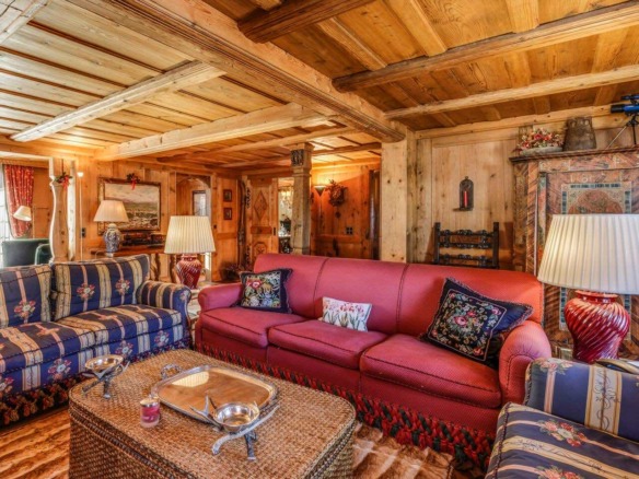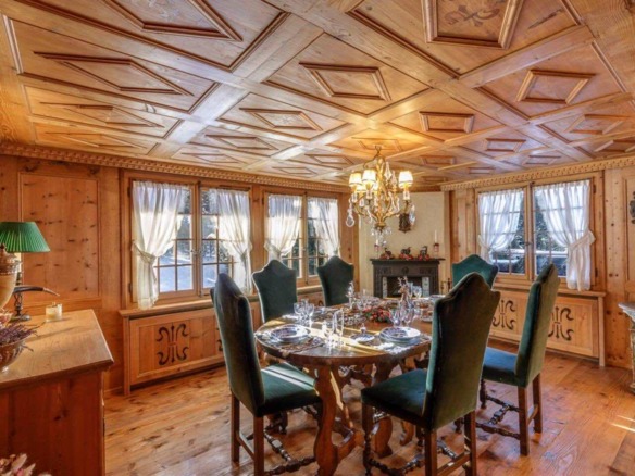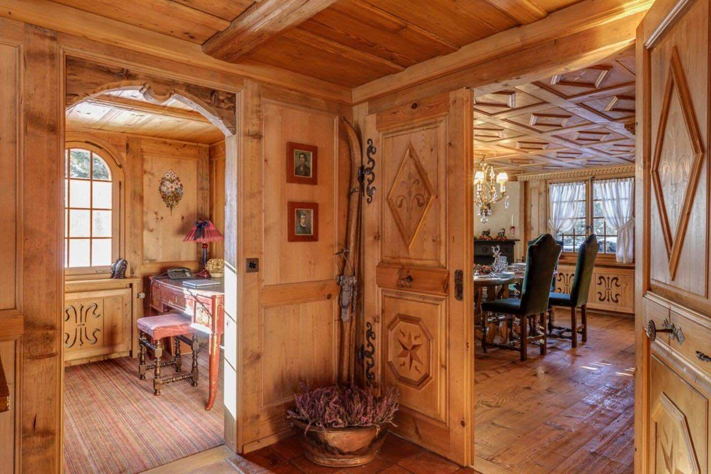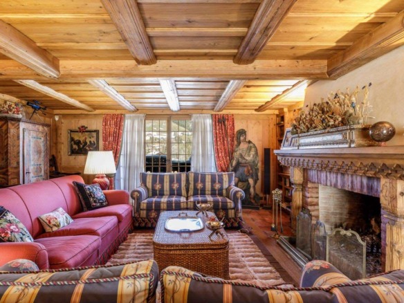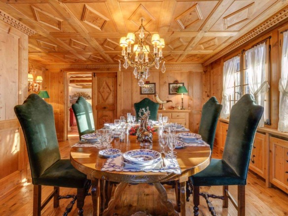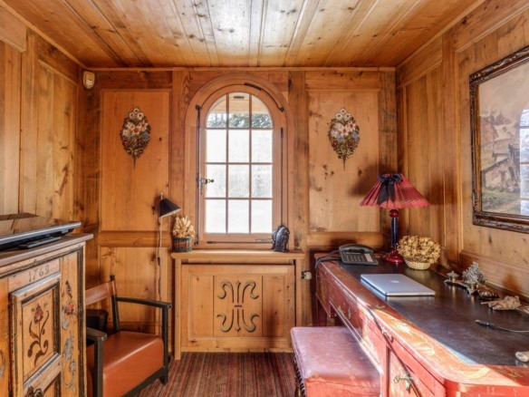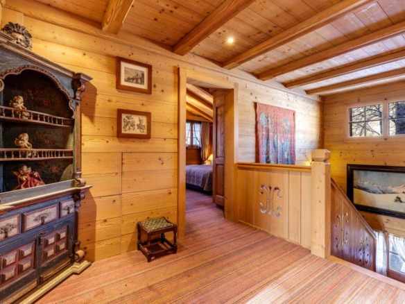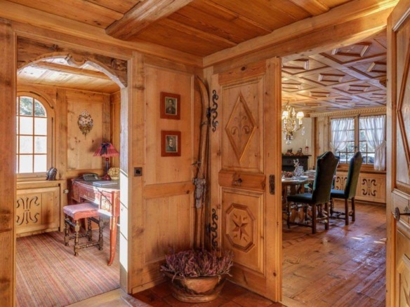 Crafted from antique wood with hand-inlaid ceilings and doors, the chalet evokes an atmosphere of warmth and authenticity. Throughout the home, fireplaces enhance the charm, creating intimate spaces perfect for winter evenings. The interiors are finished in a traditional alpine style, rich in detail and thoughtfully preserved.