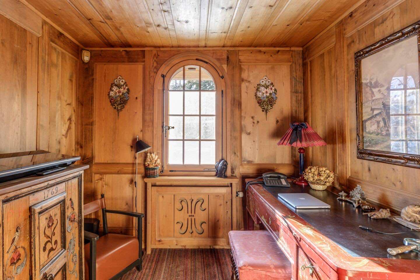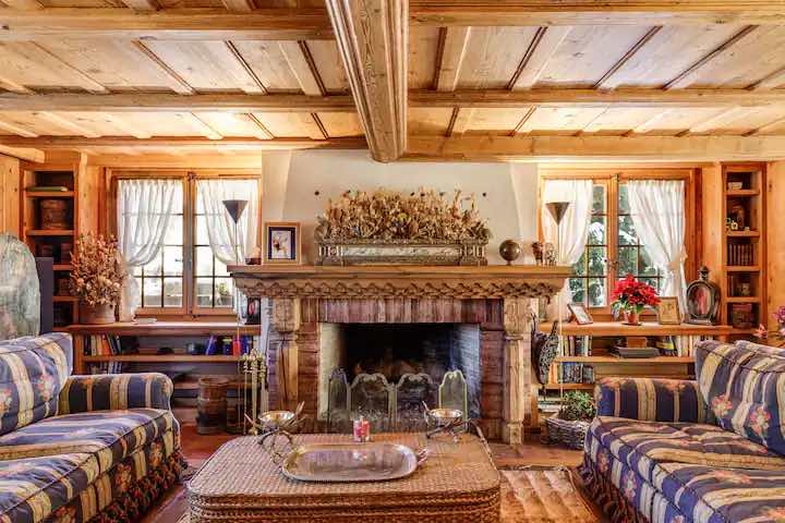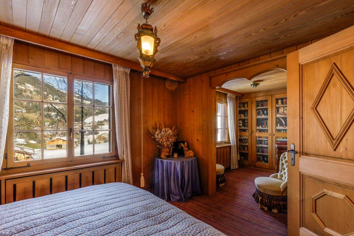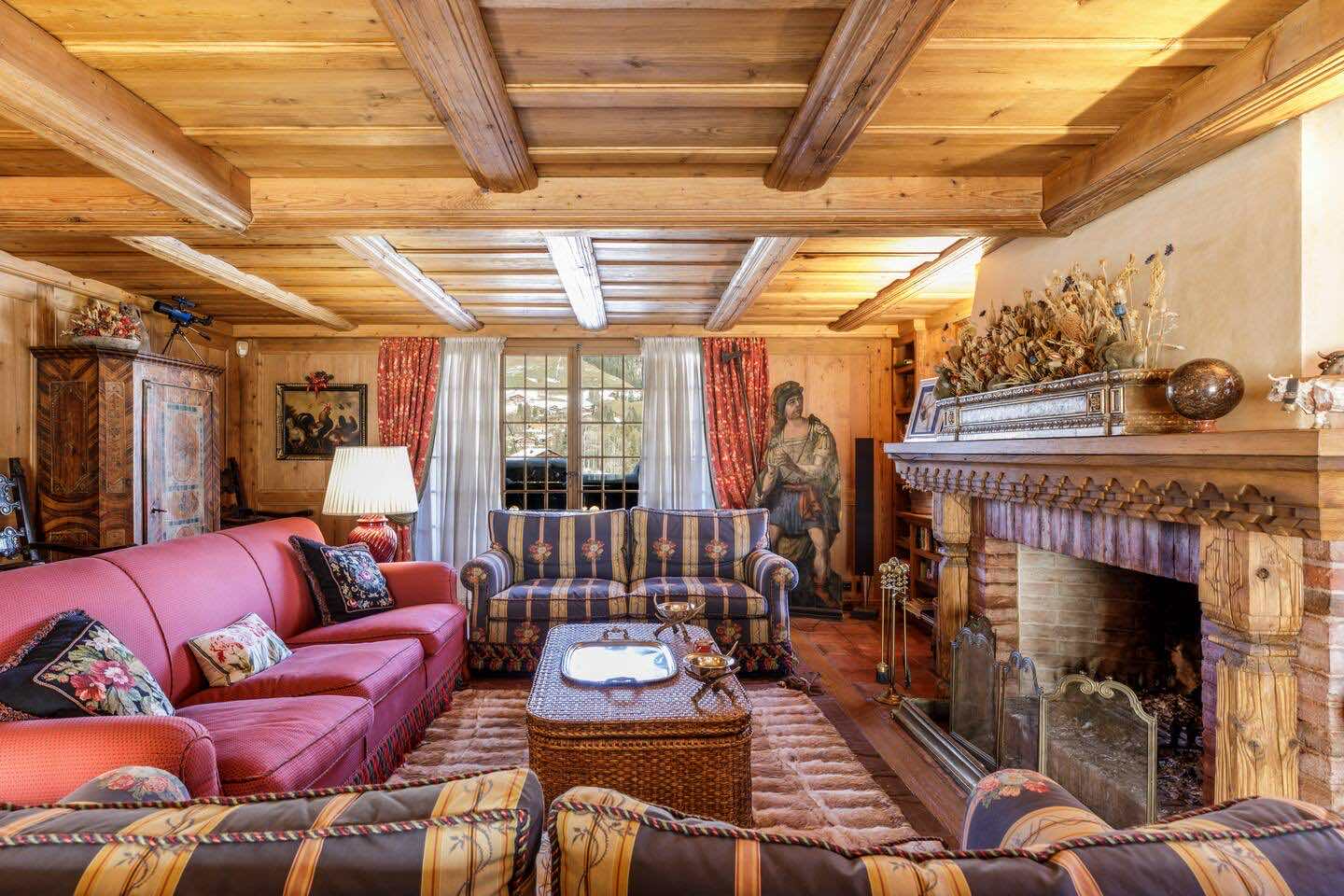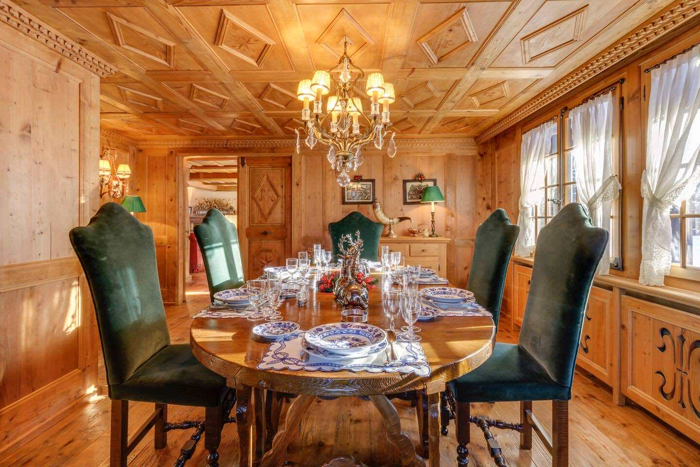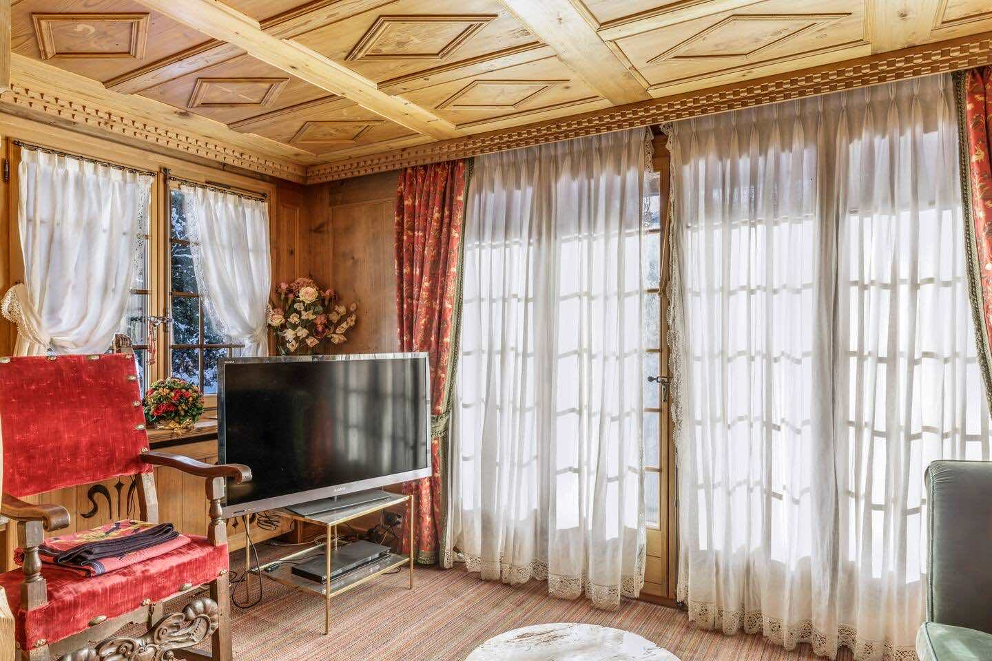 Crafted from antique wood with hand-inlaid ceilings and doors, the chalet evokes an atmosphere of warmth and authenticity. Throughout the home, fireplaces enhance the charm, creating intimate spaces perfect for winter evenings. The interiors are finished in a traditional alpine style, rich in detail and thoughtfully preserved.