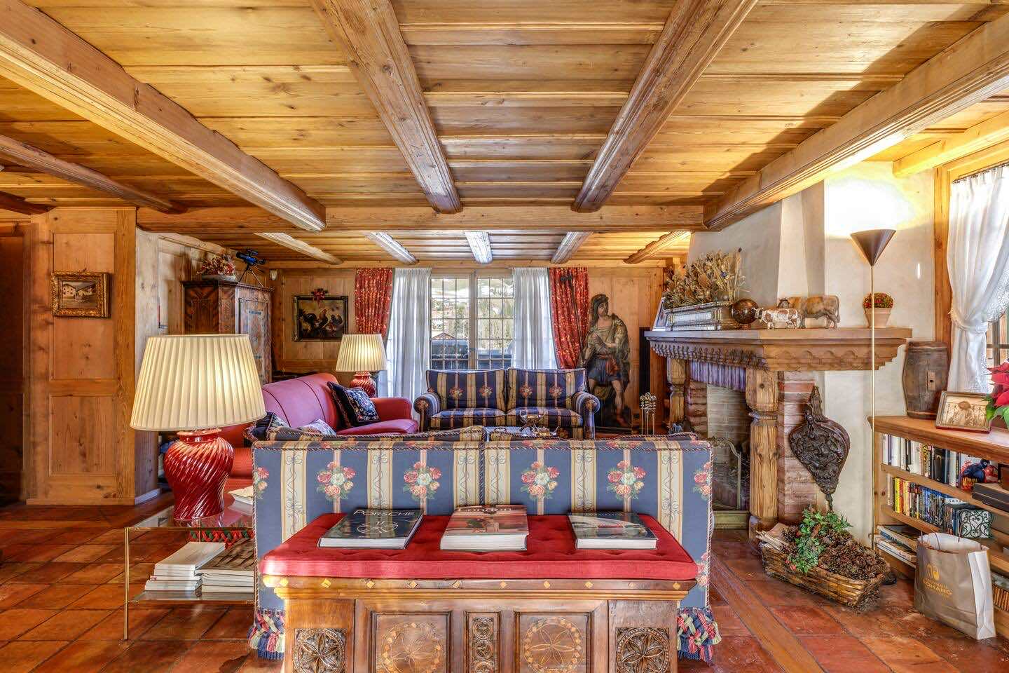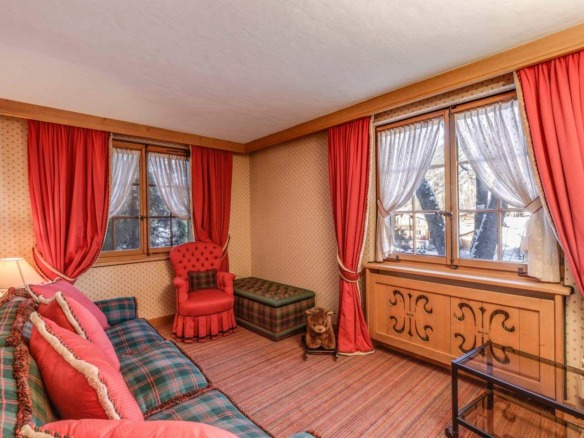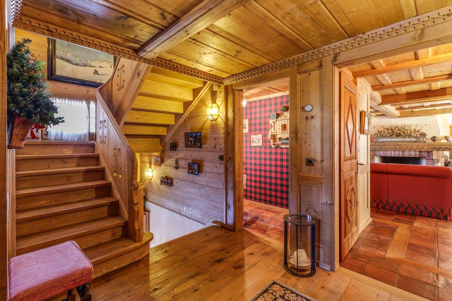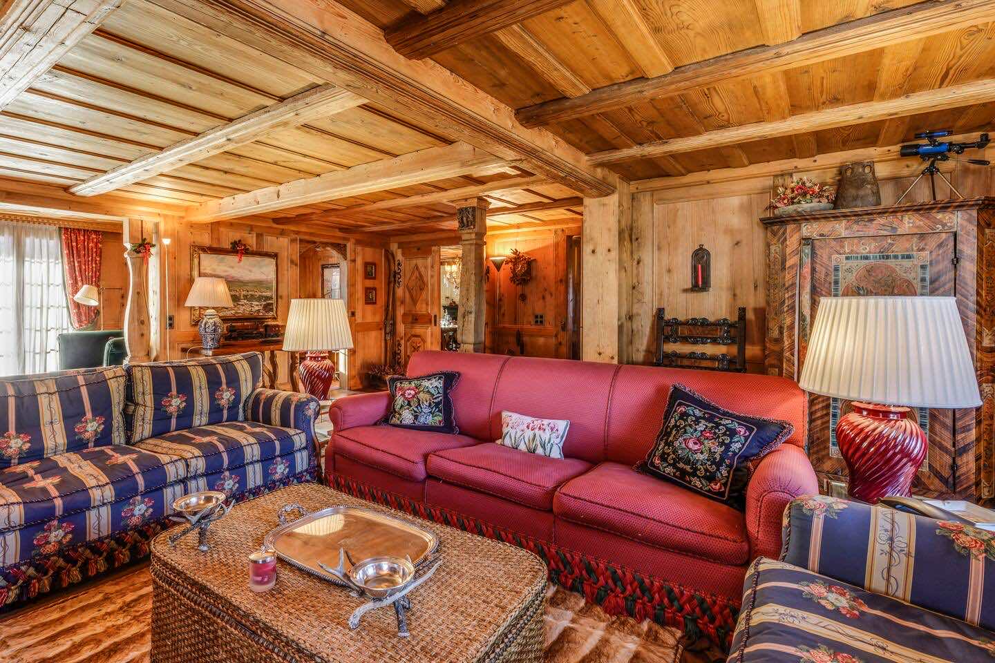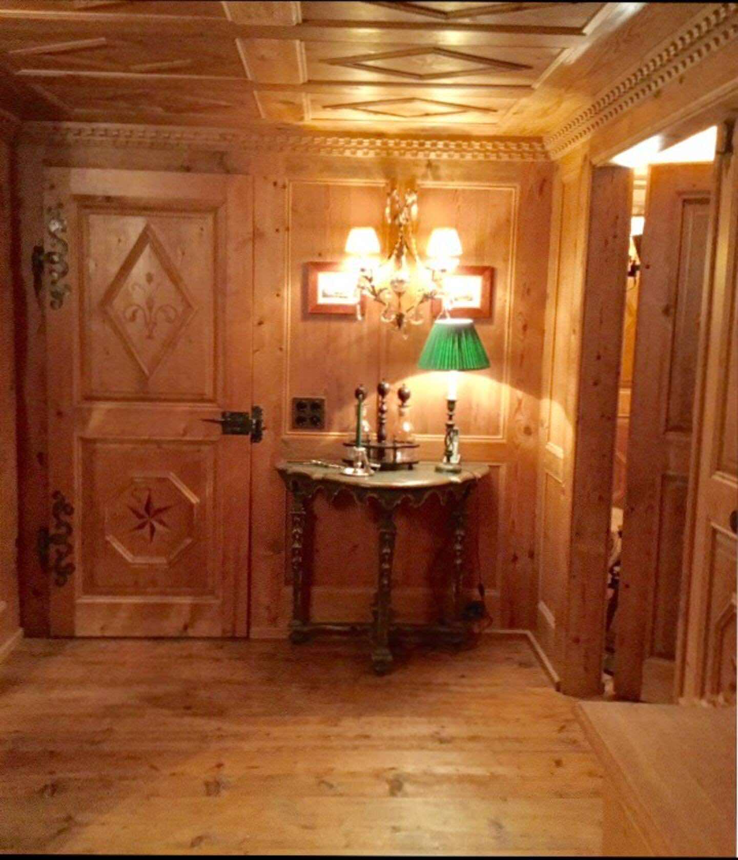 Crafted from antique wood with hand-inlaid ceilings and doors, the chalet evokes an atmosphere of warmth and authenticity. Throughout the home, fireplaces enhance the charm, creating intimate spaces perfect for winter evenings. The interiors are finished in a traditional alpine style, rich in detail and thoughtfully preserved.