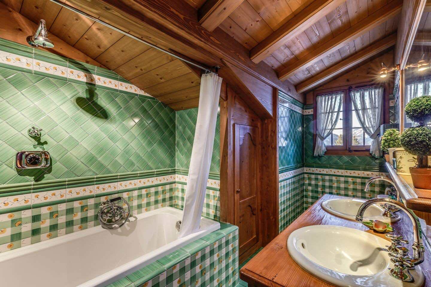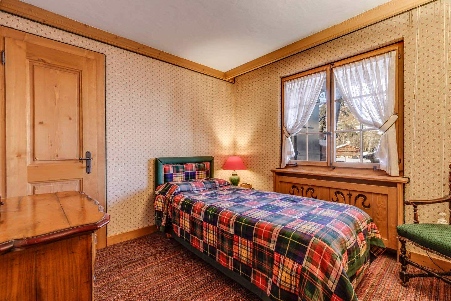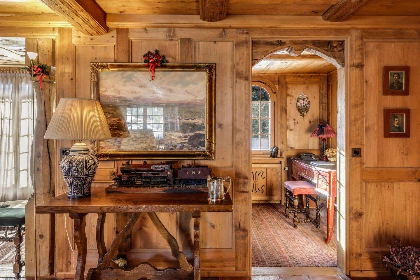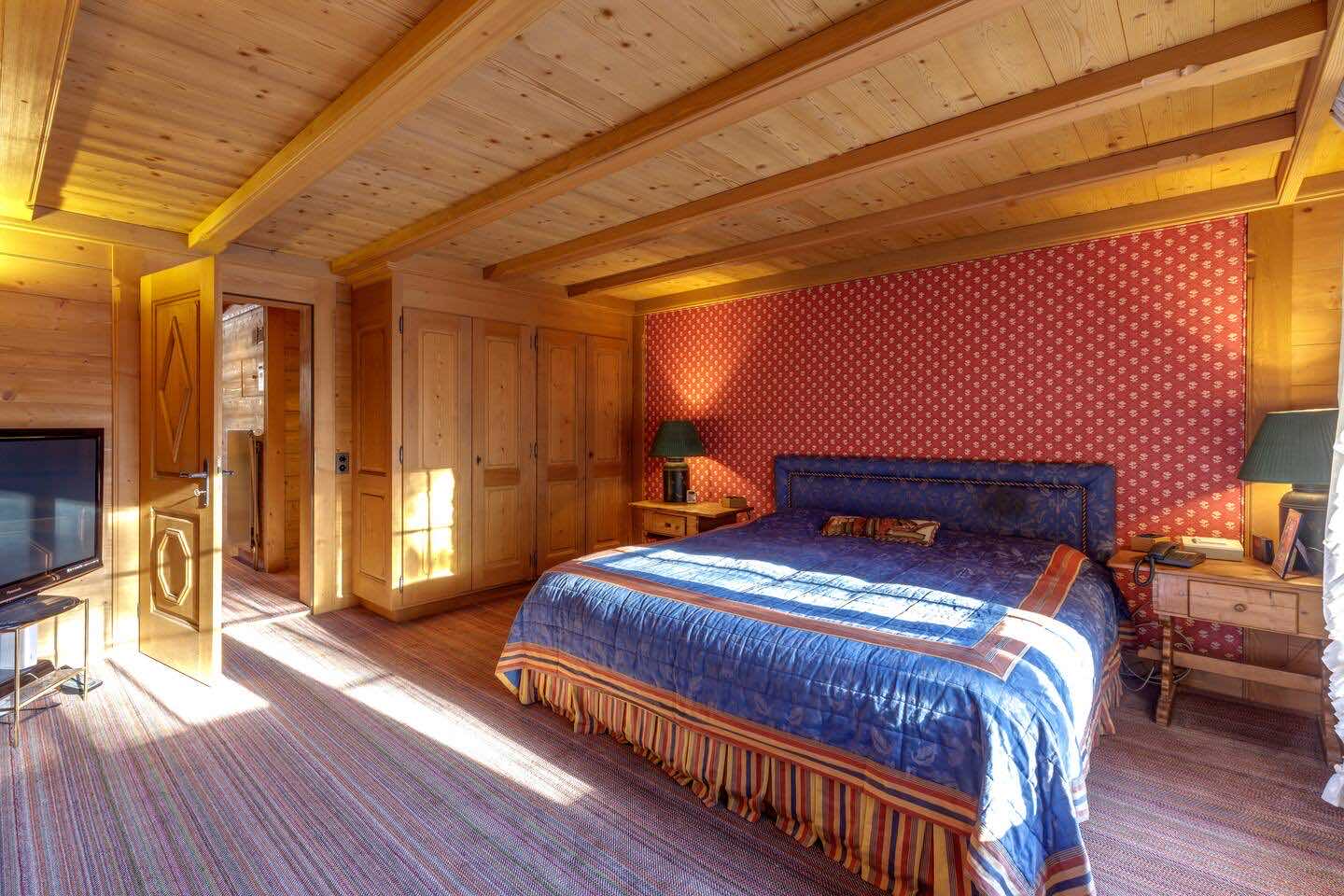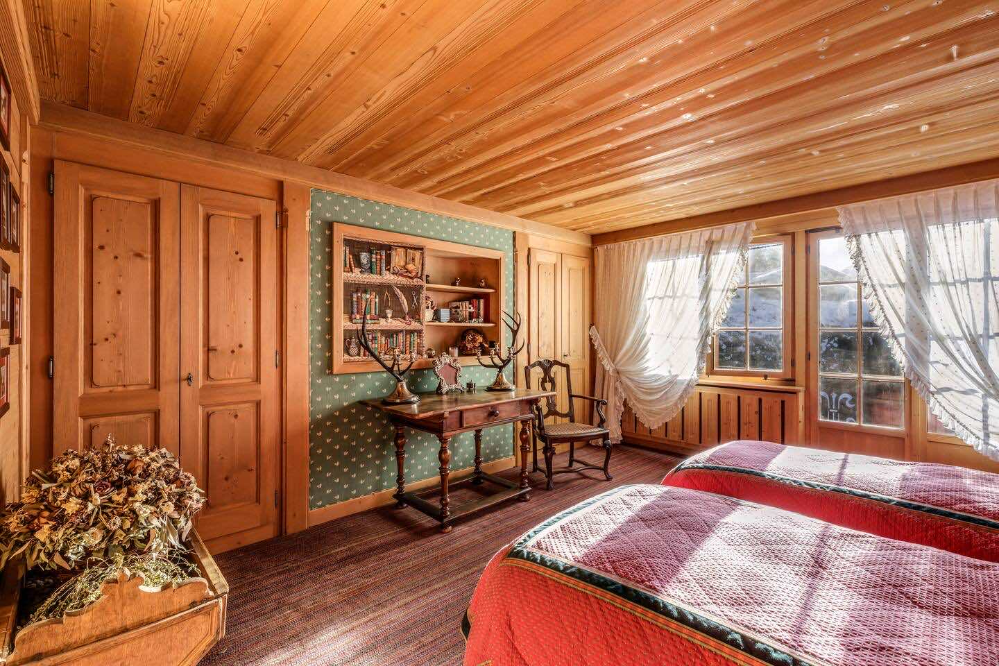 Crafted from antique wood with hand-inlaid ceilings and doors, the chalet evokes an atmosphere of warmth and authenticity. Throughout the home, fireplaces enhance the charm, creating intimate spaces perfect for winter evenings. The interiors are finished in a traditional alpine style, rich in detail and thoughtfully preserved.