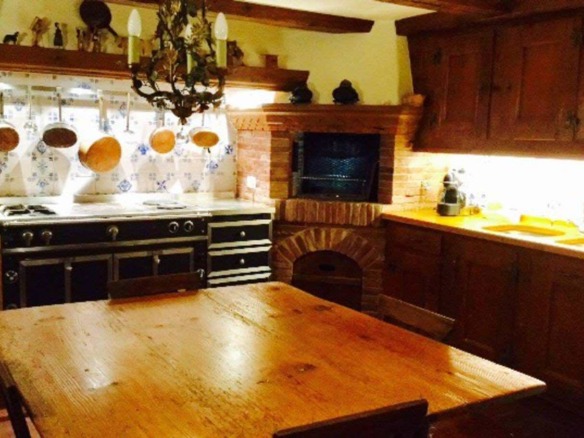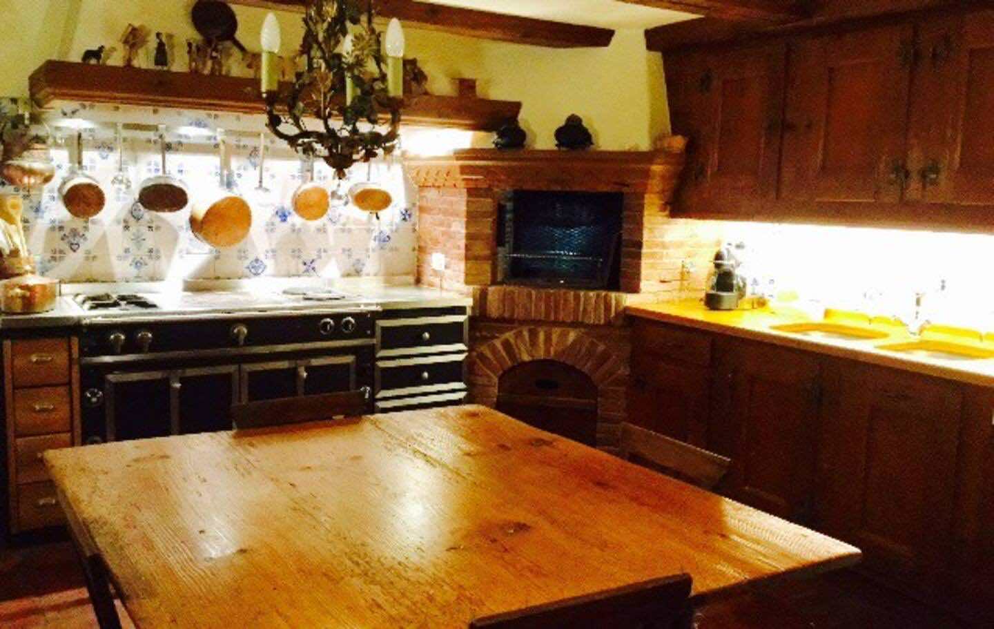 The main living area welcomes guests with plush seating arranged around a grand fireplace, offering a spacious yet cozy space to unwind. The adjoining dining room features a Delft-tiled fireplace and a generous hardwood table, ideal for memorable meals with family or friends. The kitchen, equally warm and inviting, is perfect for relaxed gatherings and features a redbrick charcoal grill—an ideal setup for sharing fondue or raclette on a snowy evening.