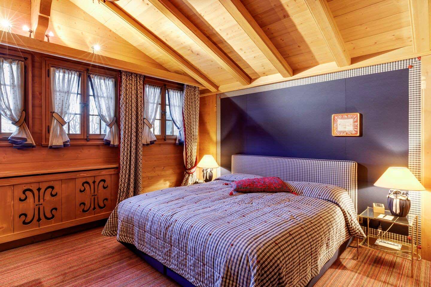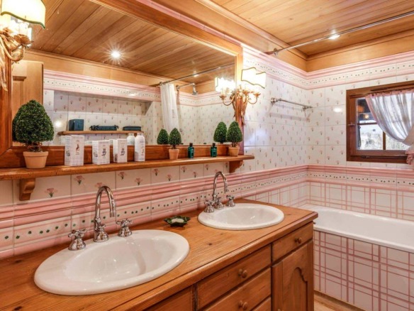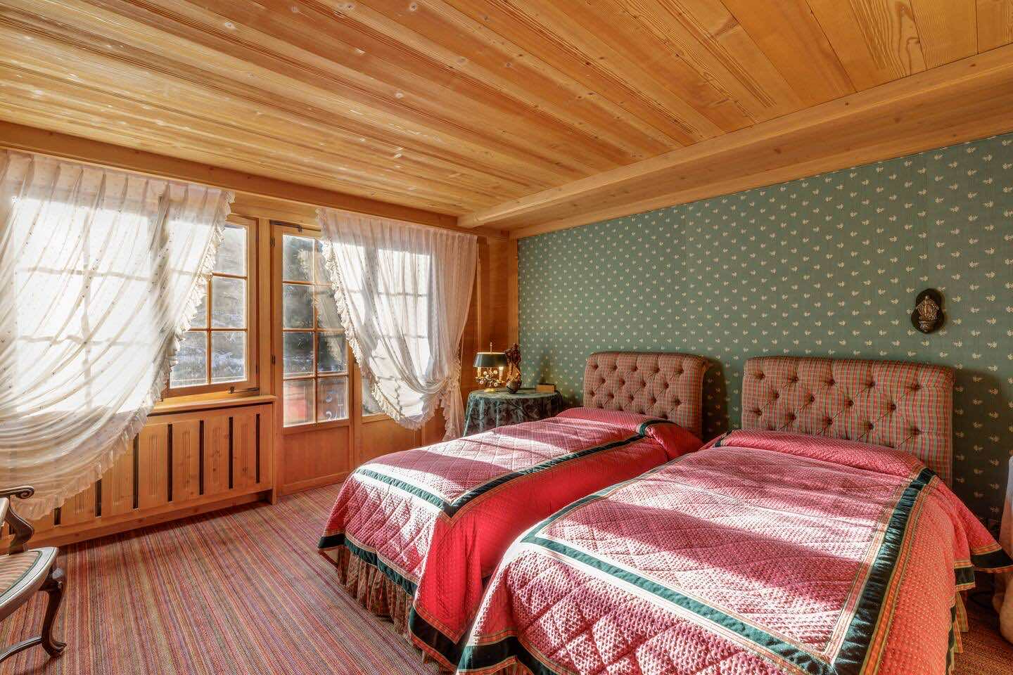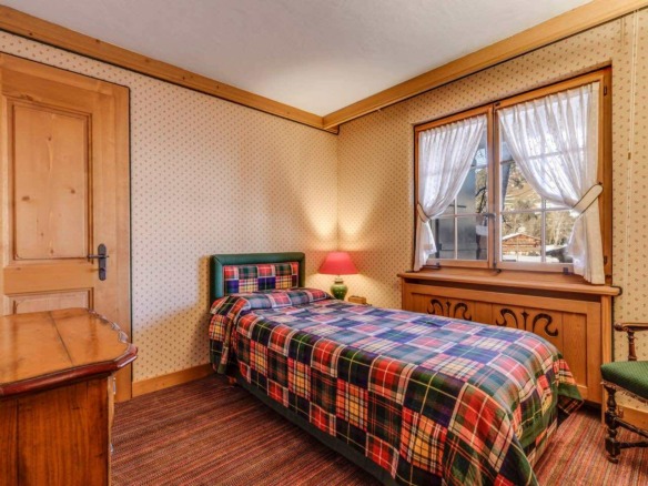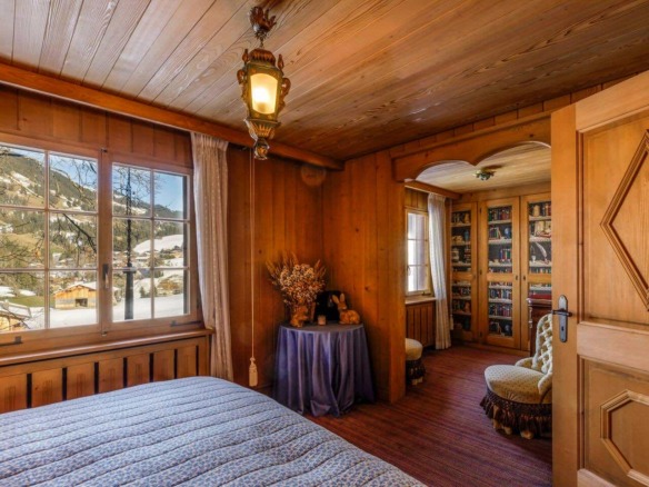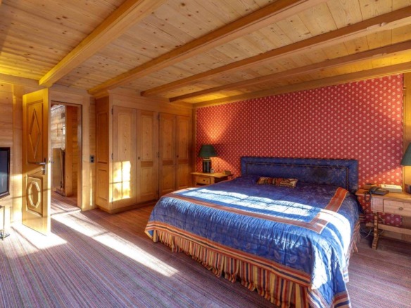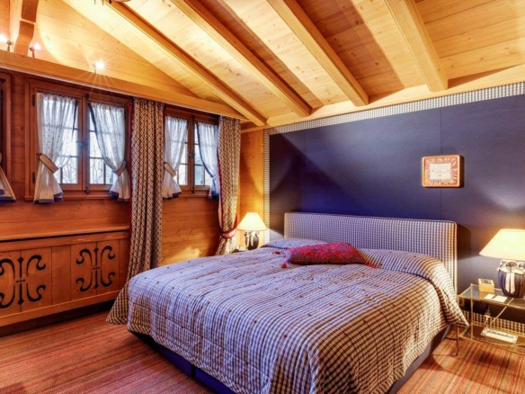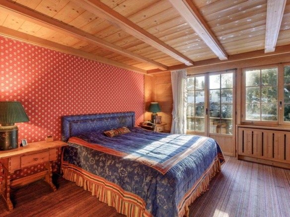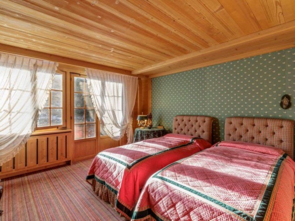 Spread across three levels, the chalet accommodates guests in seven beautifully styled bedrooms. The lower floor features three bedrooms and two bathrooms, along with a laundry area and direct access to the garage. Upstairs, four additional double bedrooms are arranged beneath exposed wooden beams, accompanied by three charming bathrooms. Each space is individually styled, with touches of French upholstery, floral prints, and classic alpine textiles.
