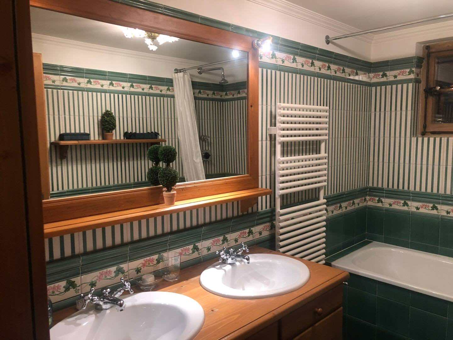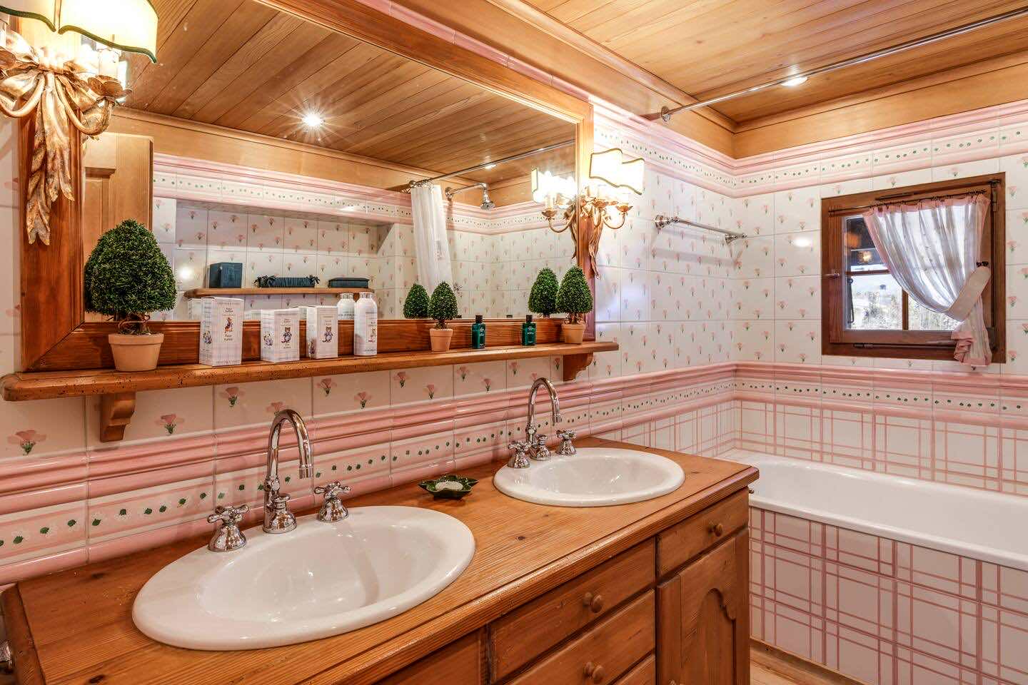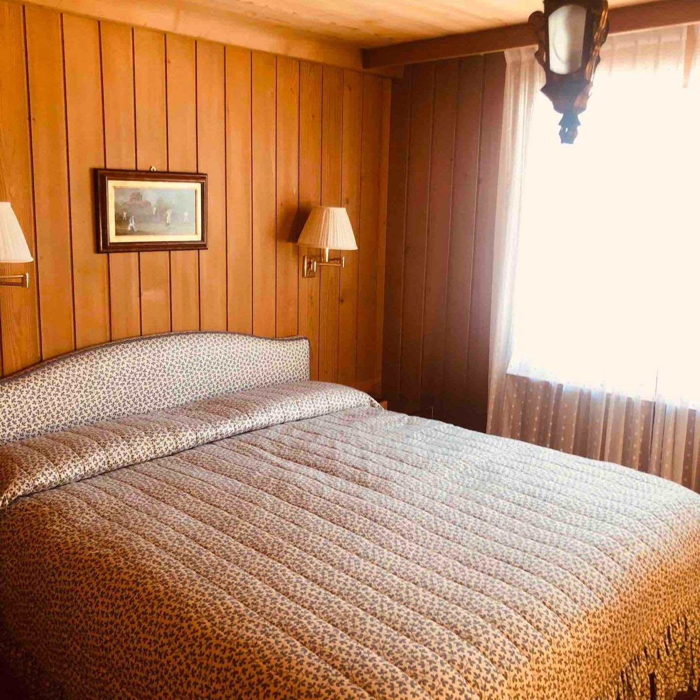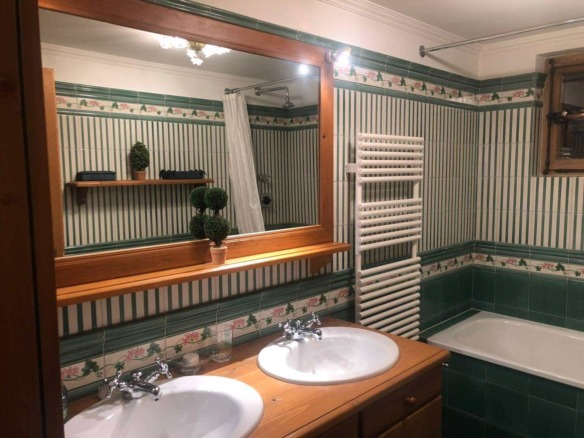 Spread across three levels, the chalet accommodates guests in seven beautifully styled bedrooms. The lower floor features three bedrooms and two bathrooms, along with a laundry area and direct access to the garage. Upstairs, four additional double bedrooms are arranged beneath exposed wooden beams, accompanied by three charming bathrooms. Each space is individually styled, with touches of French upholstery, floral prints, and classic alpine textiles.