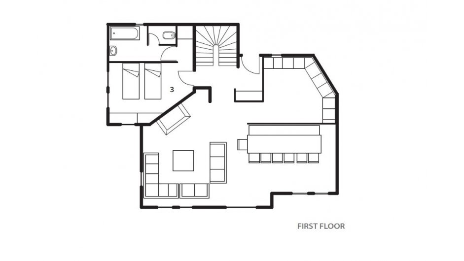 LIVING SPACES The main living area is crafted around classic alpine materials, with exposed stone, timber beams and a central wood-burning fireplace creating a warm, welcoming atmosphere. Comfortable seating offers a cosy space to unwind after skiing, while the open-plan layout connects the lounge to a casual dining space with banquette seating and ample room for the entire group. From the living room, the main balcony overlooks the pistes—perfect for non-skiers to enjoy the view or for watching your group ski home at the end of the day.