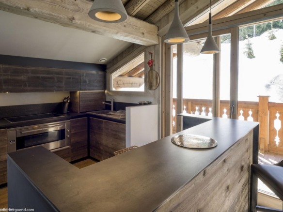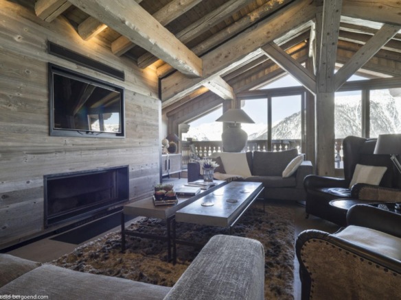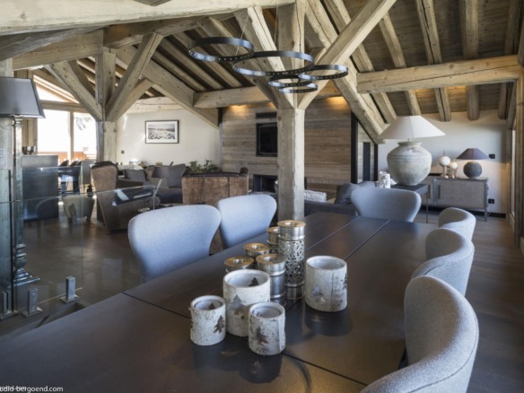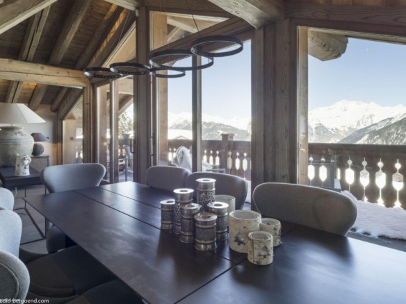 Spread across four thoughtfully designed levels, the chalet’s living spaces are located on the top floor to make the most of the panoramic mountain views. Soaring ceilings with pale timber beams frame a beautifully open-plan layout that includes a stylish lounge, dining area, bar, and kitchen. Calm neutral tones, soft textures, and ambient lighting create an atmosphere of understated sophistication. A sleek fireplace anchors the living area, while floor-to-ceiling windows and two balconies invite the alpine landscape inside.