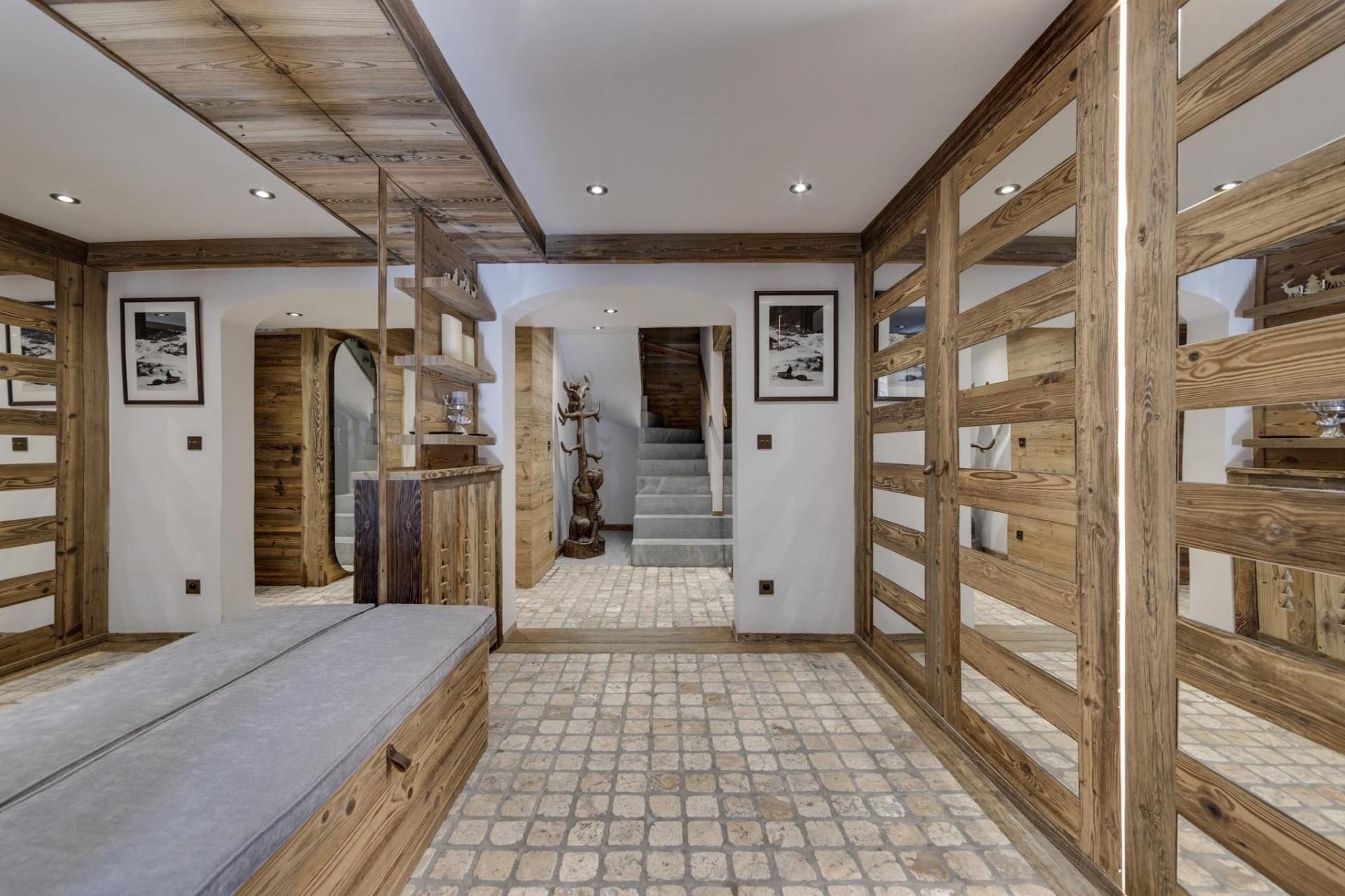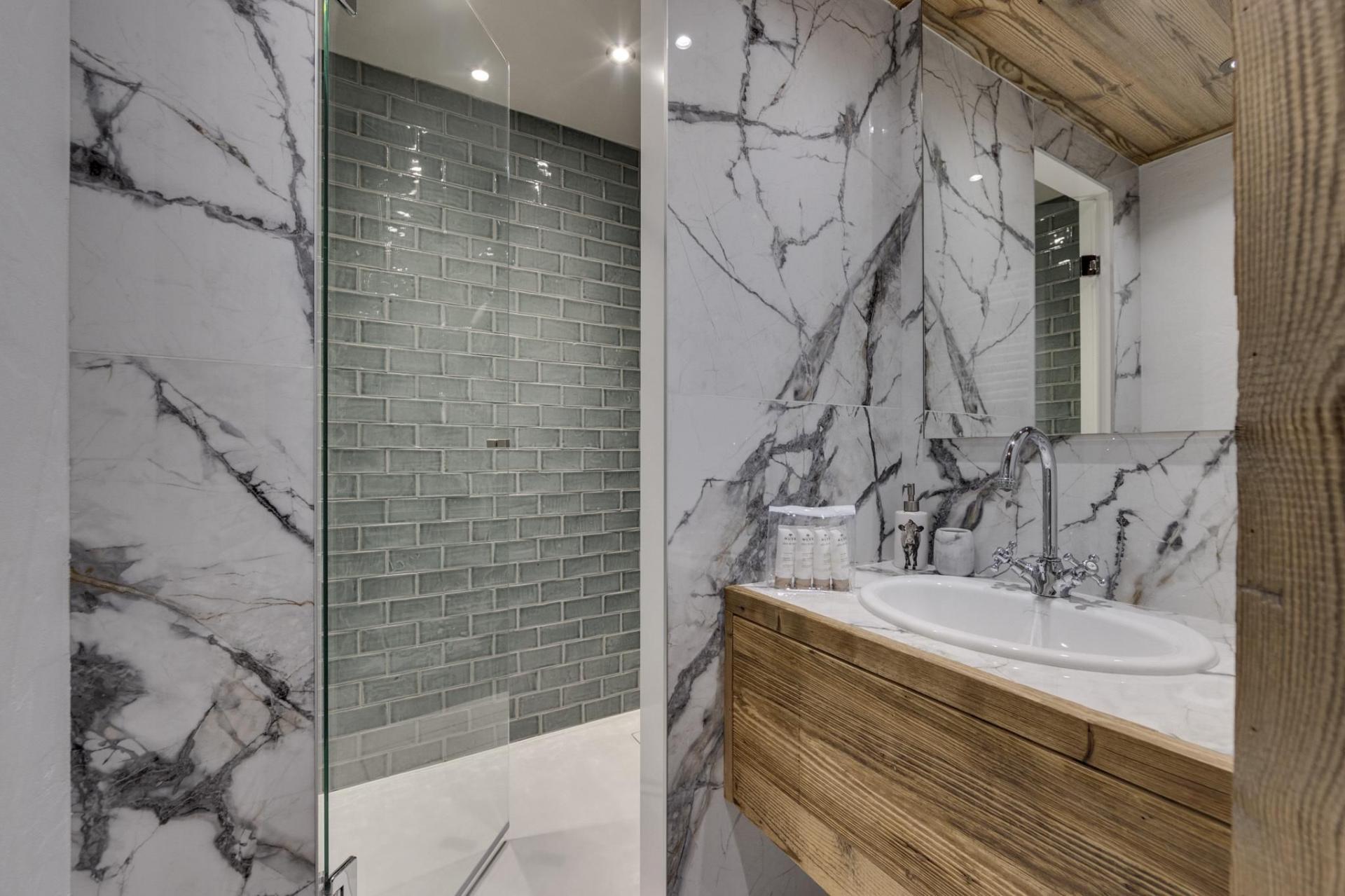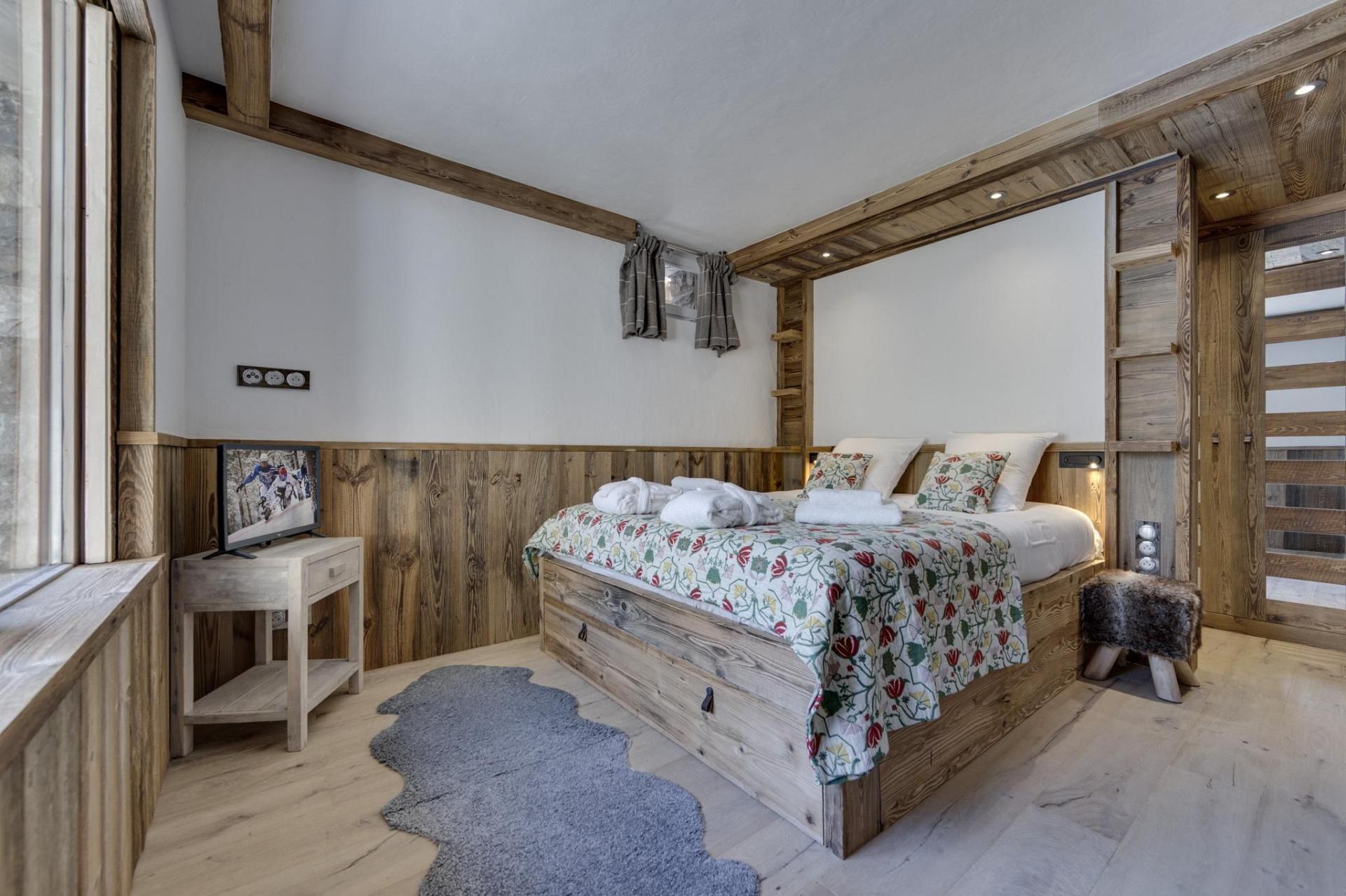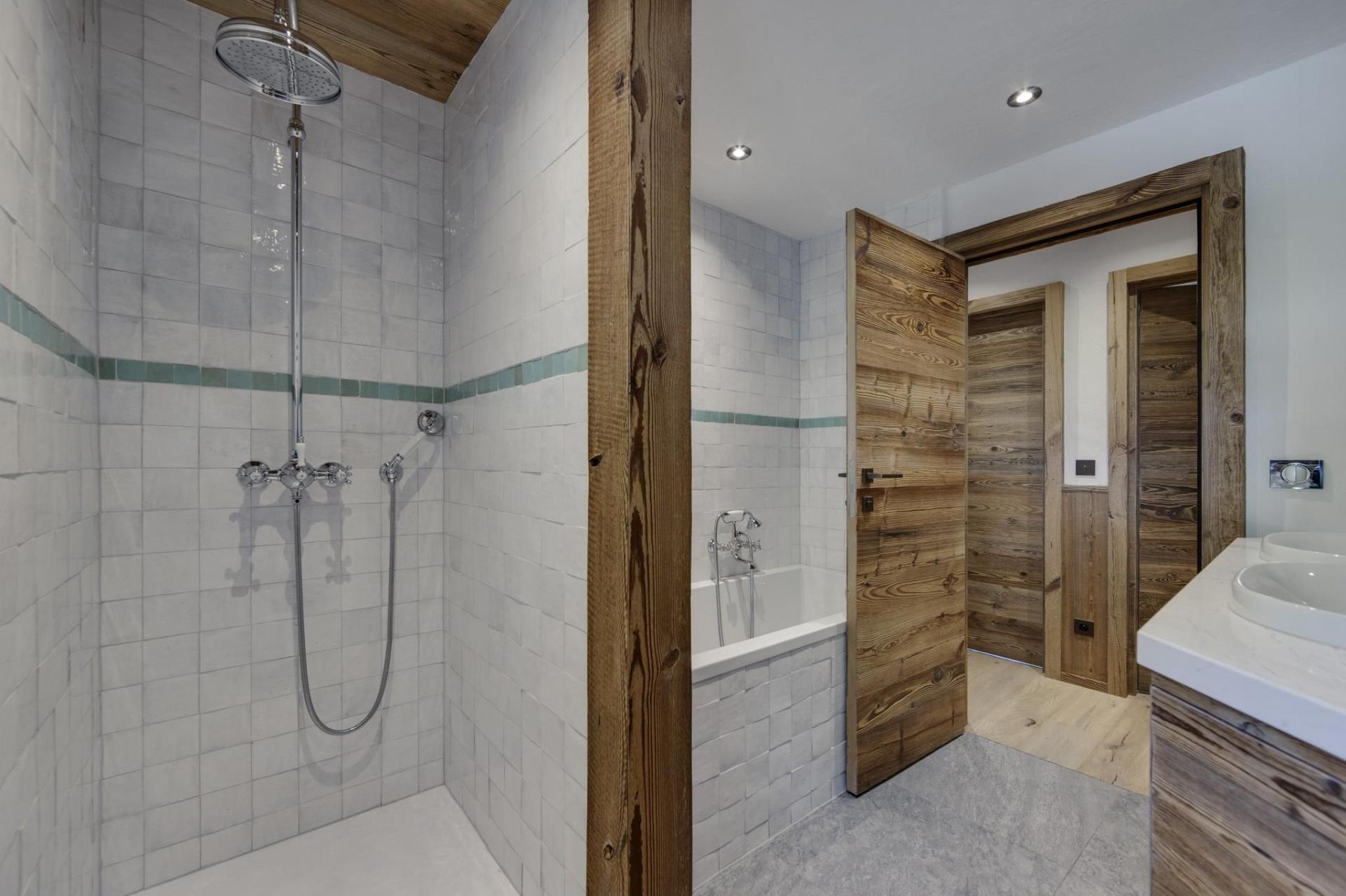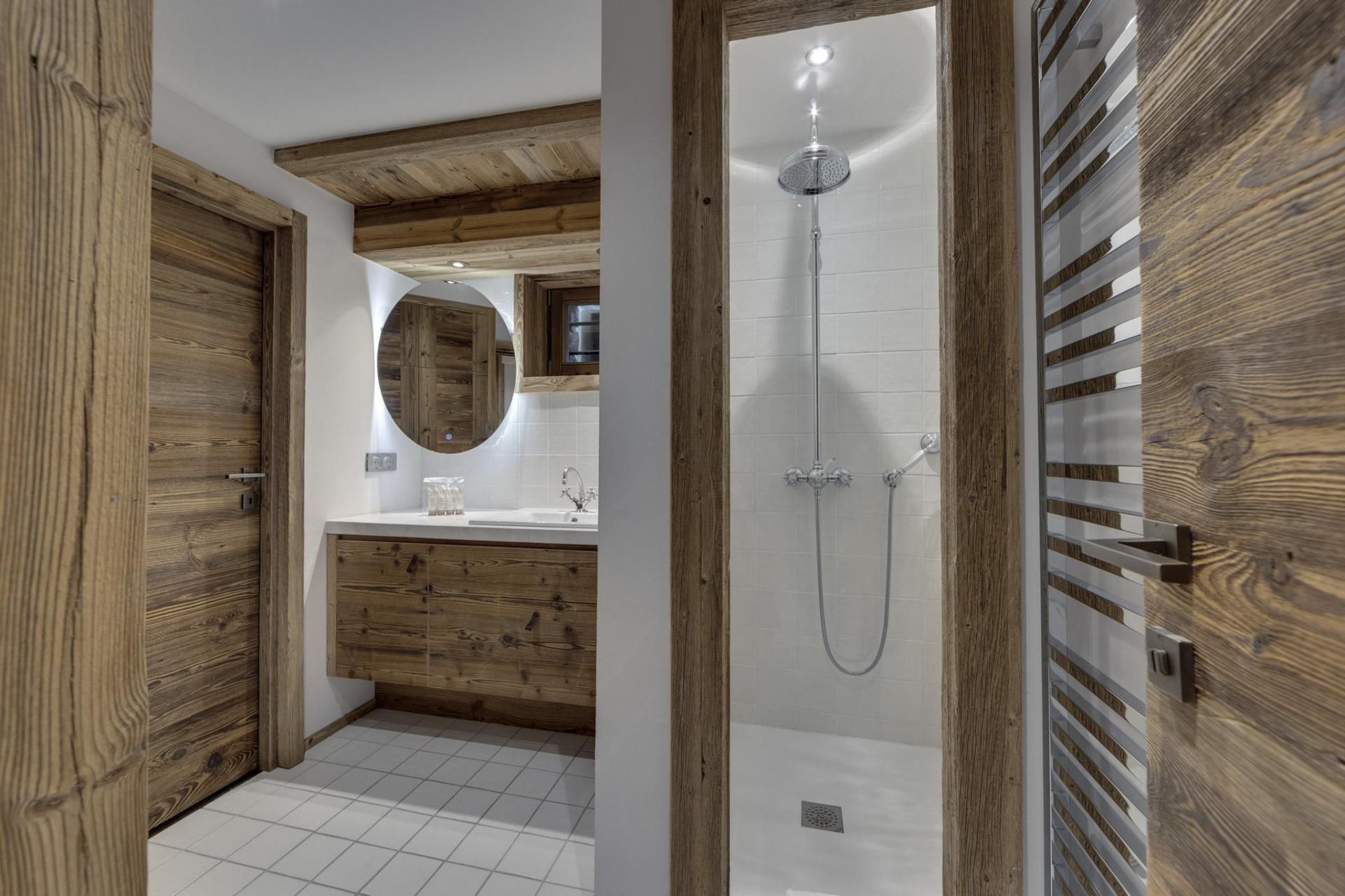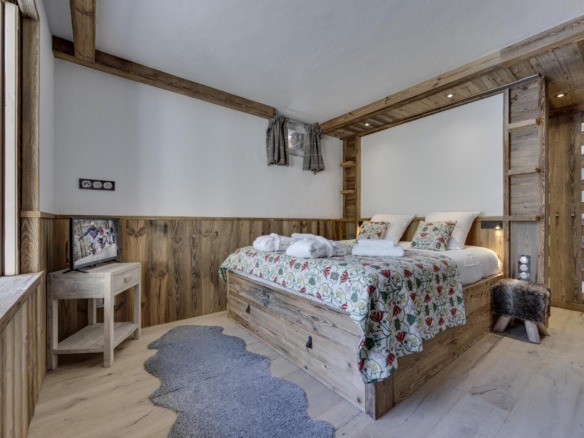 BEDROOMS Chalet Névé accommodates up to 14 guests across six bedrooms arranged over three levels. Each room follows the chalet’s rustic-luxury design, with warm wooden tones and plush finishes. While not all bedrooms are en-suite, there are independent bathrooms and separate toilets available across all three floors for convenience and comfort.