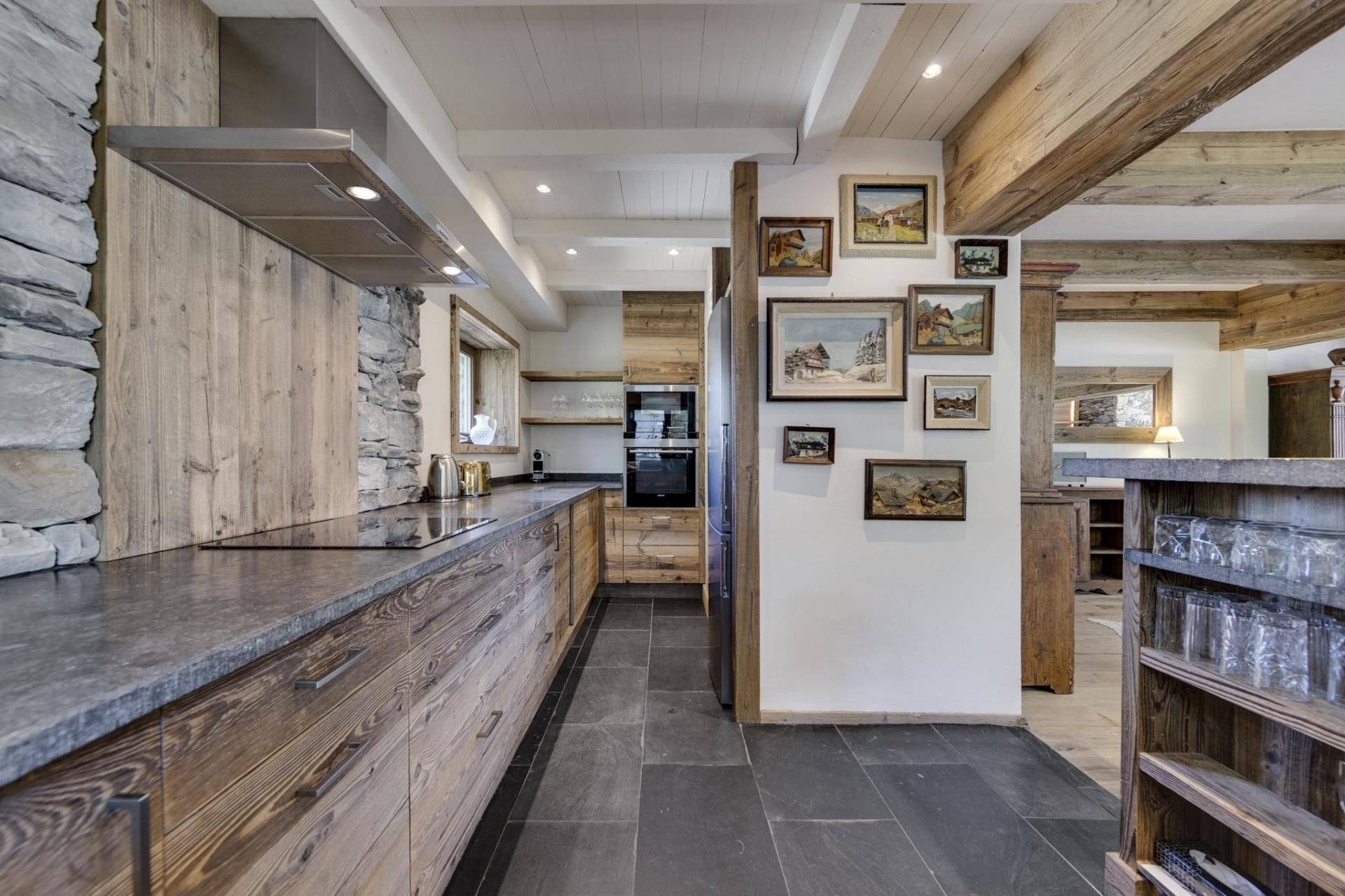 LIVING SPACES The main open-plan living area welcomes you with its inviting alpine atmosphere, connecting the lounge, dining area, and kitchen. Thoughtfully selected artwork, furnishings, and decorative details add character throughout. Guests can enjoy morning coffee at the breakfast table, long lunches at the large dining table, and evening drinks by the fireplace. The balcony offers a stunning spot for outdoor dining and après-ski moments against the backdrop of the French Alps.