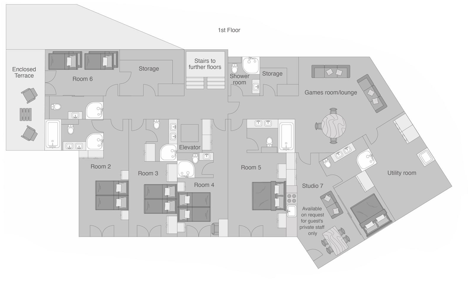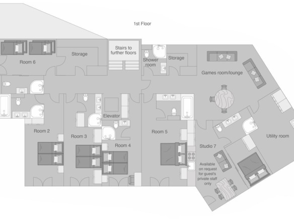 Chalet Norte comfortably sleeps up to 12 guests across six luxurious bedroom suites and a self-contained studio apartment. The top floor is reserved entirely for the stunning master suite, featuring a private balcony with sweeping alpine views. The remaining bedrooms on the upper ground floor include elegant doubles and twins, as well as a cozy bunk room ideal for families with children. Each suite is beautifully appointed, offering ultimate comfort and privacy.
