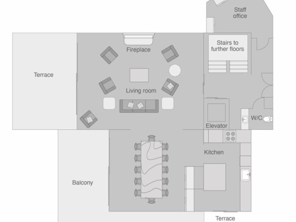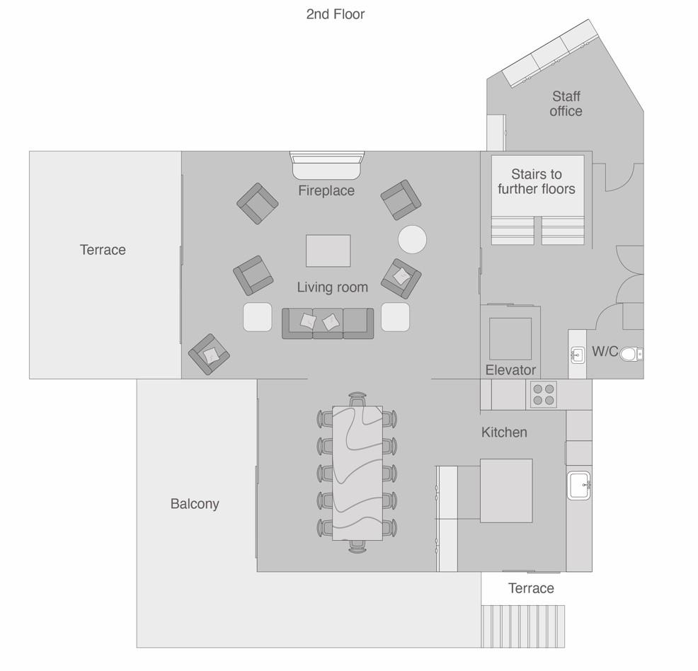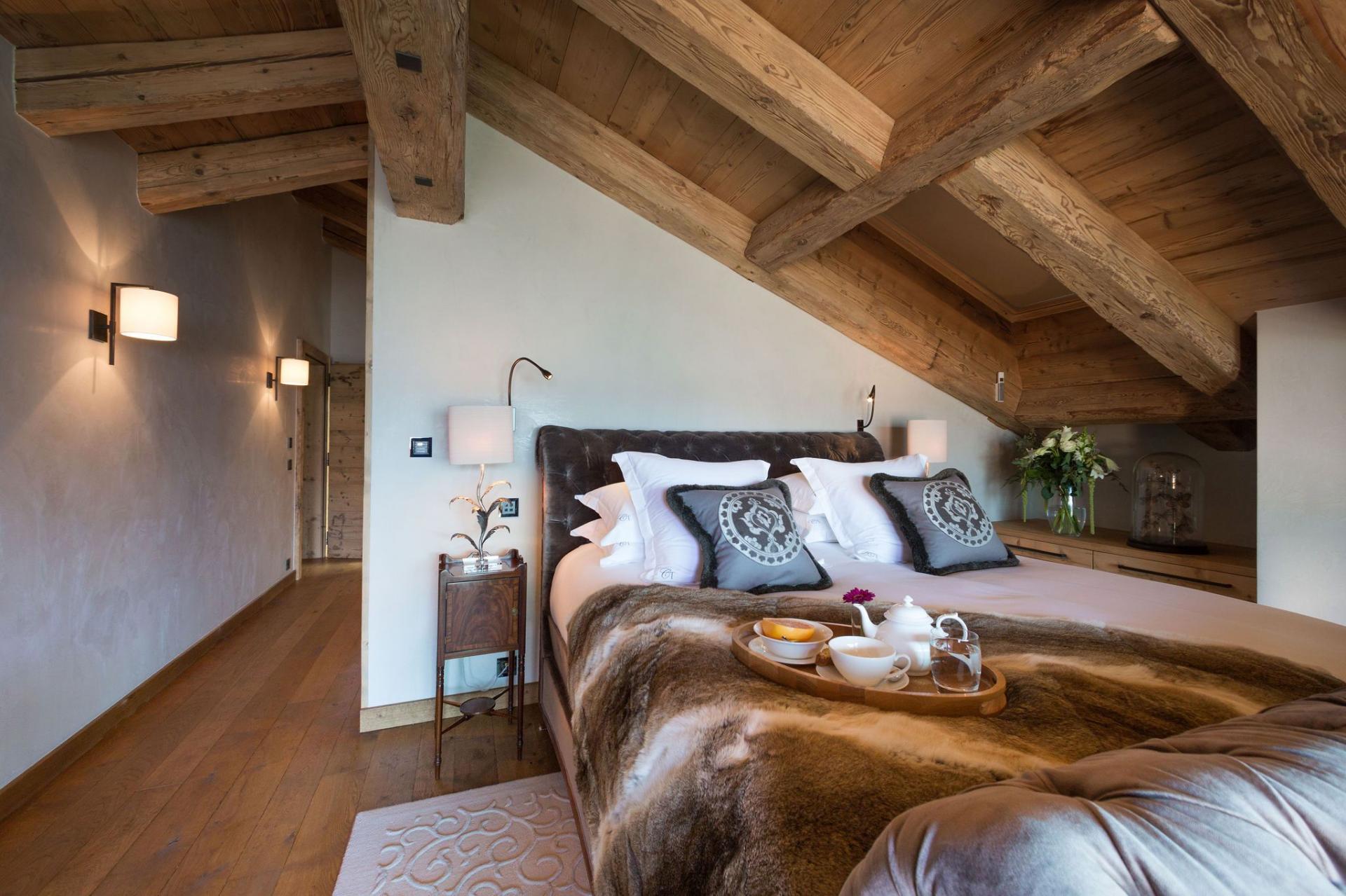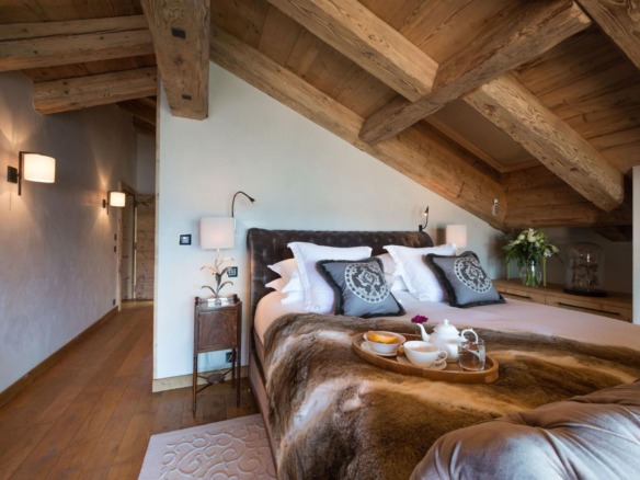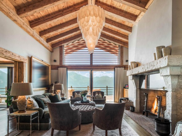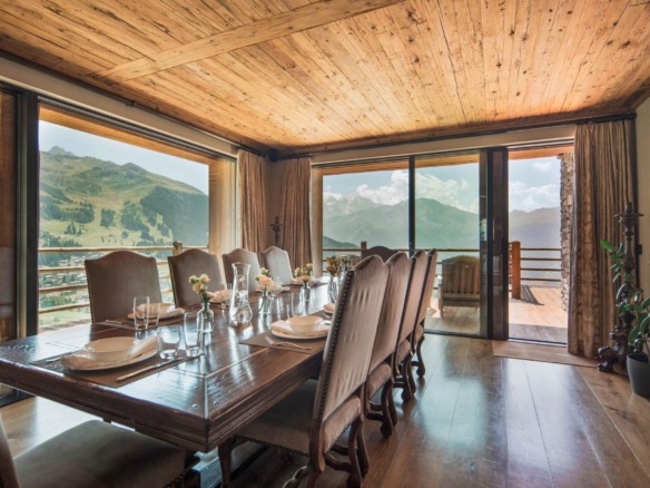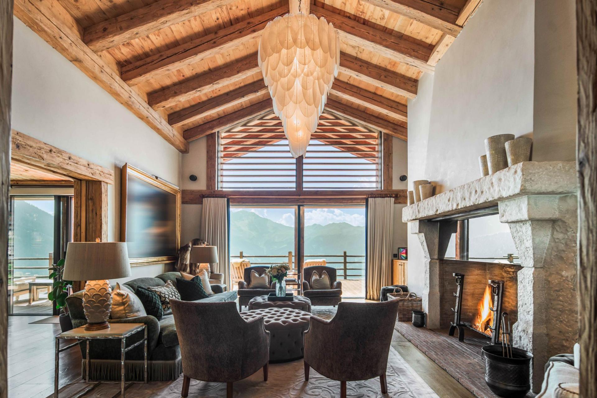 The chalet extends across four floors, all accessible via an internal lift. The main living area on the first floor exudes sophistication and warmth, featuring double-height ceilings, a stunning chandelier, and a majestic open fireplace framed by an elegant Renaissance painting. Expansive floor-to-ceiling windows fill the space with natural light and open onto wide terraces, inviting guests to admire the spectacular mountain vistas. The adjoining dining area hosts a grand formal table—perfect for indulgent dinners prepared by a private chef—while the adjacent balcony provides an idyllic spot for après-ski drinks under the stars.