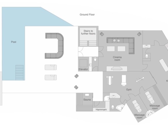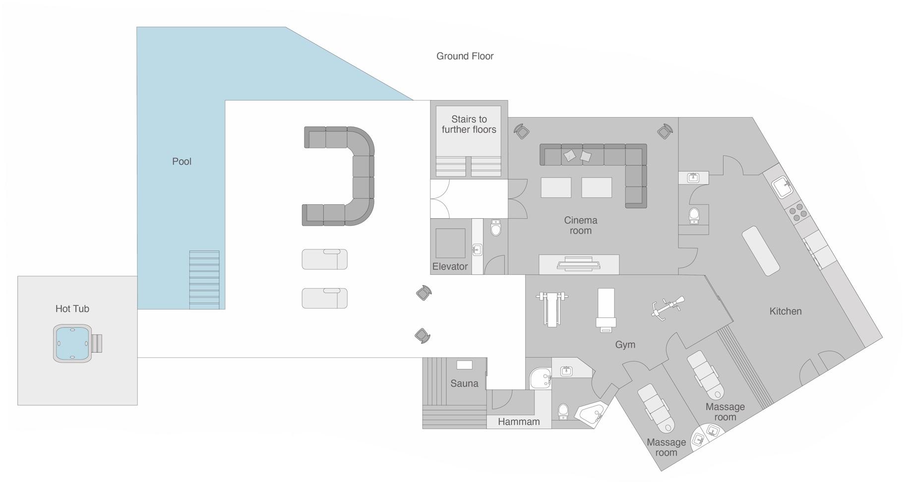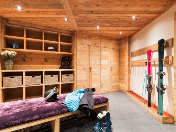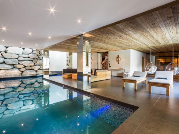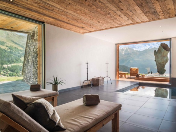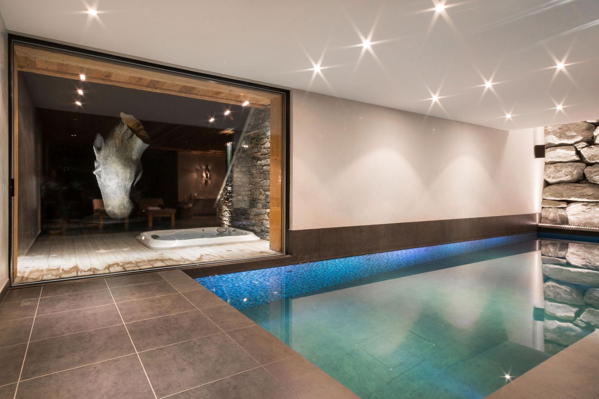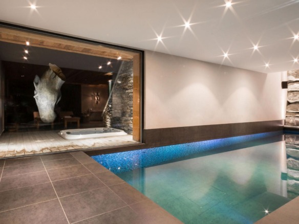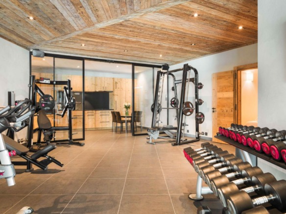 The chalet’s spa and wellness area, located on the lower ground floor, is nothing short of extraordinary. This serene sanctuary includes a large heated indoor pool surrounded by a peaceful relaxation zone, an outdoor hot tub with mountain views, a Hammam, sauna, and two massage rooms. A fully equipped gym ensures fitness routines can continue seamlessly, making this one of the most comprehensive private spas in Verbier.