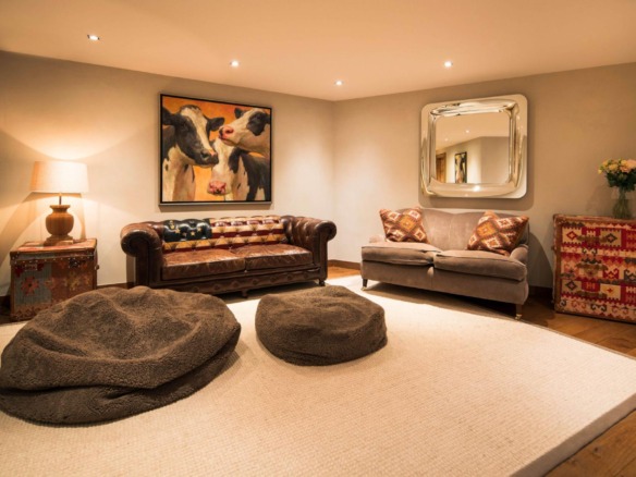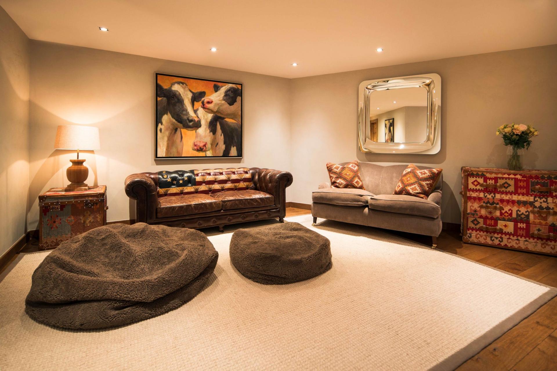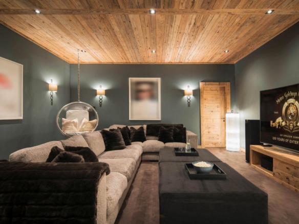 For more intimate gatherings, Chalet Norte offers additional lounge areas across the lower levels. A modern TV lounge on the lower ground floor provides a relaxed space for movie nights, complete with a secondary kitchen for snacks or drinks. A hidden wine cellar awaits for those wishing to explore a fine vintage. The studio apartment within the chalet adds further living space, ideal for guests seeking extra privacy.