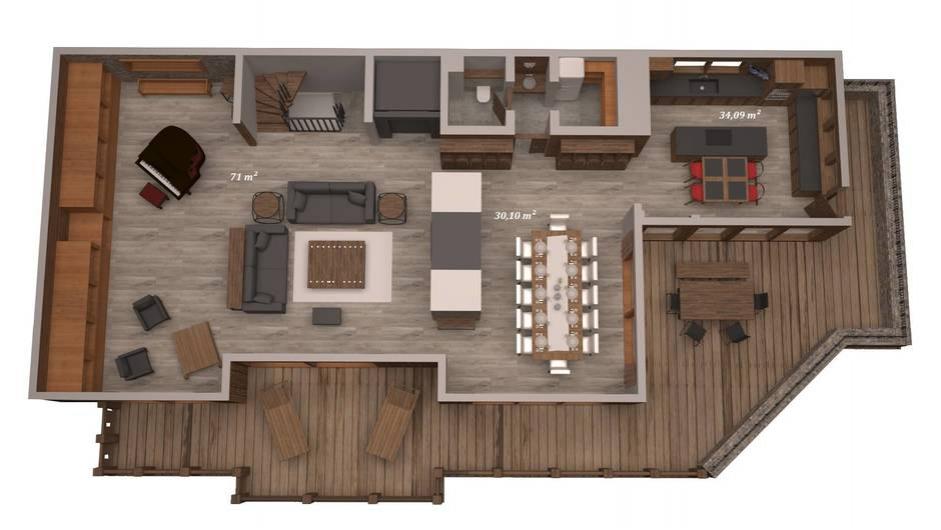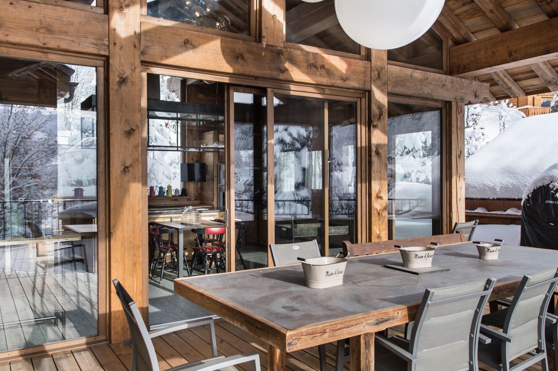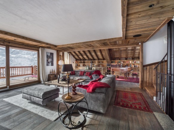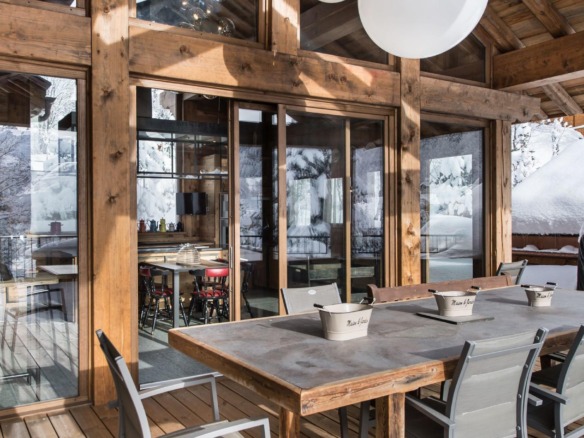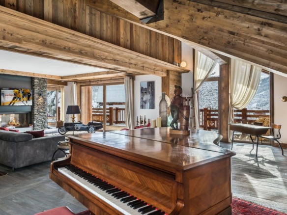 The chalet’s open-plan living area is the heart of the home. Framed by floor-to-ceiling bay windows, the space is flooded with natural light and panoramic views of the surrounding peaks. Neutral tones of grey and beige set a calm and elegant tone, complemented by plush sofas and contemporary furnishings. A grand piano and reading corner lend a cultured touch, while a striking stone fireplace separates the lounge and dining spaces, filling the room with a soft, inviting glow. The dining area leads to a modern kitchen, fully equipped and able to be closed off by a sliding door for privacy. All living areas open onto a generous south-facing terrace, perfect for alfresco dining or simply admiring the sweeping mountain views.