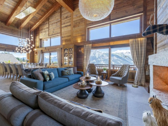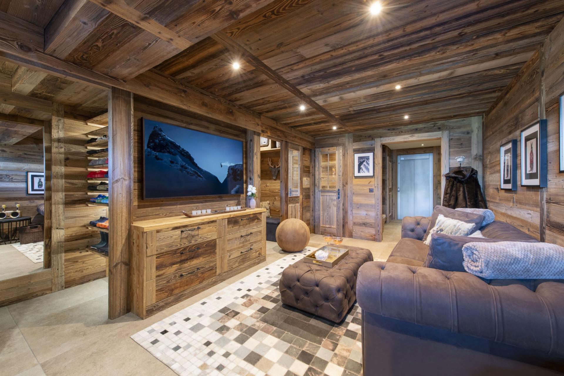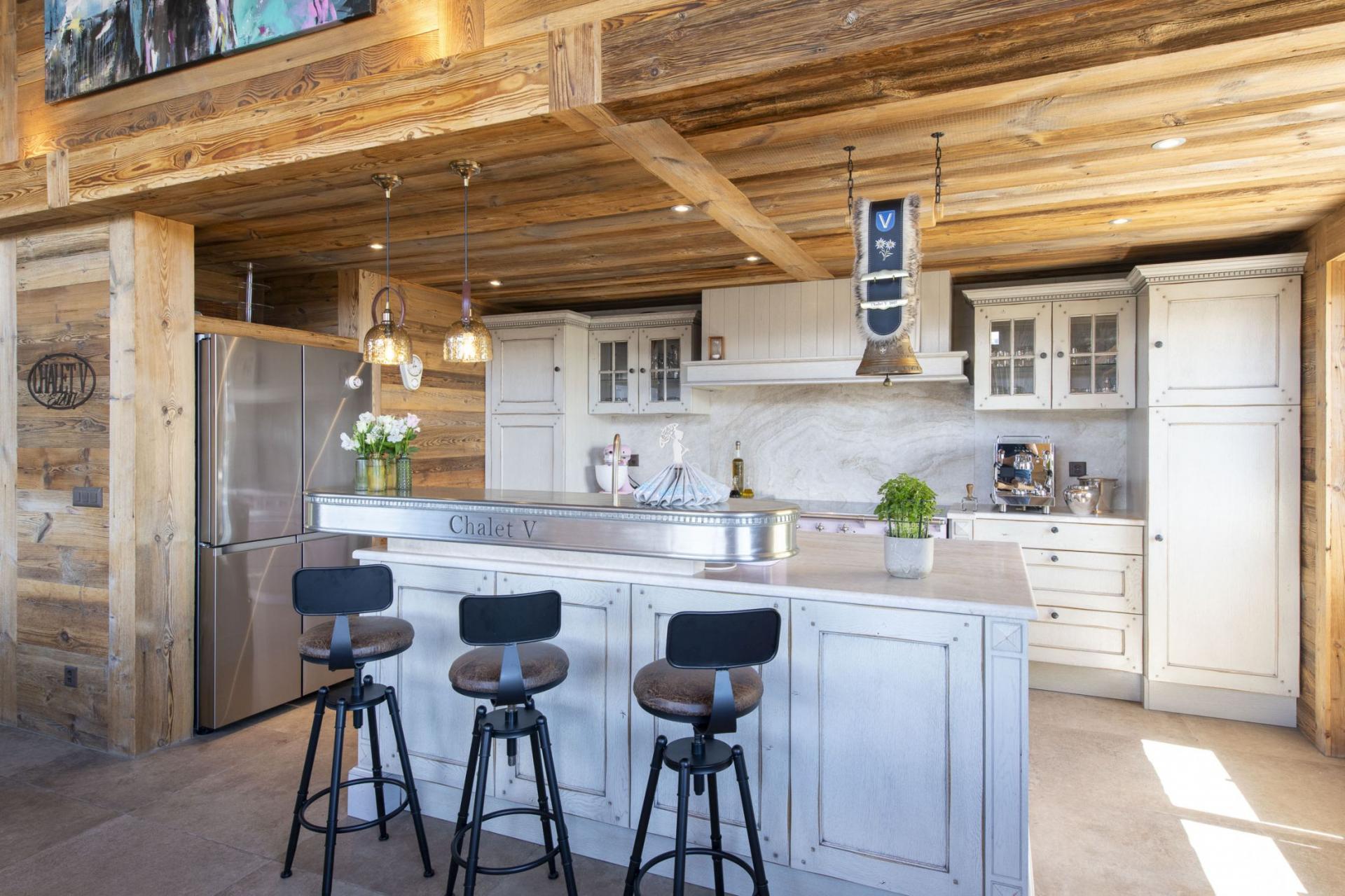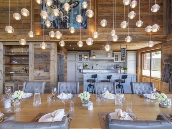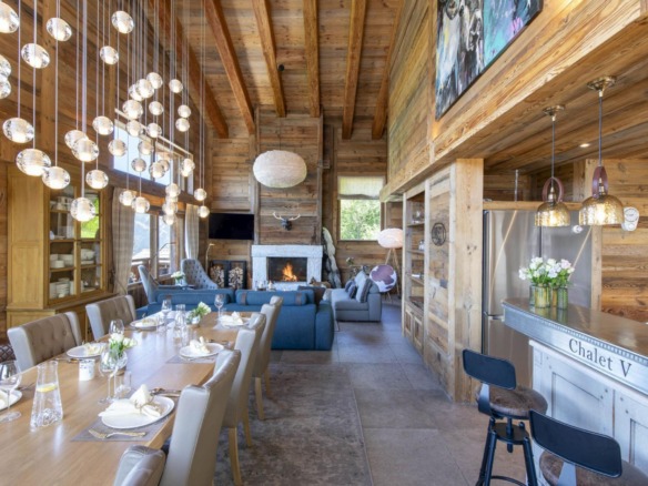 The interiors of Chalet V feature a refined mix of natural wood and stone, creating an atmosphere that balances authenticity with understated sophistication. The open-plan living area is framed by high vaulted ceilings and large windows that flood the space with natural light. A grand stone fireplace anchors the lounge, where plush sofas invite quiet moments of relaxation. The adjoining dining area, centred around a large wooden table, is perfect for shared meals, while the modern kitchen with its breakfast bar offers an informal gathering spot for morning coffee or evening conversation. A separate TV lounge provides a cosy setting for movie nights.