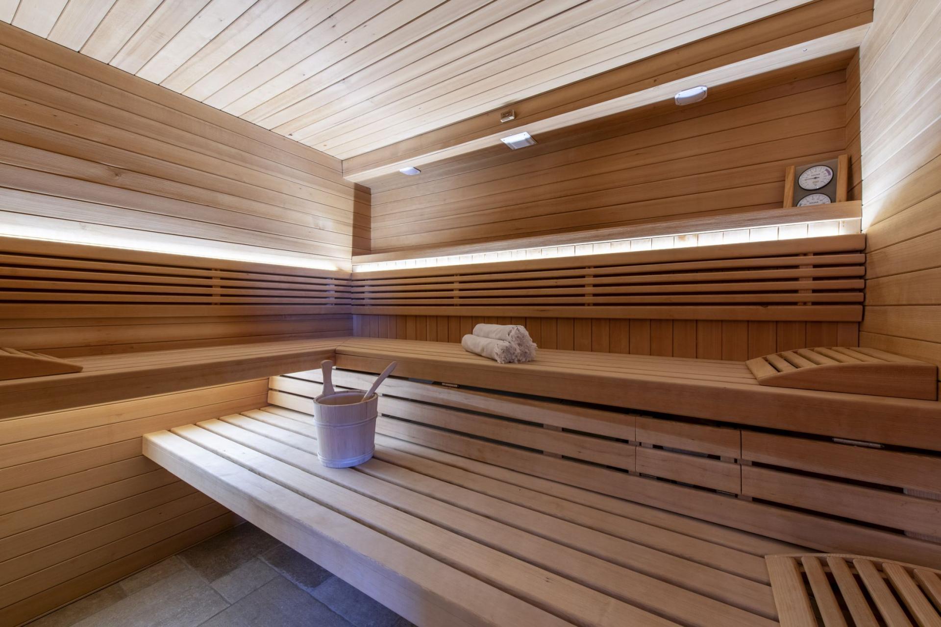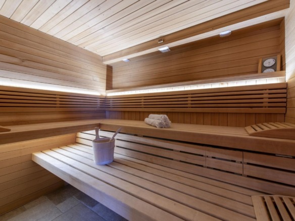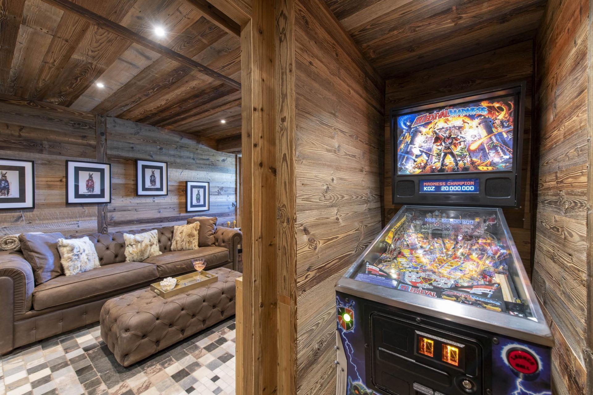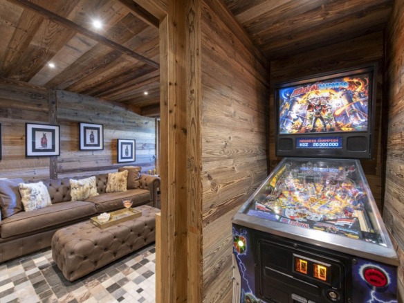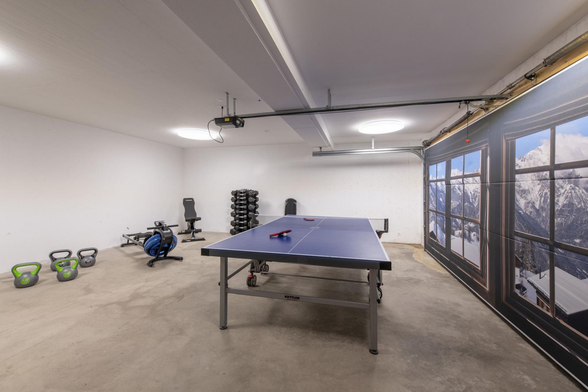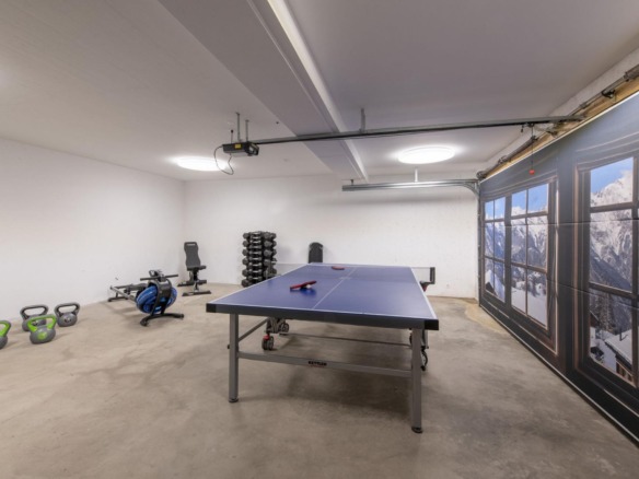 Chalet V’s wellness area adds an indulgent touch to your stay. A heated outdoor swimming pool invites refreshing morning laps, while the hot tub and sauna offer peaceful retreats for post-ski or post-hike recovery. Fitness enthusiasts can make use of the rowing machine and free weights, while the table tennis area adds a playful element for group entertainment.