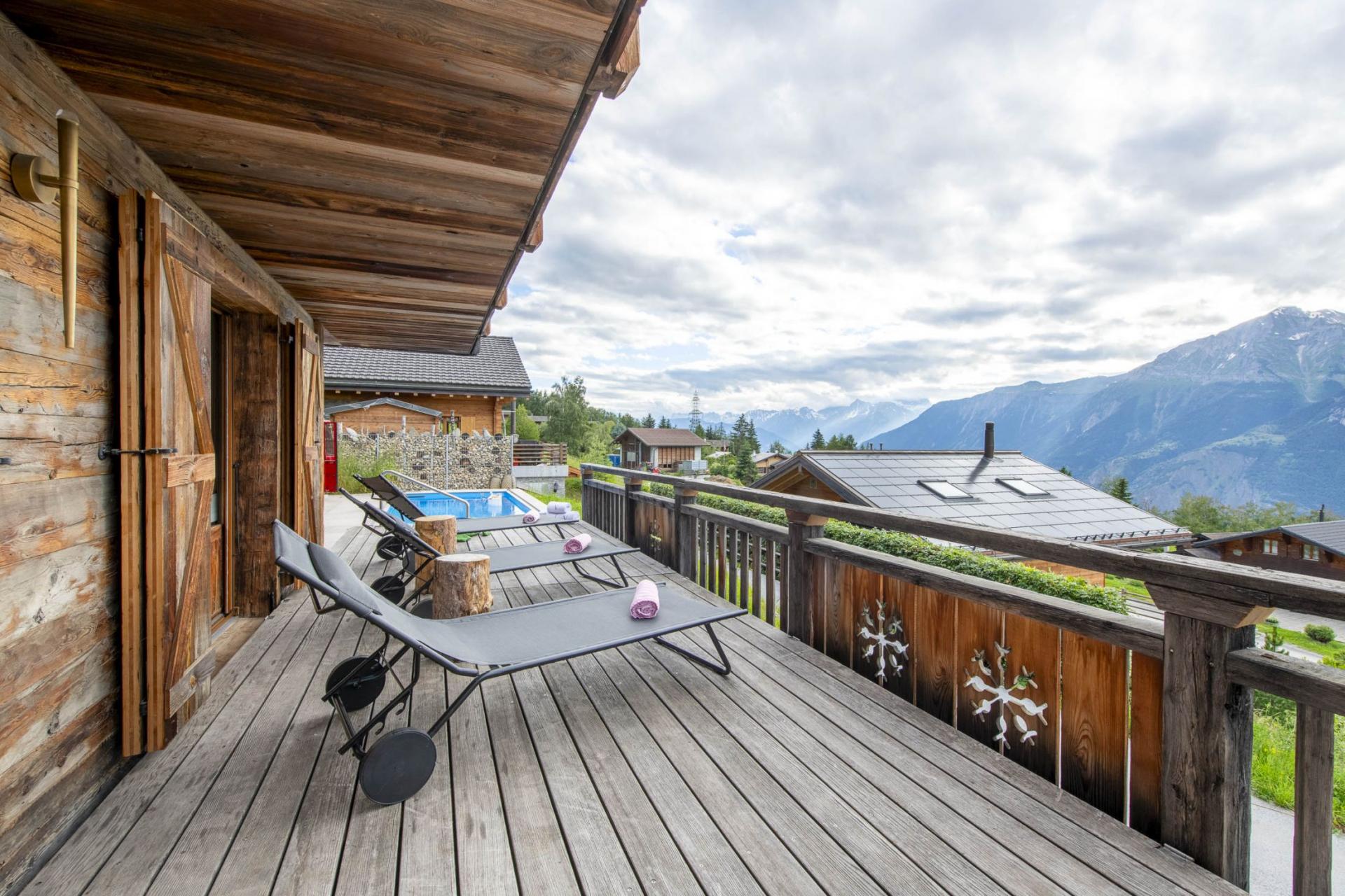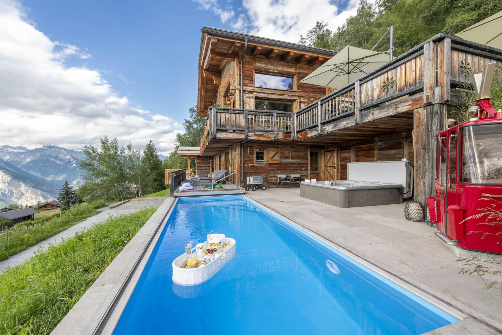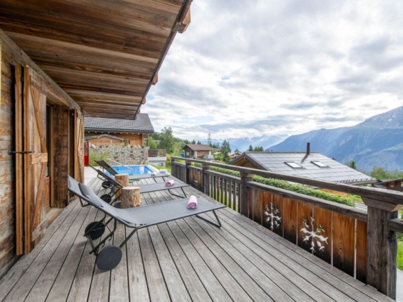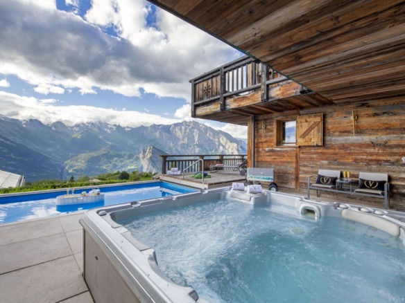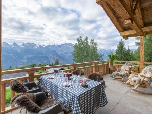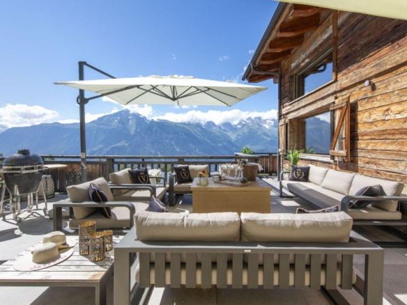 The chalet’s spacious terrace offers an exceptional vantage point for admiring Verbier’s mountain panorama. Comfortable outdoor seating, a barbecue, and an alfresco dining setup make it the ideal setting for summer evenings spent with family and friends. Several terraces and garden areas provide additional space to relax and soak in the mountain air.