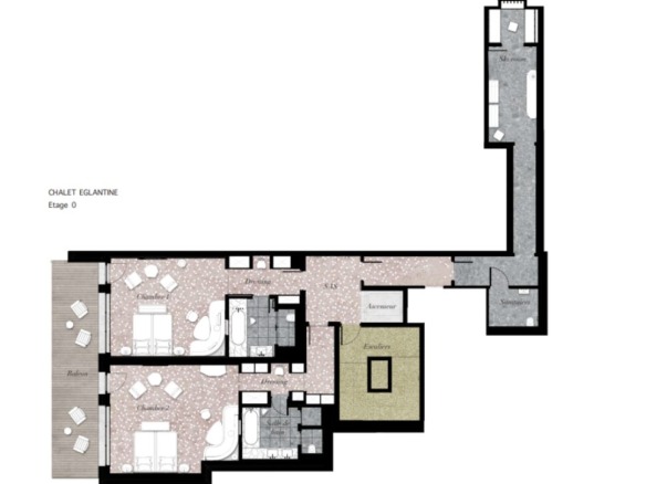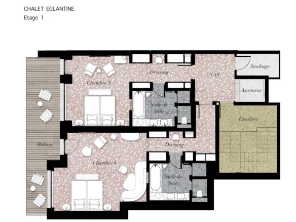 Bedrooms Chalet Eglantine offers four generous double master bedrooms, each with its own en-suite bathroom featuring both bath and shower, a balcony, and a lounge corner. Two rooms are located on the ground floor, with two more on the floor above. All bedrooms can be configured as twin rooms, allowing flexible arrangements for families or mixed groups. Additional beds can be added to accommodate up to four extra guests.