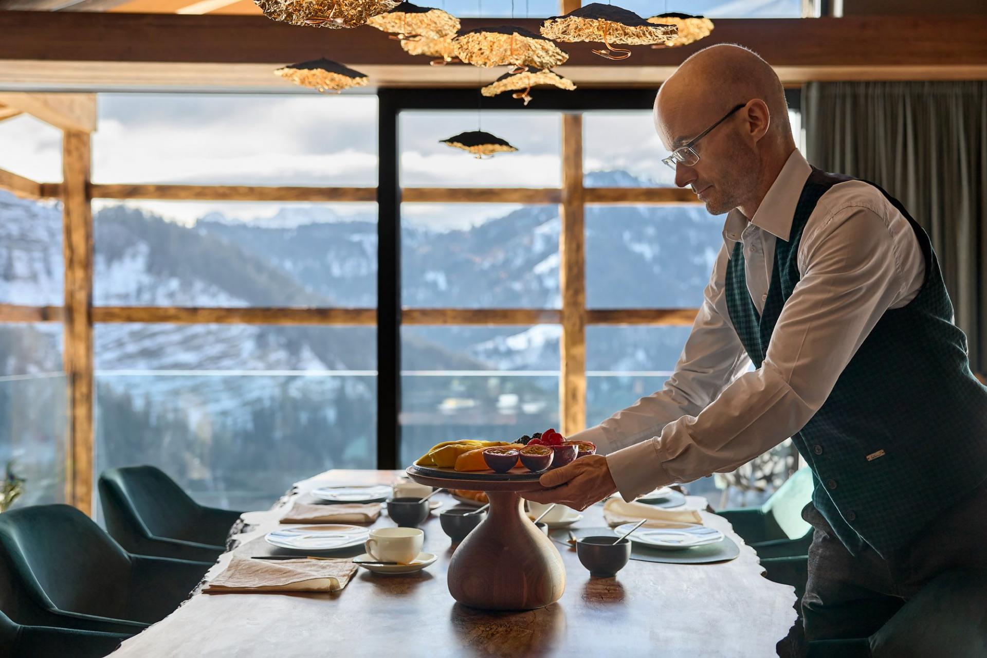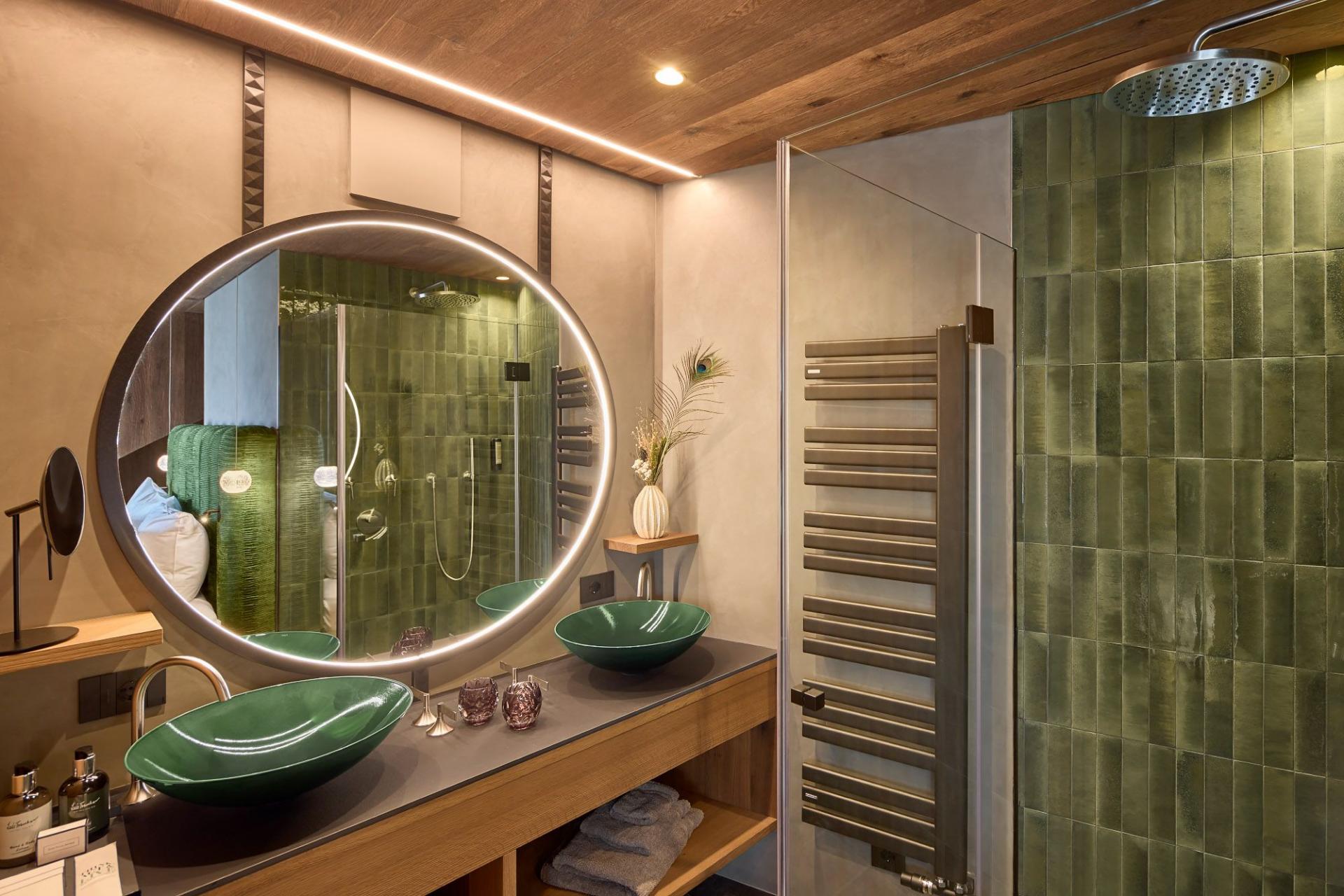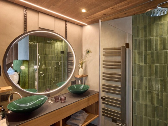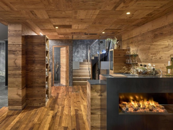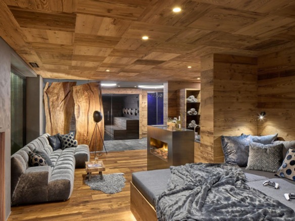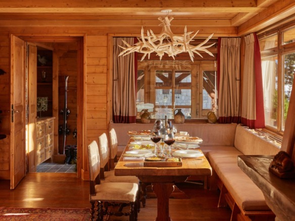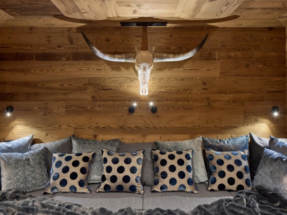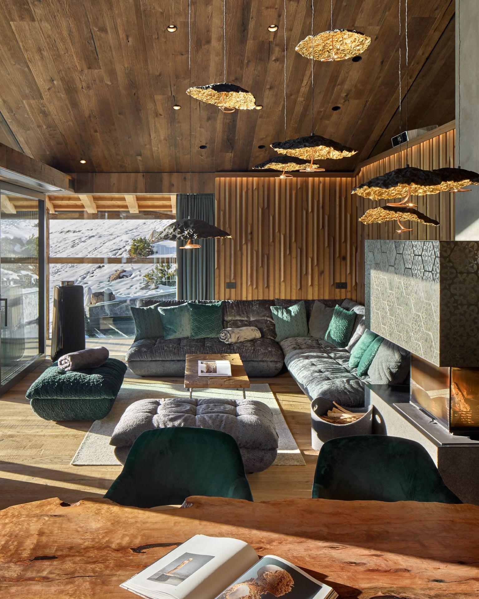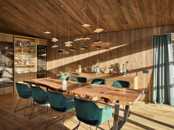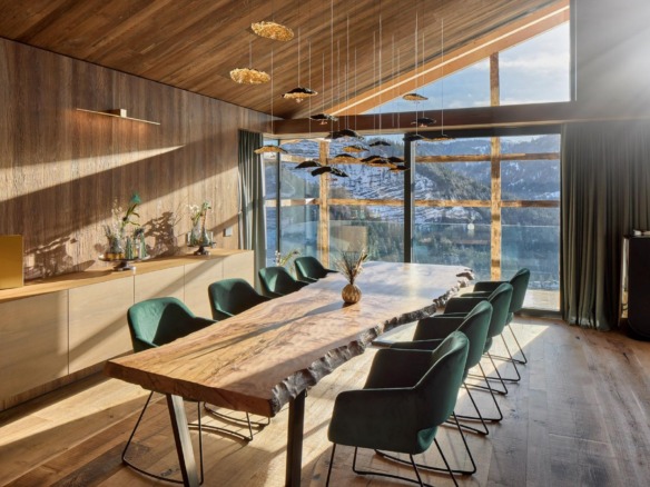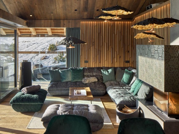 Inside, Chalet Vilaiet features warm, modern alpine design with high ceilings and expansive windows that frame panoramic mountain views. The first-floor living area sets the tone with its elegant fireplace, spacious dining table, and terrace access—perfect for soaking in the scenery with a glass in hand. After dinner, the cosy sofa lounge invites you to unwind in comfort.
