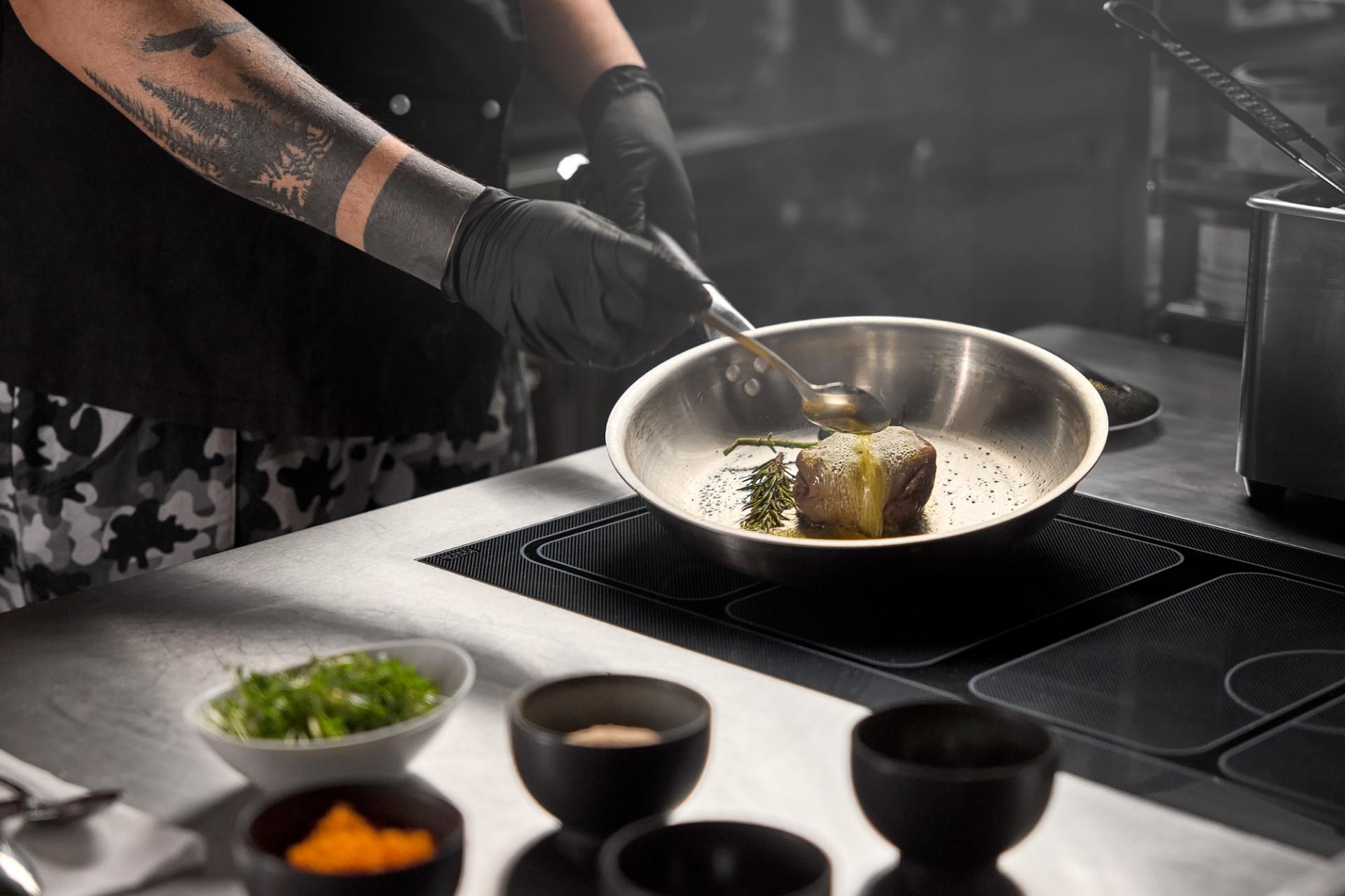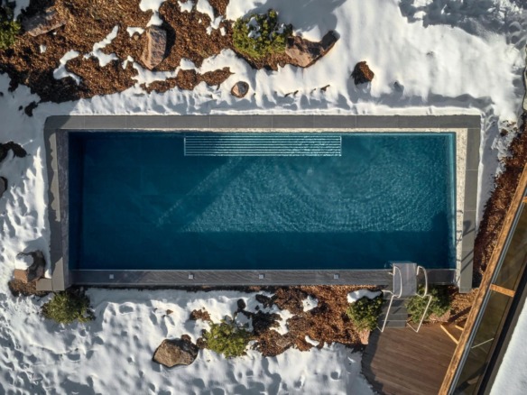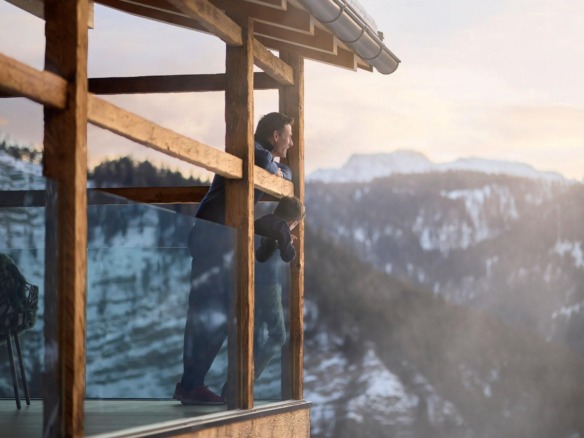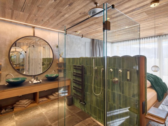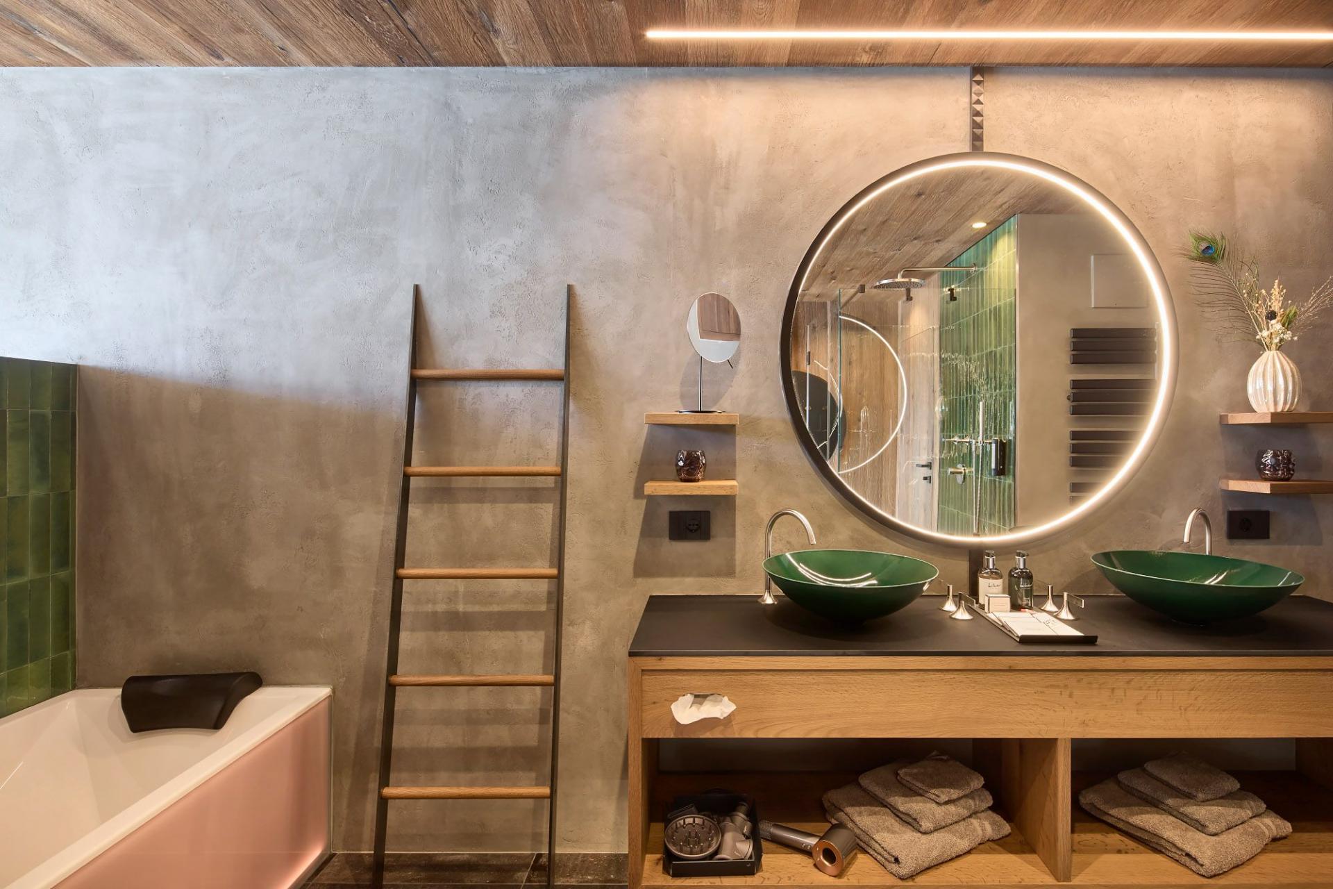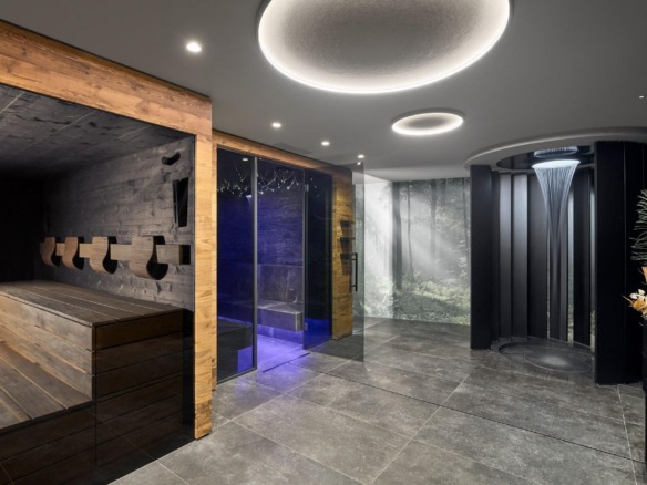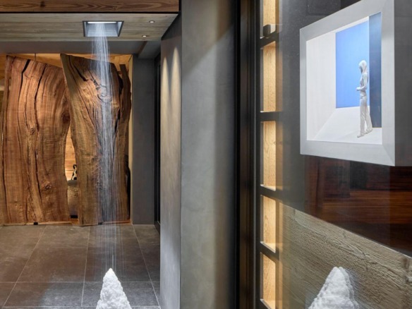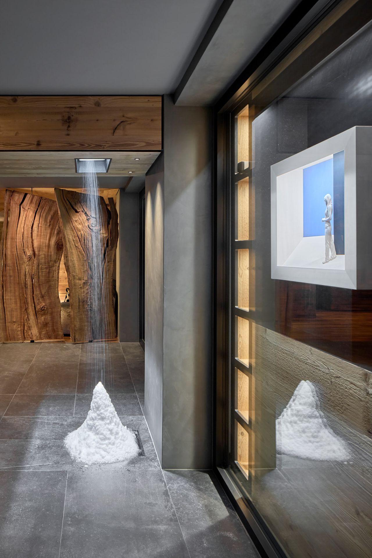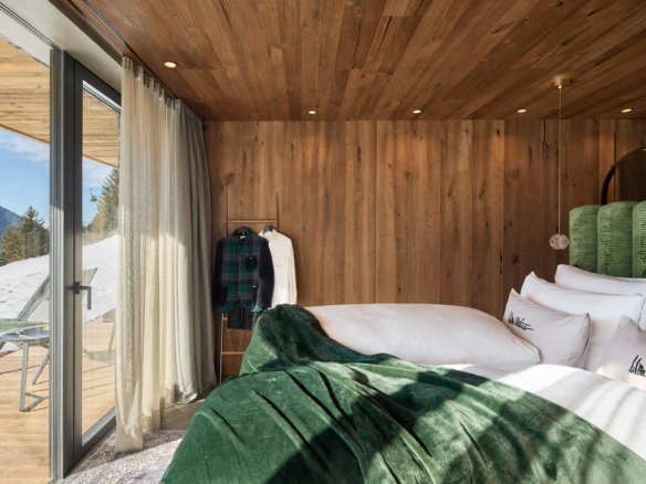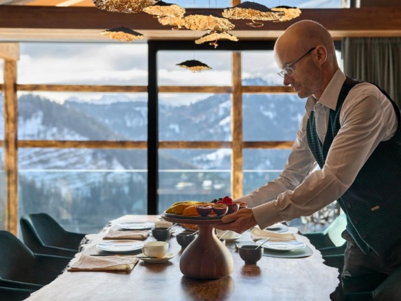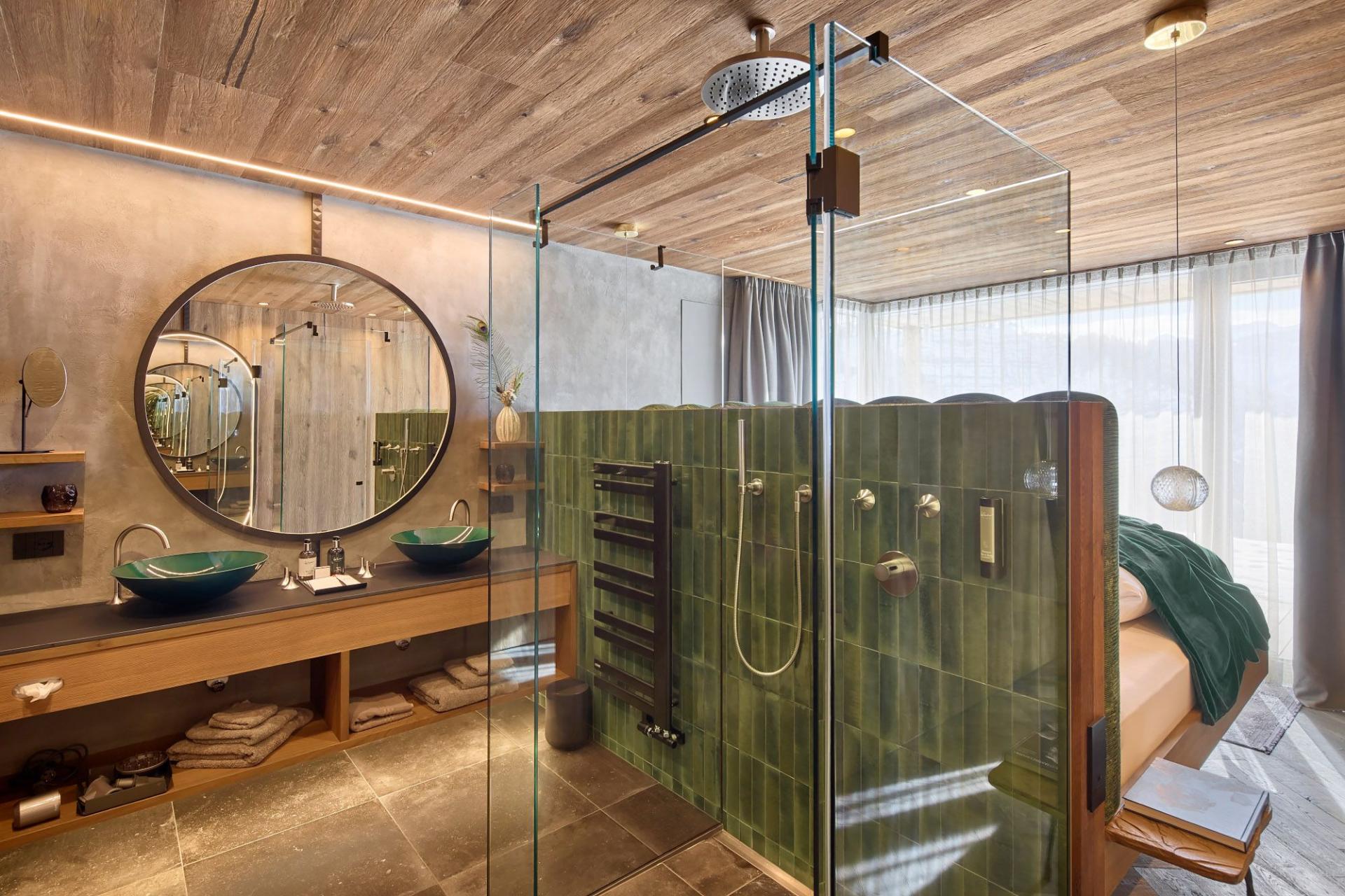 Inside, Chalet Vilaiet features warm, modern alpine design with high ceilings and expansive windows that frame panoramic mountain views. The first-floor living area sets the tone with its elegant fireplace, spacious dining table, and terrace access—perfect for soaking in the scenery with a glass in hand. After dinner, the cosy sofa lounge invites you to unwind in comfort.