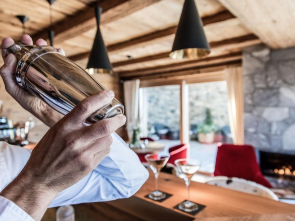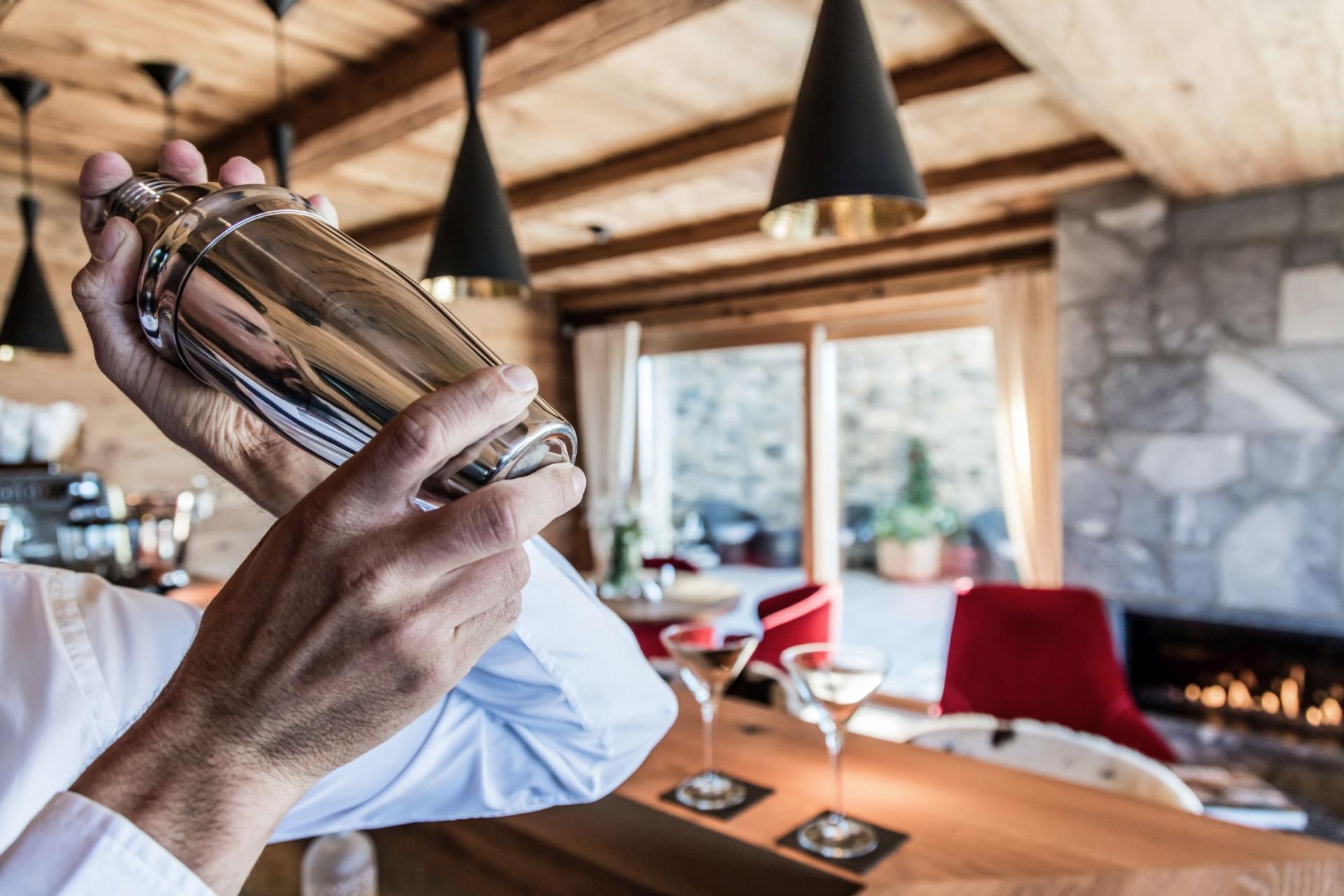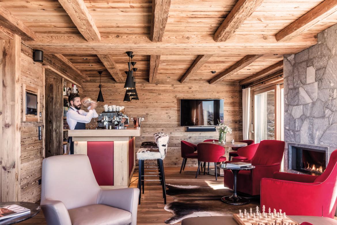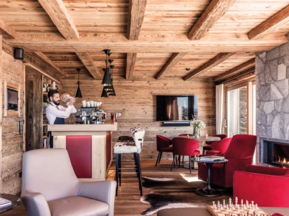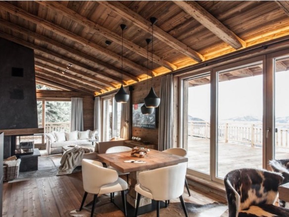 The heart of the lodge is its open-plan living and dining area, where a statement stone fireplace anchors the room and expansive windows frame sweeping mountain vistas. Rich woods and soft textiles bring an inviting warmth, while a sleek bar and a long timber dining table set the stage for evenings of fine wine and gourmet cuisine. Outside, a large terrace wraps around the lodge—perfect for gathering around the firepit as the alpine light fades into night.