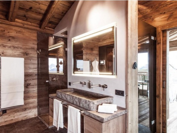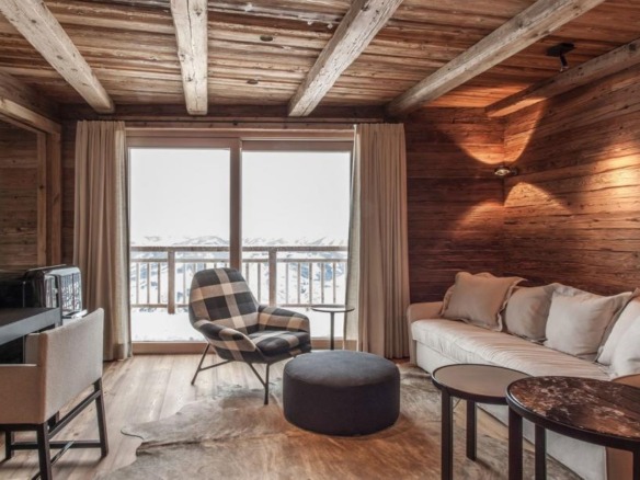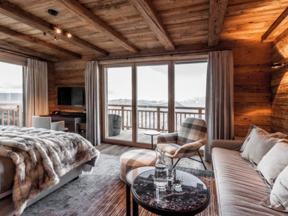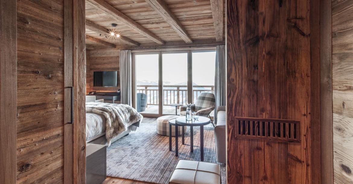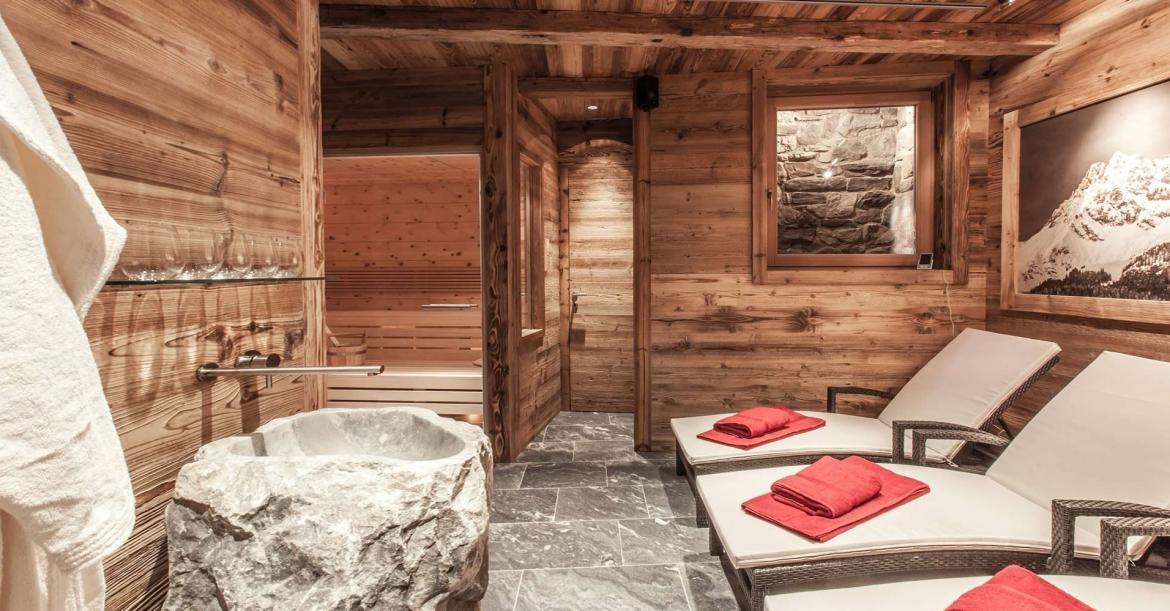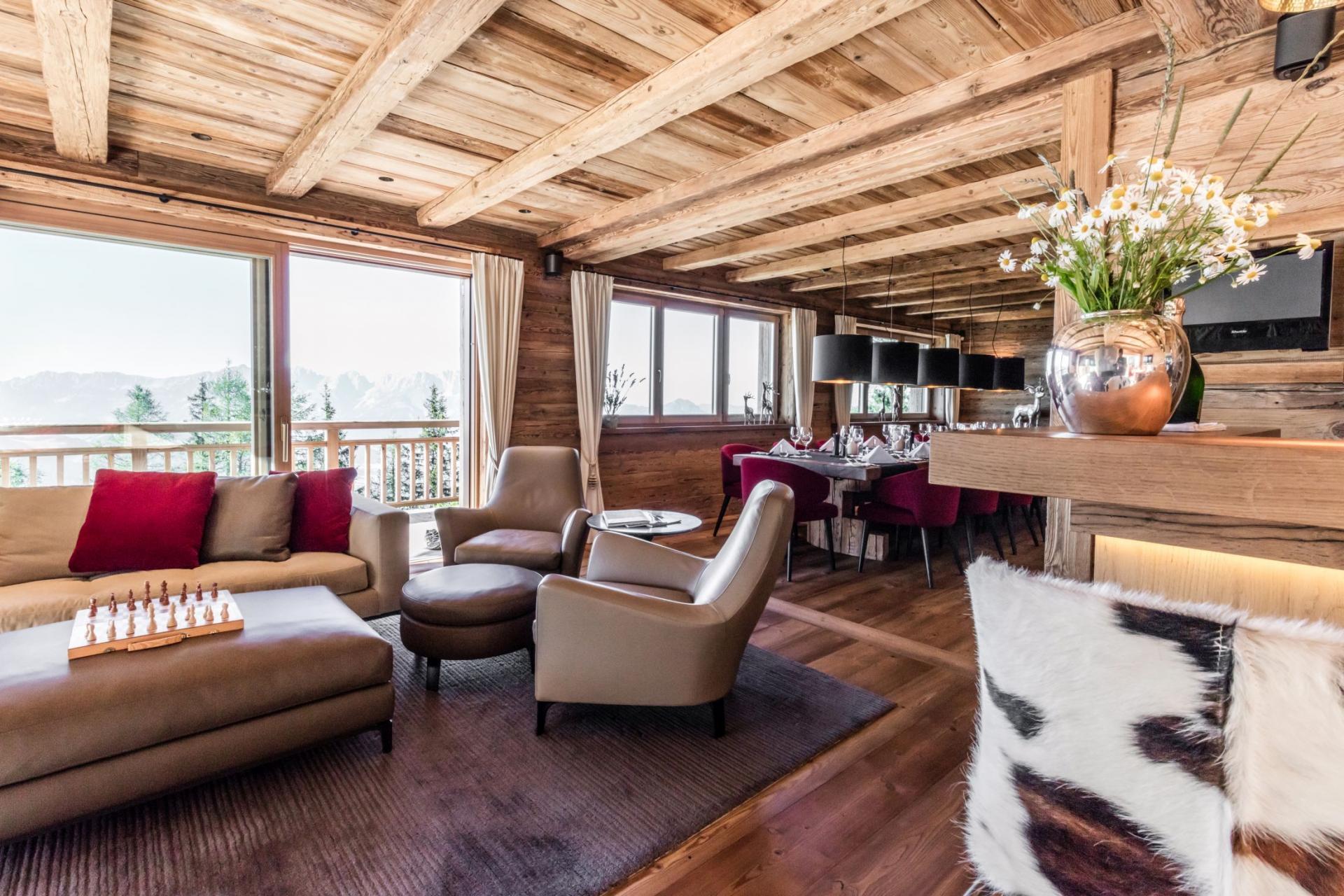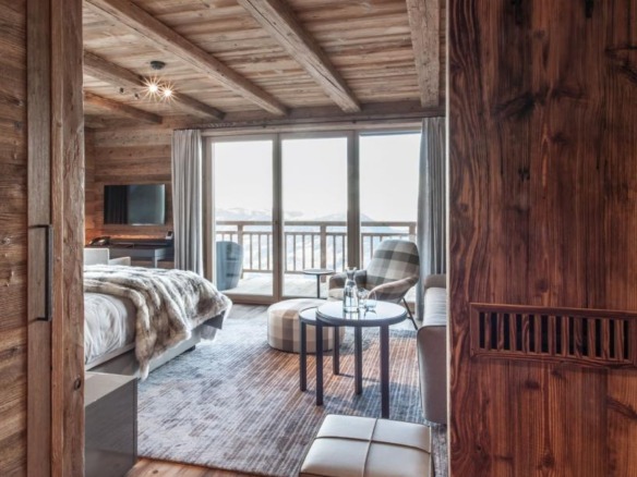 1 x Master double bedroom with open-plan living/dining/sleeping area, separate kitchen and wine storage, fireplace, private terrace access, freestanding bathtub and en-suite bathroom with private spa area including steam bath, sauna and wellness shower (Suite Hahnenkamm)