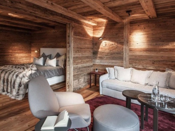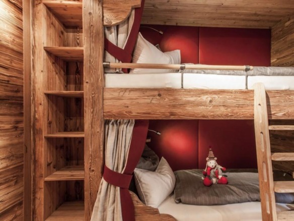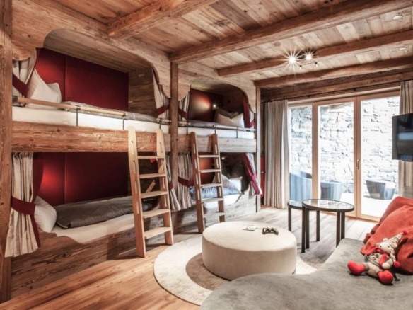 Three further double suites are equally generous in size and comfort, each with its own lounge area and en-suite bathroom featuring a whirlpool tub. A charming bunk room completes the collection, sleeping four in full-size beds and designed for both adults and children with ease.