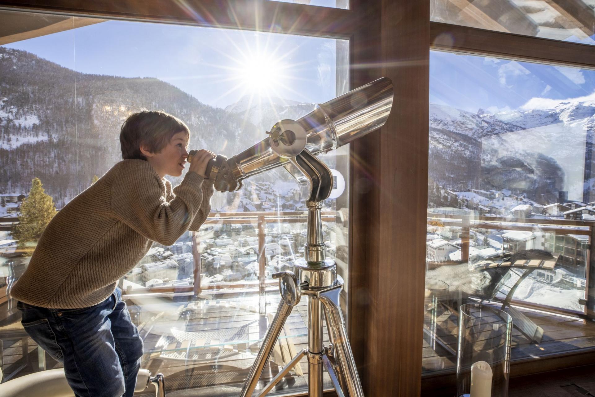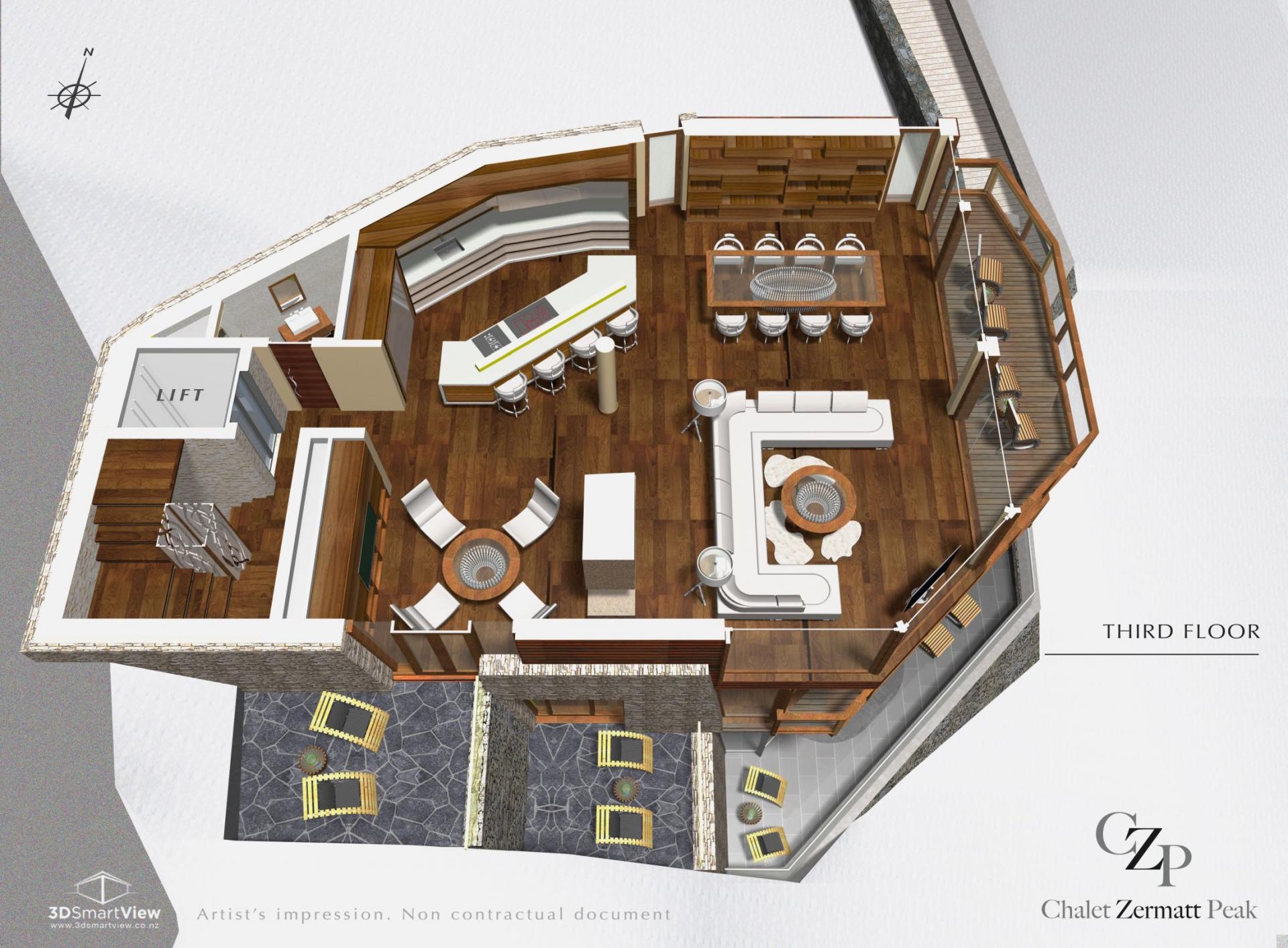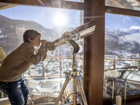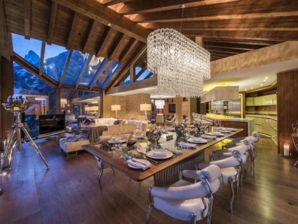 The exterior showcases the perfect harmony of traditional stone and wood craftsmanship with sleek contemporary architecture, creating an inspiring and stylish retreat. The heart of the chalet lies on the second floor, where spacious living areas unfold in an open-plan layout designed to maximize the stunning mountain views. A plush, wraparound lounge invites you to relax while gazing at the Matterhorn through towering windows that extend into a glass-roofed vaulted ceiling. The adjacent state-of-the-art kitchen and elegant dining area set the stage for exquisite gourmet meals, illuminated by a striking chandelier. A cozy reading library, positioned opposite the glowing fireplace, offers a serene sanctuary, while balconies on every floor provide endless opportunities to soak in the scenic splendor of Zermatt’s ski resort.